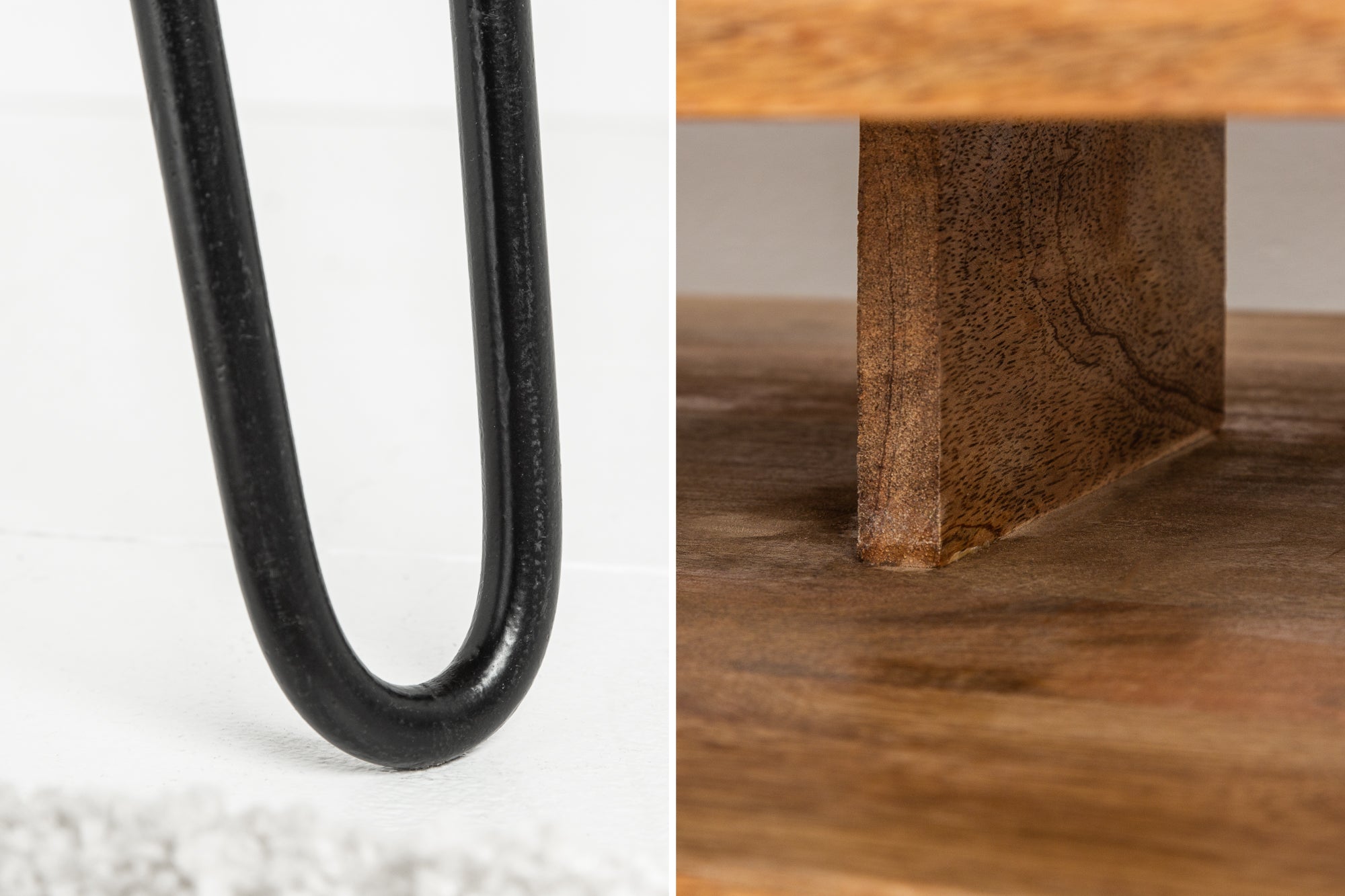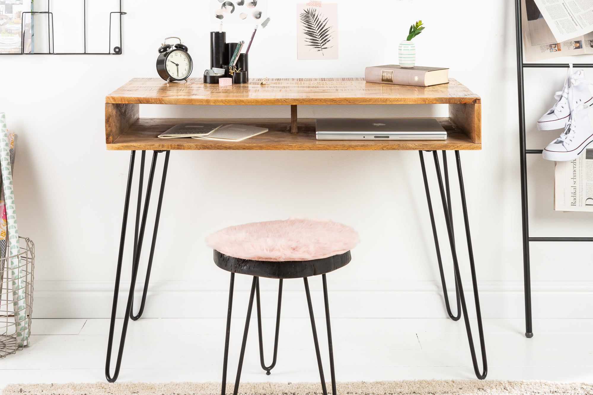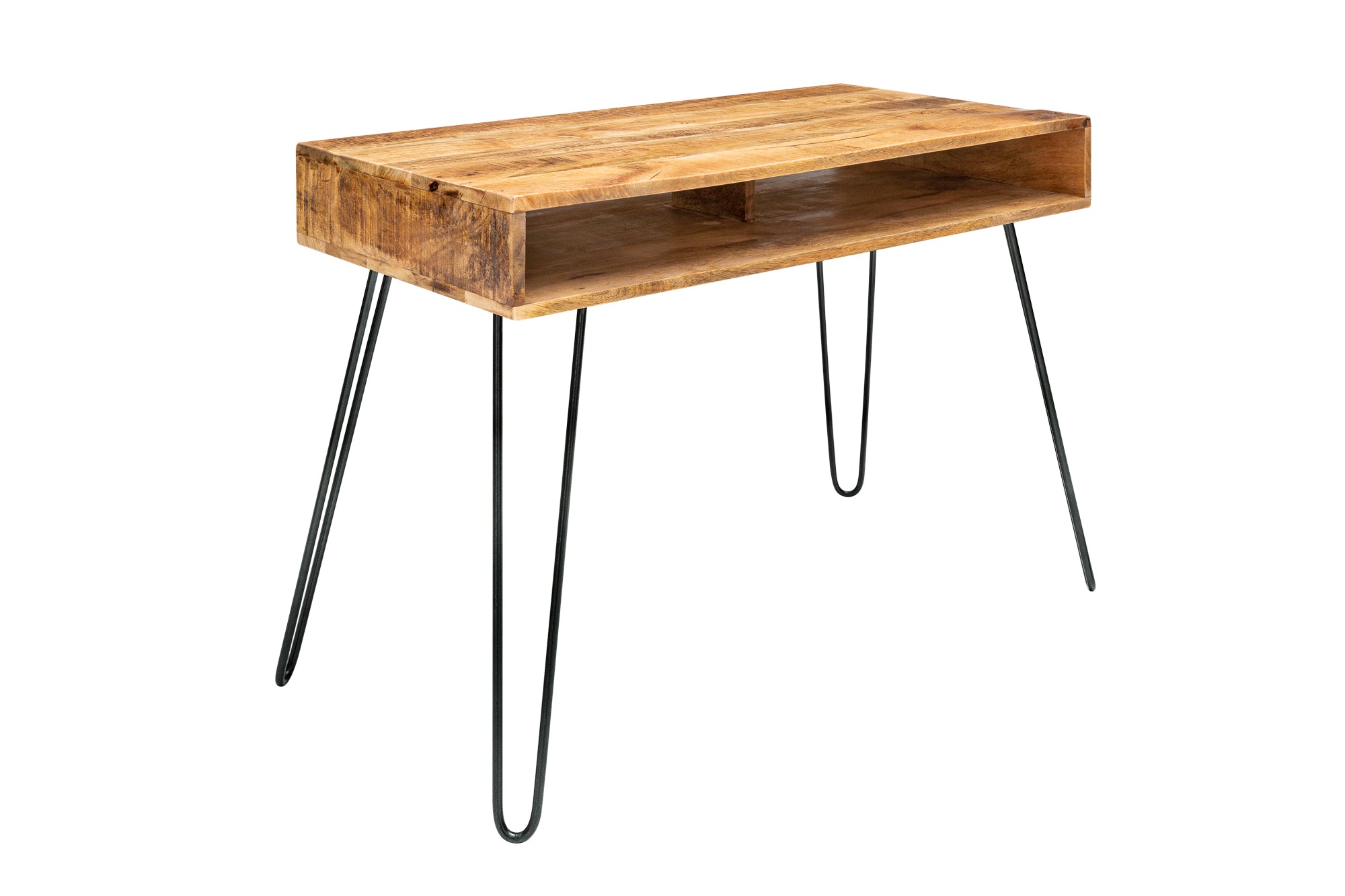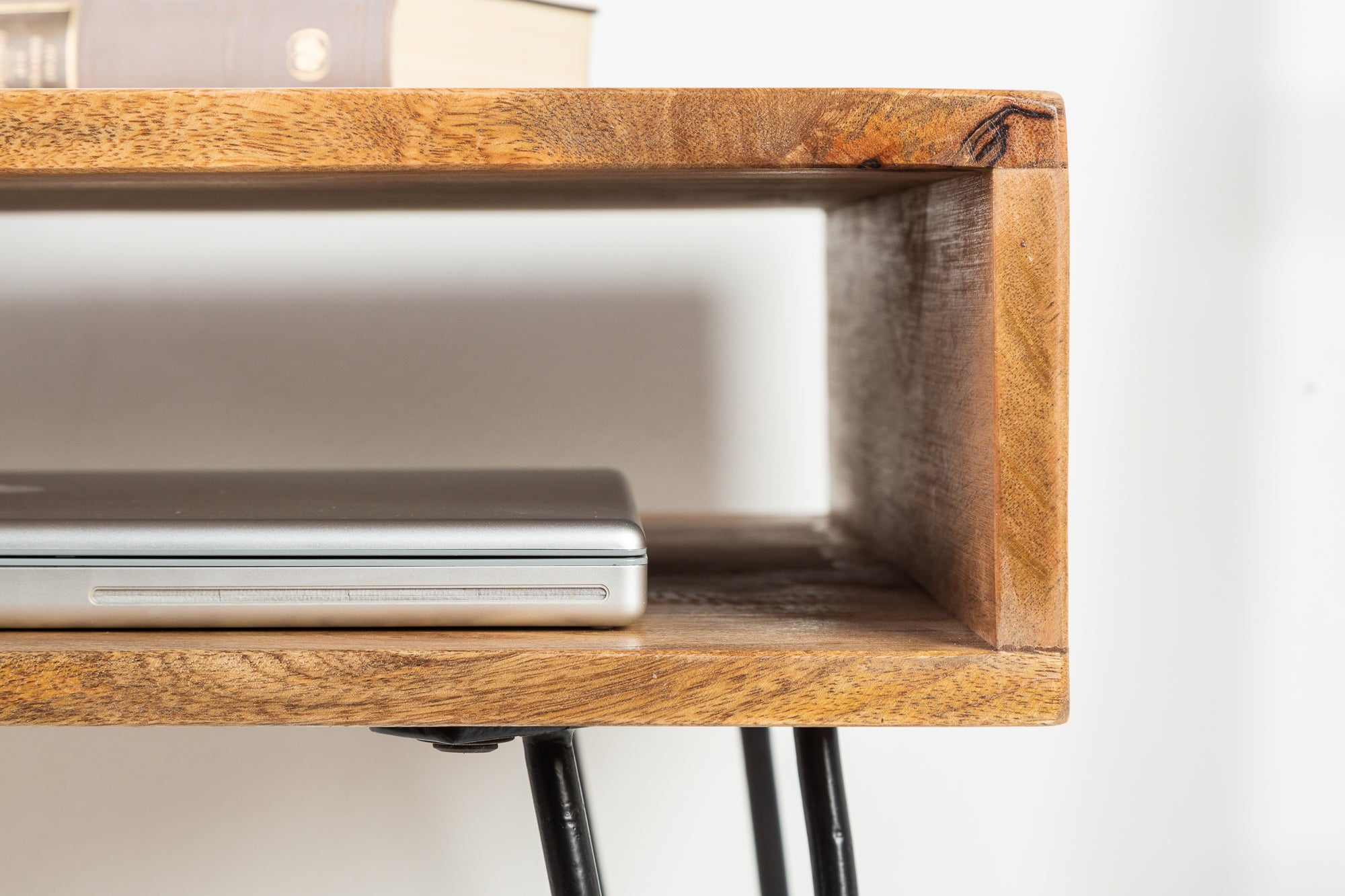 Nowoczesne biurko łączące naturalne drewno z industrialną metalową podstawą. Blat wykonany jest z litego drewna mango w naturalnym wykończeniu, które podkreśla piękne usłojenie oraz nadaje meblowi ciepły i elegancki charakter. Drewno mango jest trwałym materiałem, dzięki czemu biurko doskonale sprawdzi się zarówno w domowym biurze, jak i w pokoju młodzieżowym.