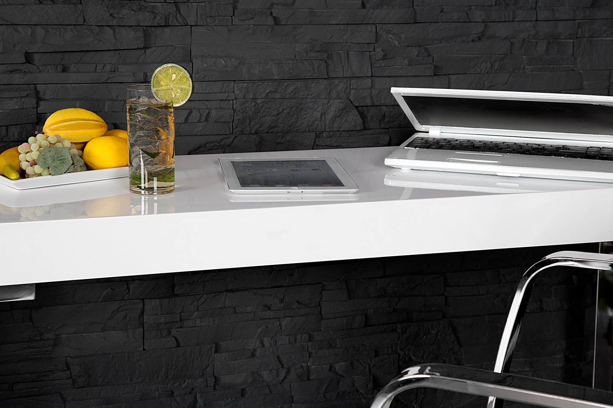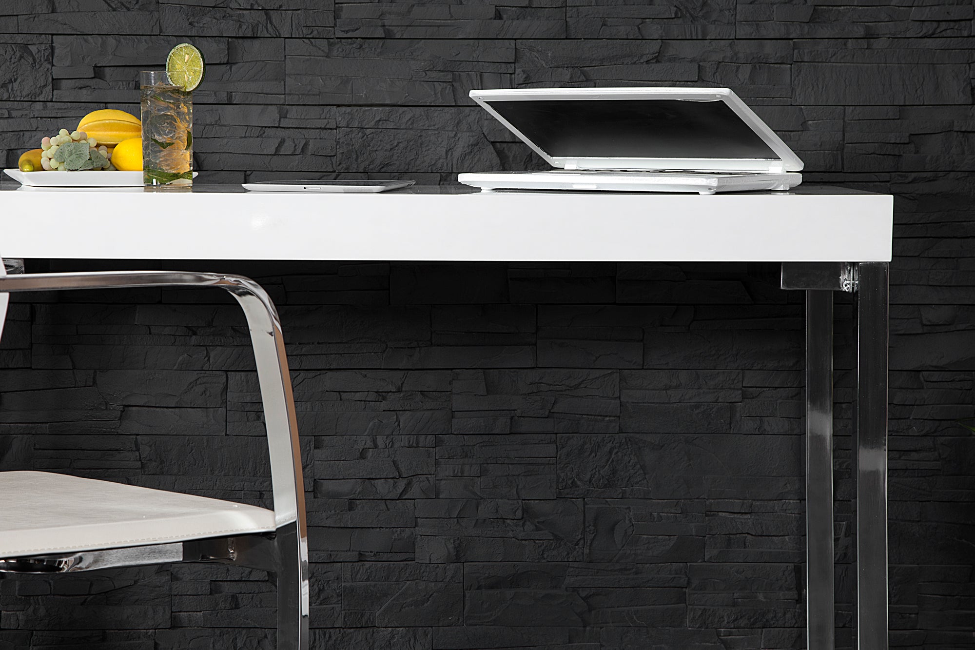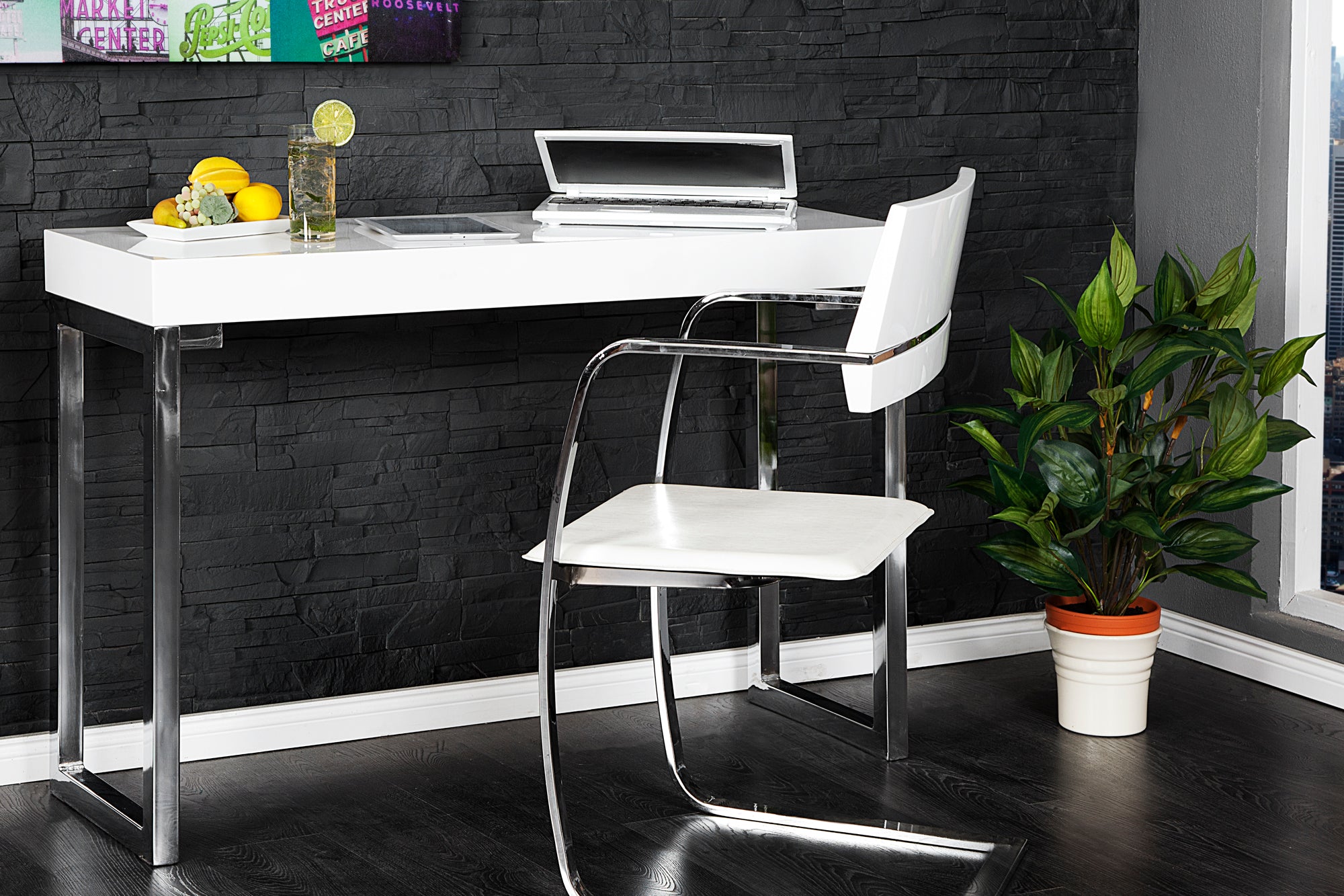 Stabilna konstrukcja z chromowanego metalu podkreśla nowoczesny charakter biurka i zapewnia trwałość. Dzięki niewielkiej głębokości 40 cm model idealnie sprawdzi się jako kompaktowe stanowisko pracy, konsola lub stolik do laptopa w salonie, sypialni lub biurze.