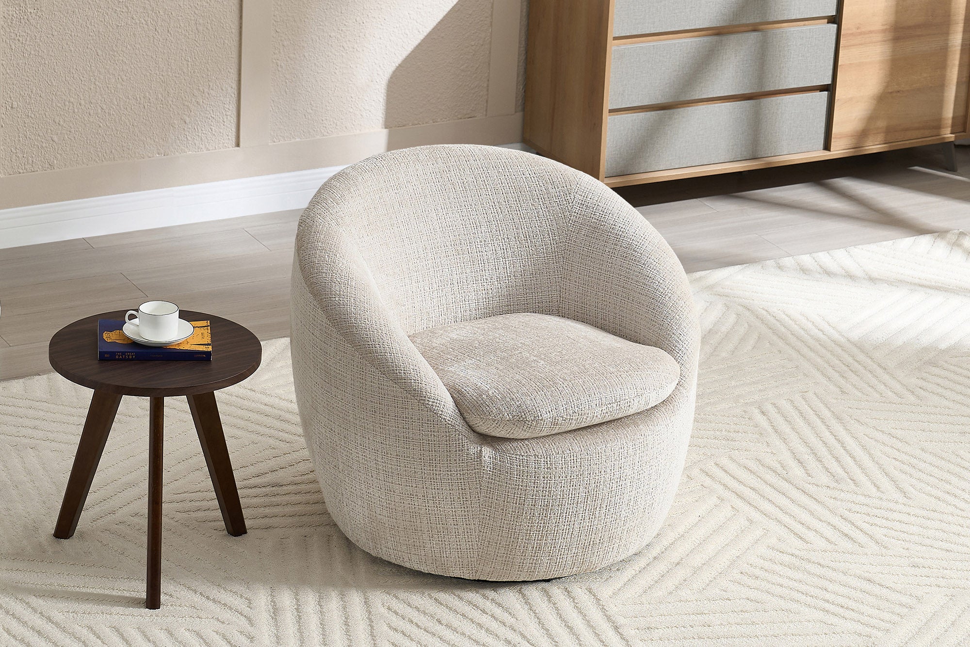 Nowoczesny fotel wypoczynkowy o miękkiej, zaokrąglonej formie, który łączy wygodę z funkcjonalnością. Model ALPINE w beżowej tkaninie strukturalnej to bardzo uniwersalna propozycja – pasuje do jasnych, eleganckich wnętrz oraz stylu nowoczesnego i skandynawskiego.