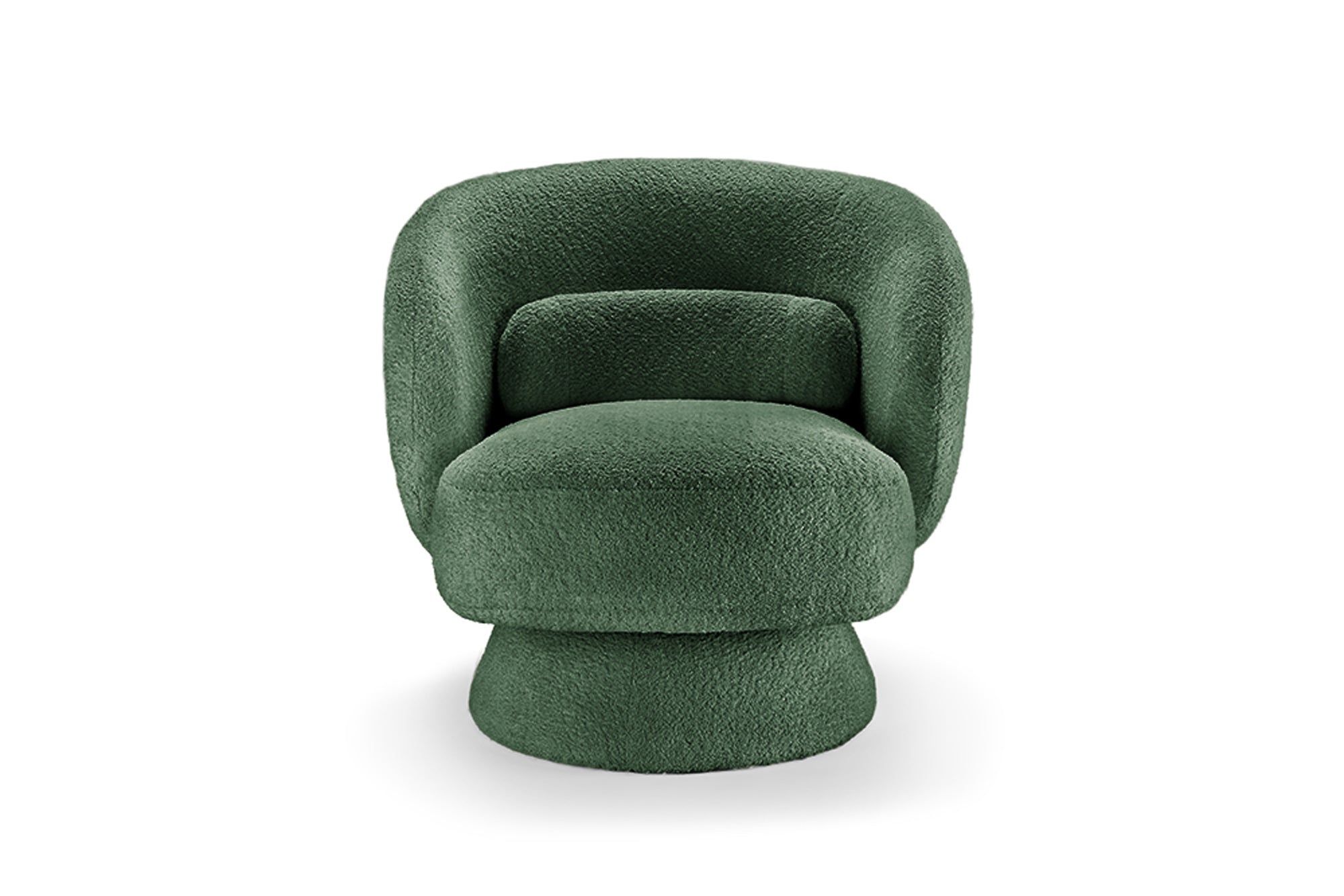 Fotel BOSSA NOVA to stylowy model wypoczynkowy o miękkiej, zaokrąglonej formie, który łączy modny wygląd z praktyczną funkcją obrotu 360°. Zielona tapicerka bouclé nadaje mu przytulny, dekoracyjny charakter i sprawia, że fotel może stać się wyrazistym akcentem w salonie, sypialni, gabinecie lub kąciku relaksu.
