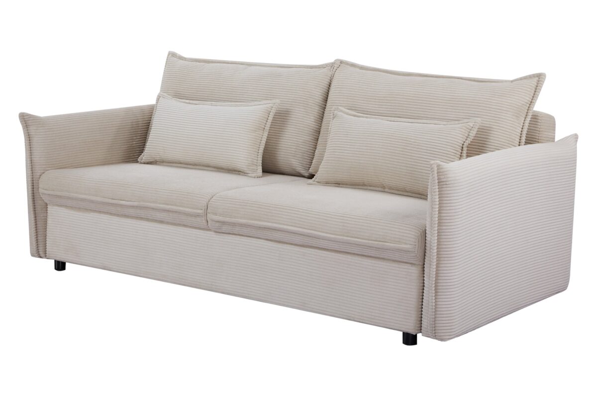 Tapicerka wykonana jest z tkaniny cord (sztruks), która jest miękka, przyjemna w dotyku i dobrze znosi codzienne użytkowanie. Jasny, beżowy kolor wprowadza do wnętrza lekkość i pasuje praktycznie do każdej aranżacji.