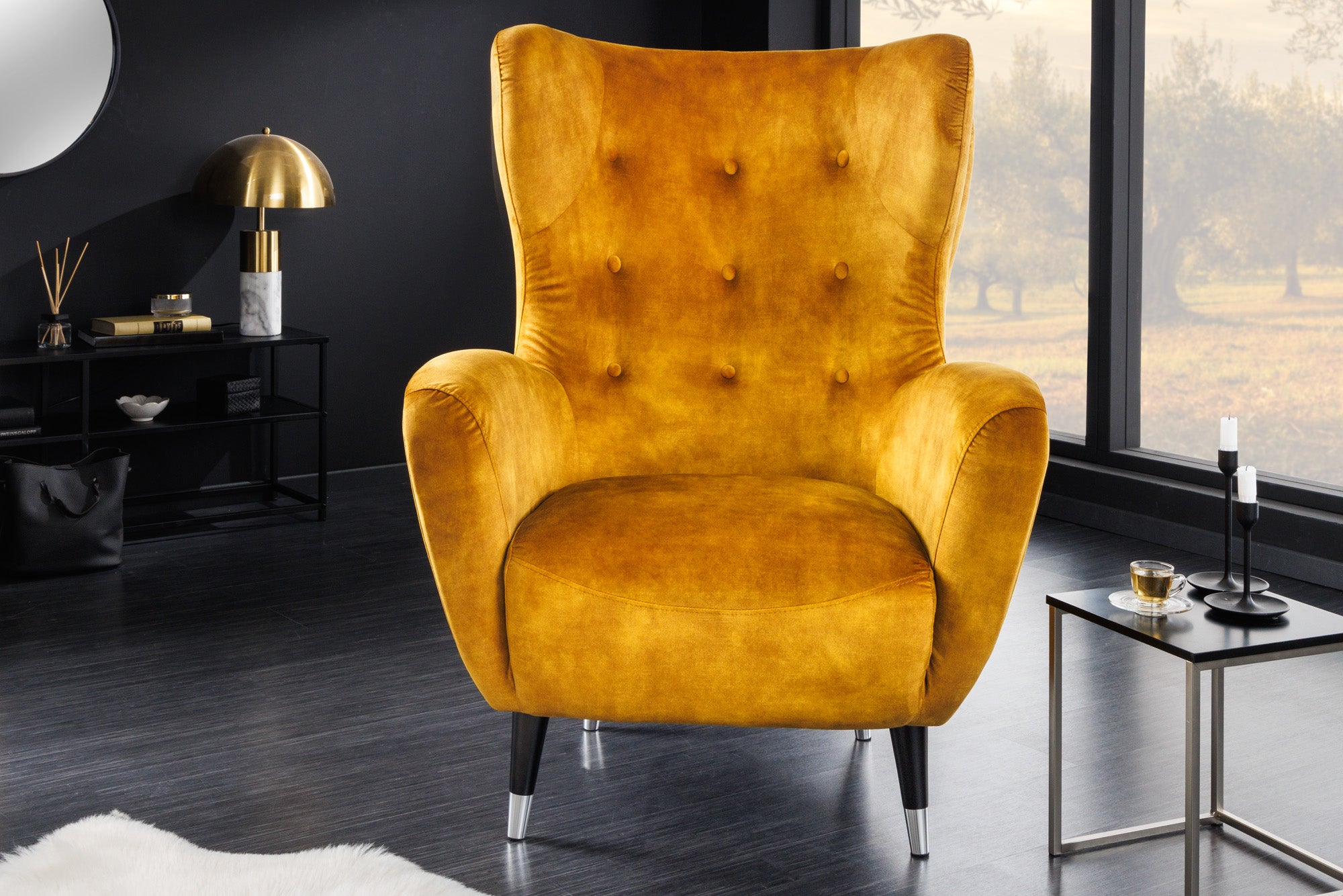 Najbardziej charakterystycznym elementem tego modelu jest wysokie oparcie oraz forma uszaka, która tworzy wygodne miejsce do odpoczynku, czytania książki lub relaksu w salonie. Musztardowy kolor sprawia, że fotel może stać się mocnym akcentem aranżacyjnym w pomieszczeniu, szczególnie we wnętrzach nowoczesnych, retro, glamour lub modern classic.