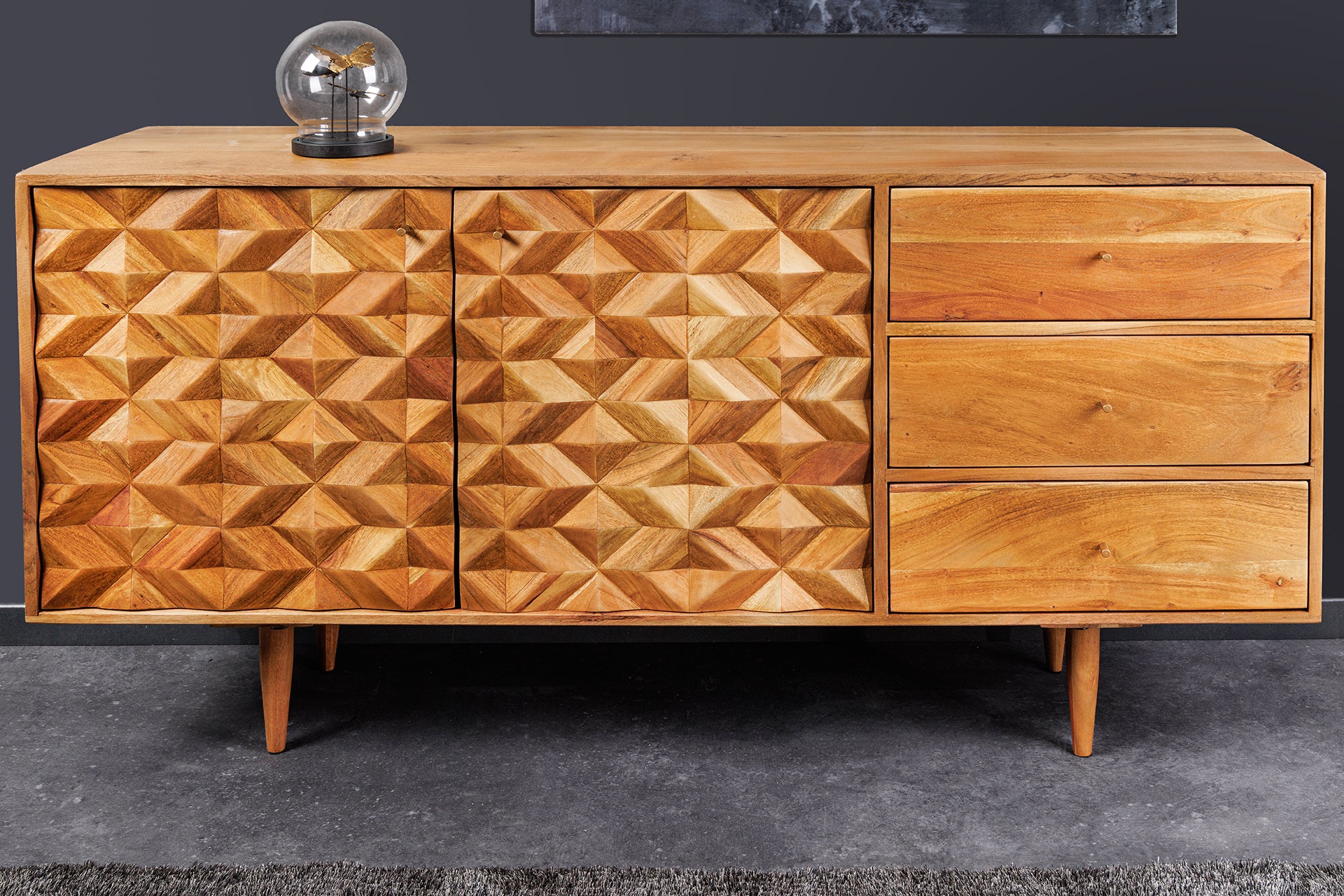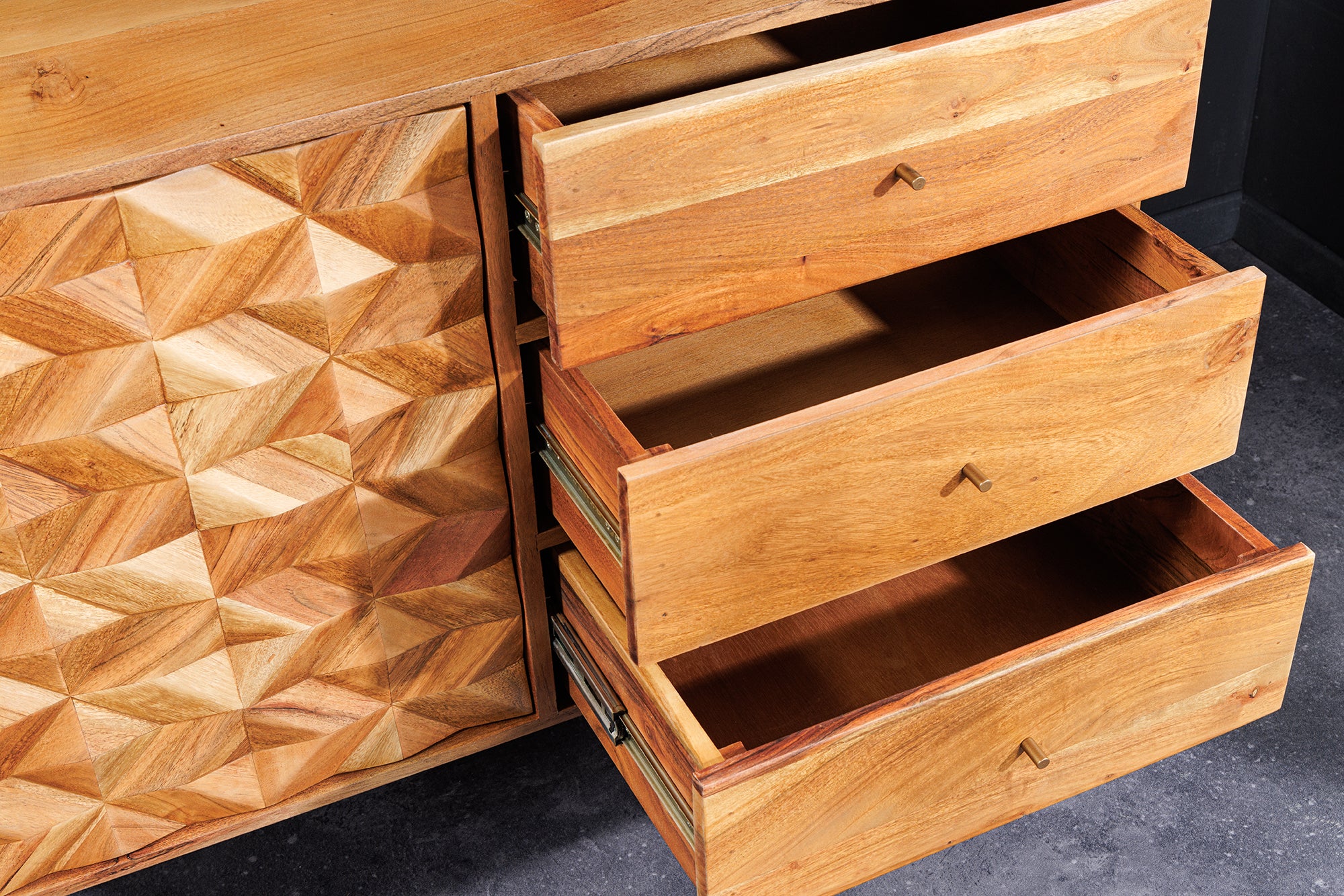Nowoczesna komoda o wyraźnym charakterze retro, wykonana w całości z litego drewna akacji w ciepłym, miodowym odcieniu. Model ALPINE wyróżnia się efektownymi frontami 3D o geometrycznym wzorze, które nadają meblowi unikalny i dekoracyjny wygląd.