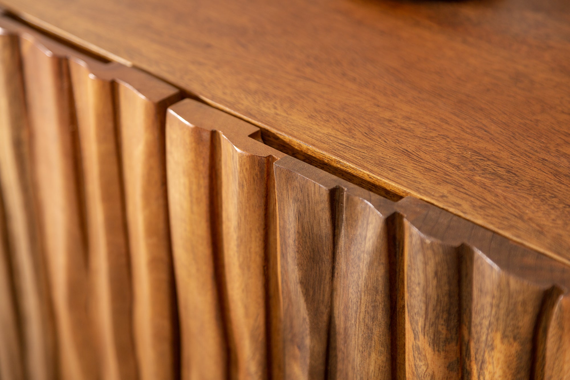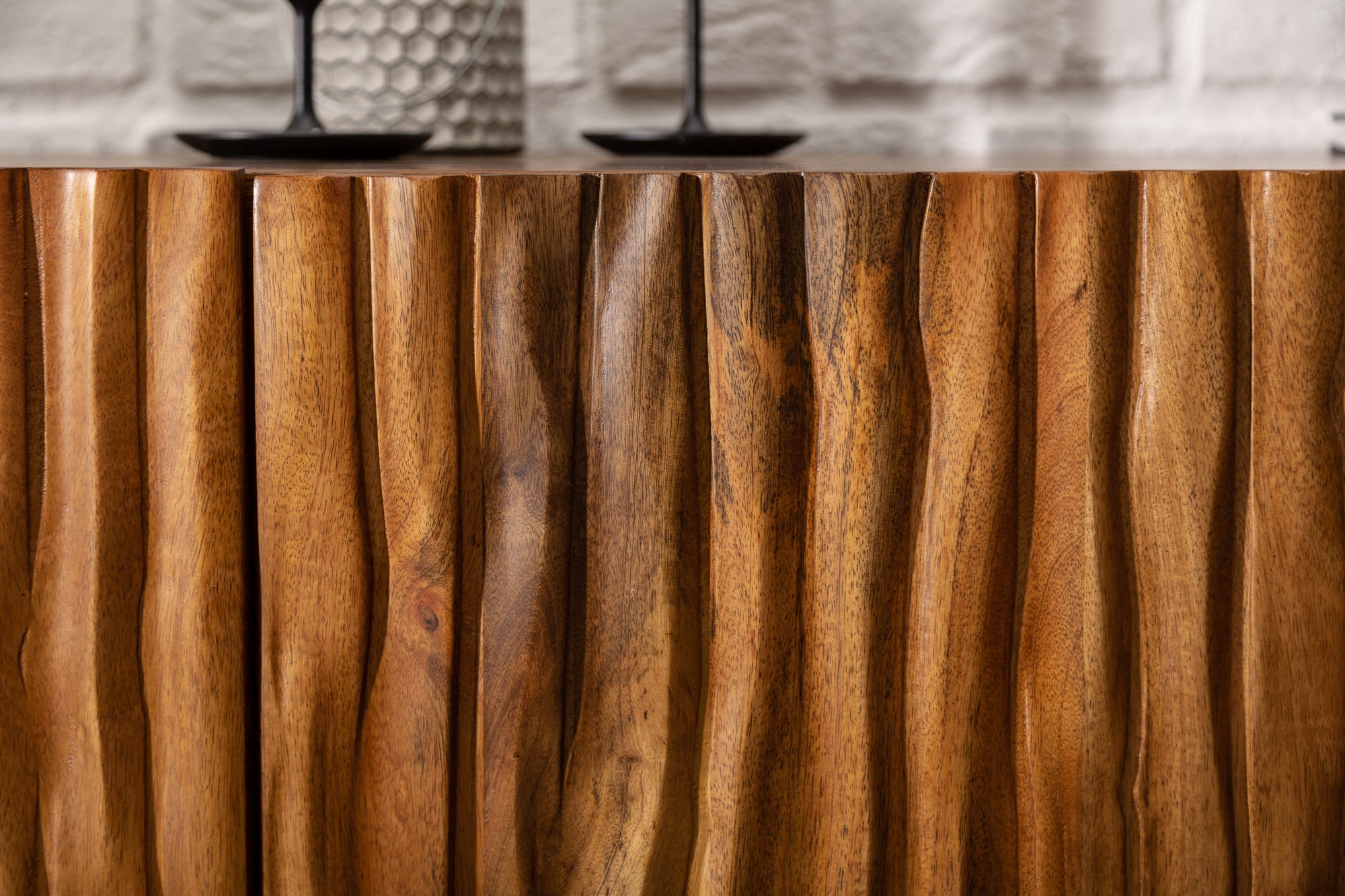 Fronty komody inspirowane są naturalną korą drzewa – nieregularna, trójwymiarowa faktura nadaje meblowi wyjątkowy wygląd i sprawia, że światło ciekawie rozkłada się na powierzchni. Każdy egzemplarz jest unikalny, ponieważ drewno posiada naturalne różnice kolorystyczne, sęki i drobne niedoskonałości wynikające z jego charakteru.