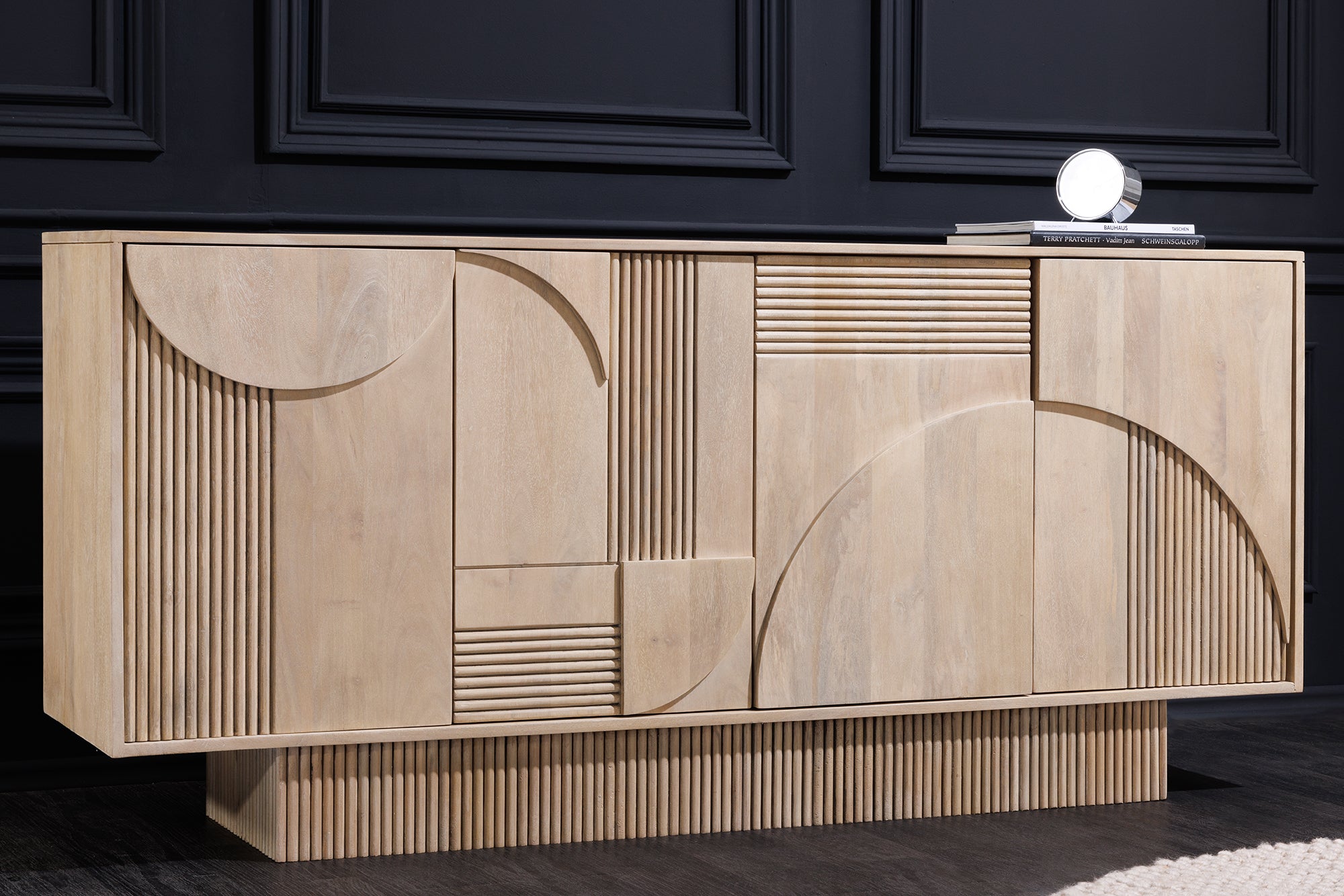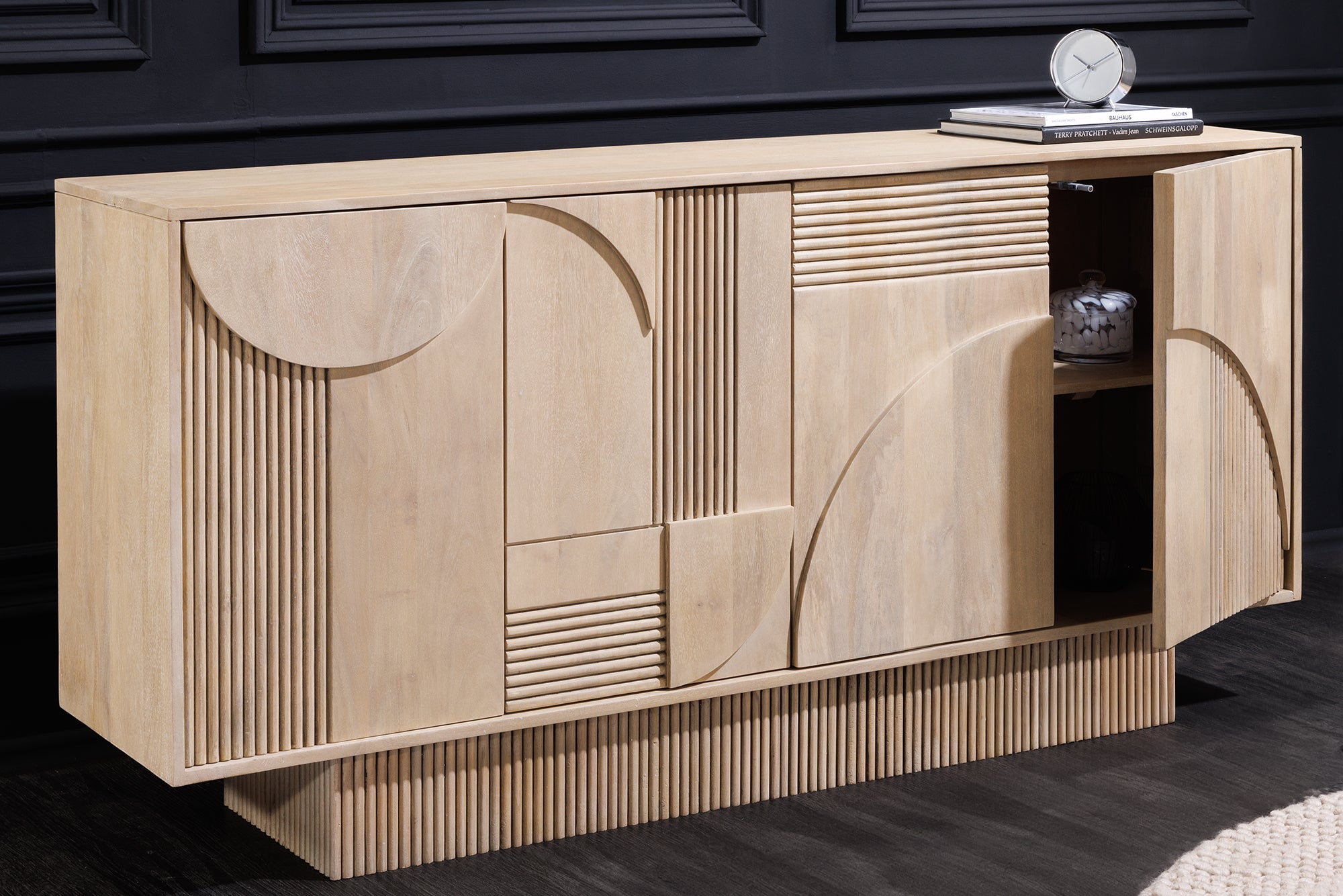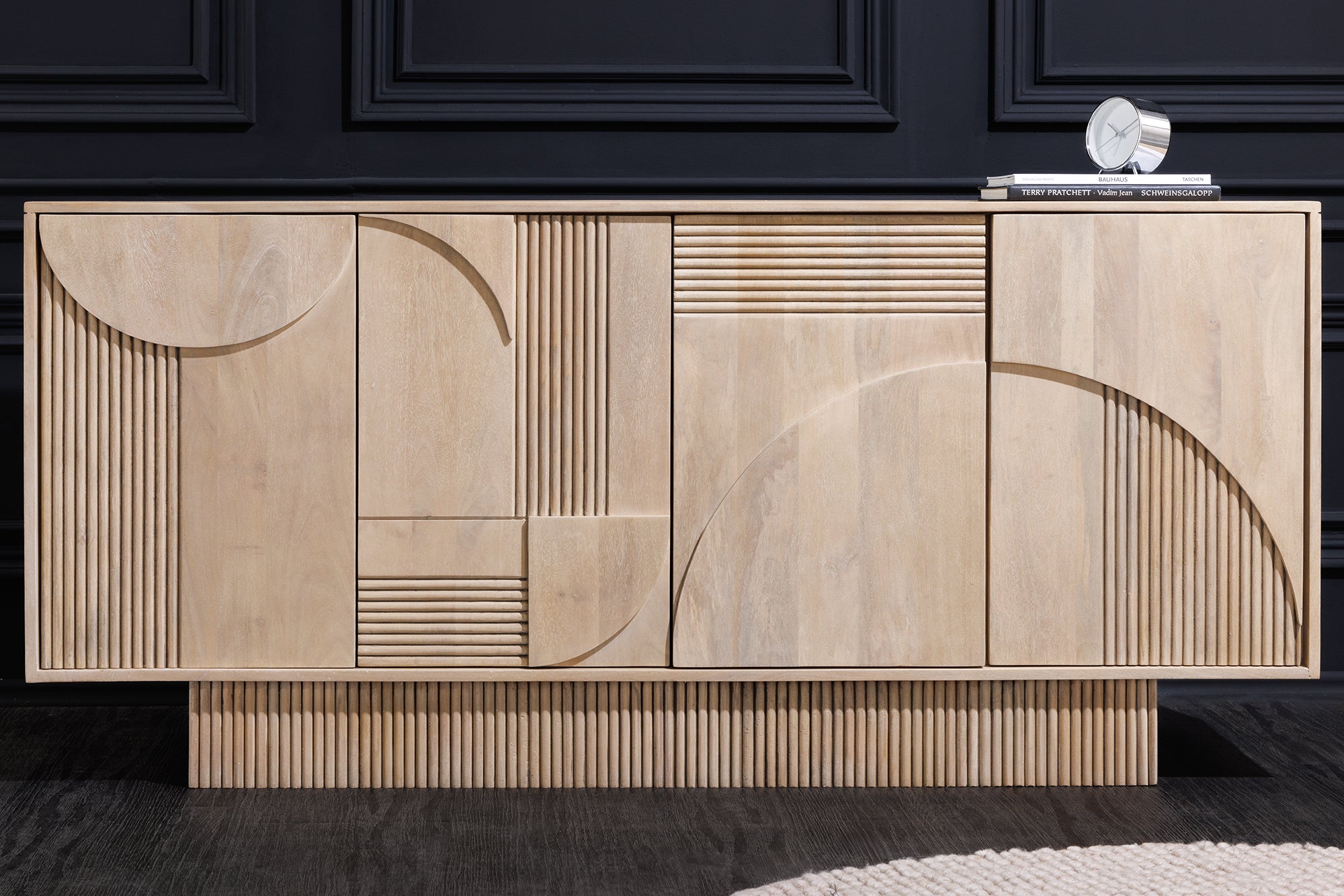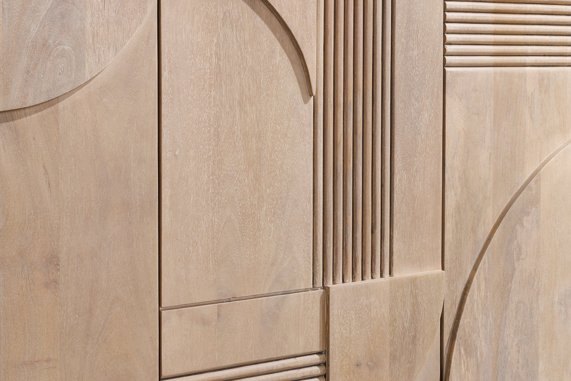 Nowoczesna komoda o szerokości 170 cm, wykonana z litego drewna mango w wykończeniu bielonym (whitewashed). Model ART DECO wyróżnia się efektownymi frontami 3D o geometrycznym wzorze, które nadają meblowi elegancki i jednocześnie designerski charakter.