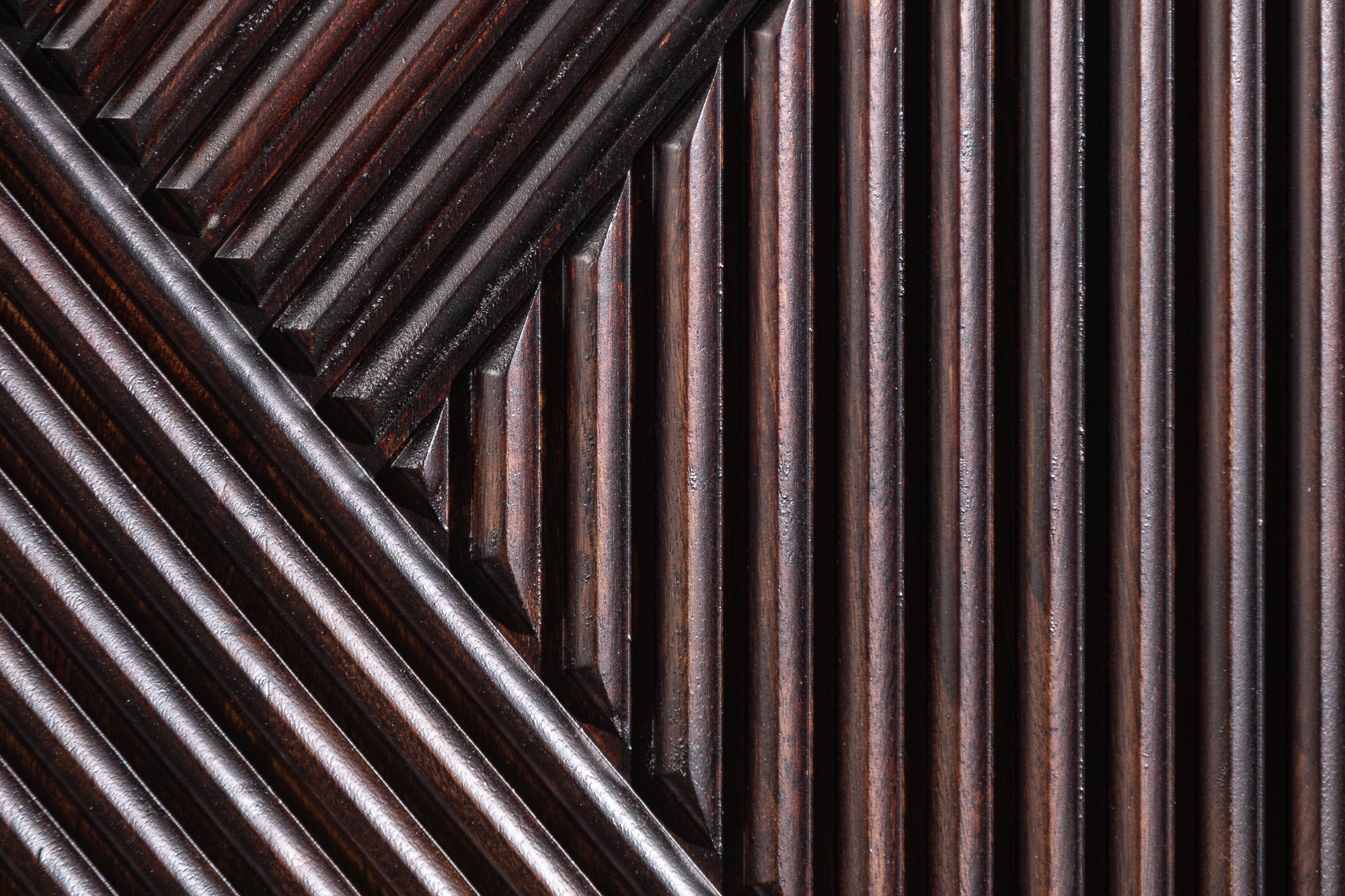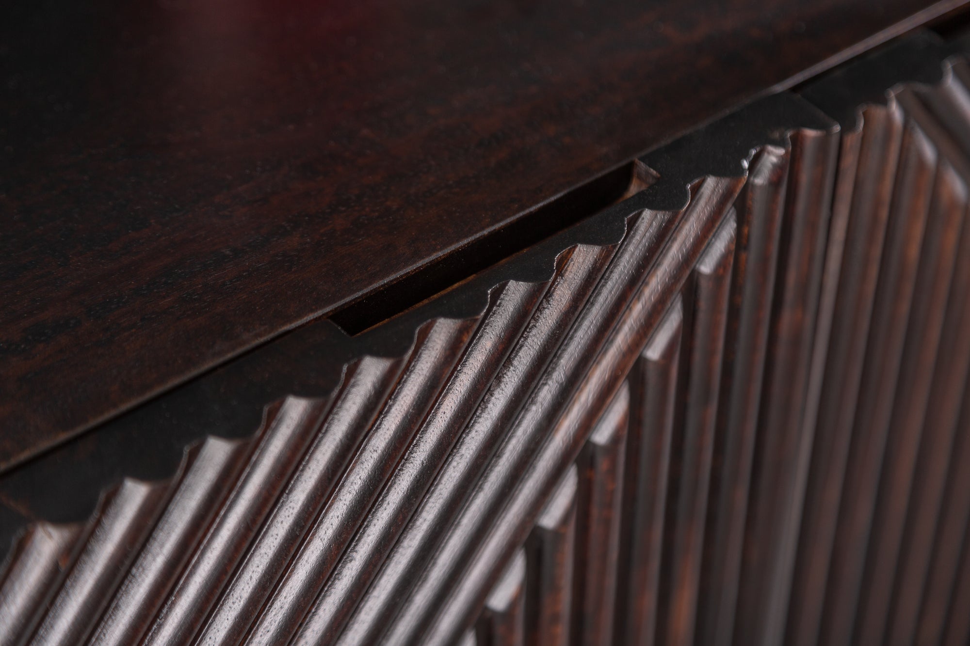 Fronty tworzą kompozycję pionowych, nieregularnych elementów, które zostały artystycznie zestawione w dynamiczny wzór. Dzięki temu powierzchnia mebla zyskuje głębię i przyciąga uwagę, a całość wygląda nowocześnie, ale z lekką nutą stylu retro. Każdy egzemplarz jest niepowtarzalny – drewno posiada naturalne sęki, przebarwienia i różnice w strukturze.
