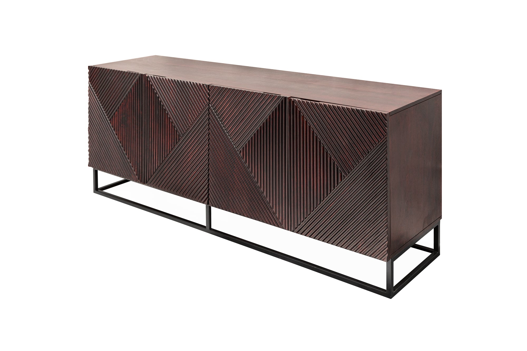 Komoda CREATIVO 177 cm to wyrazisty mebel o unikalnym, dekoracyjnym froncie, który wyróżnia się na tle klasycznych brył. Wykonana z litego drewna mango w ciepłym, brązowo-bordowym odcieniu, łączy naturalność materiału z nowoczesnym podejściem do designu.