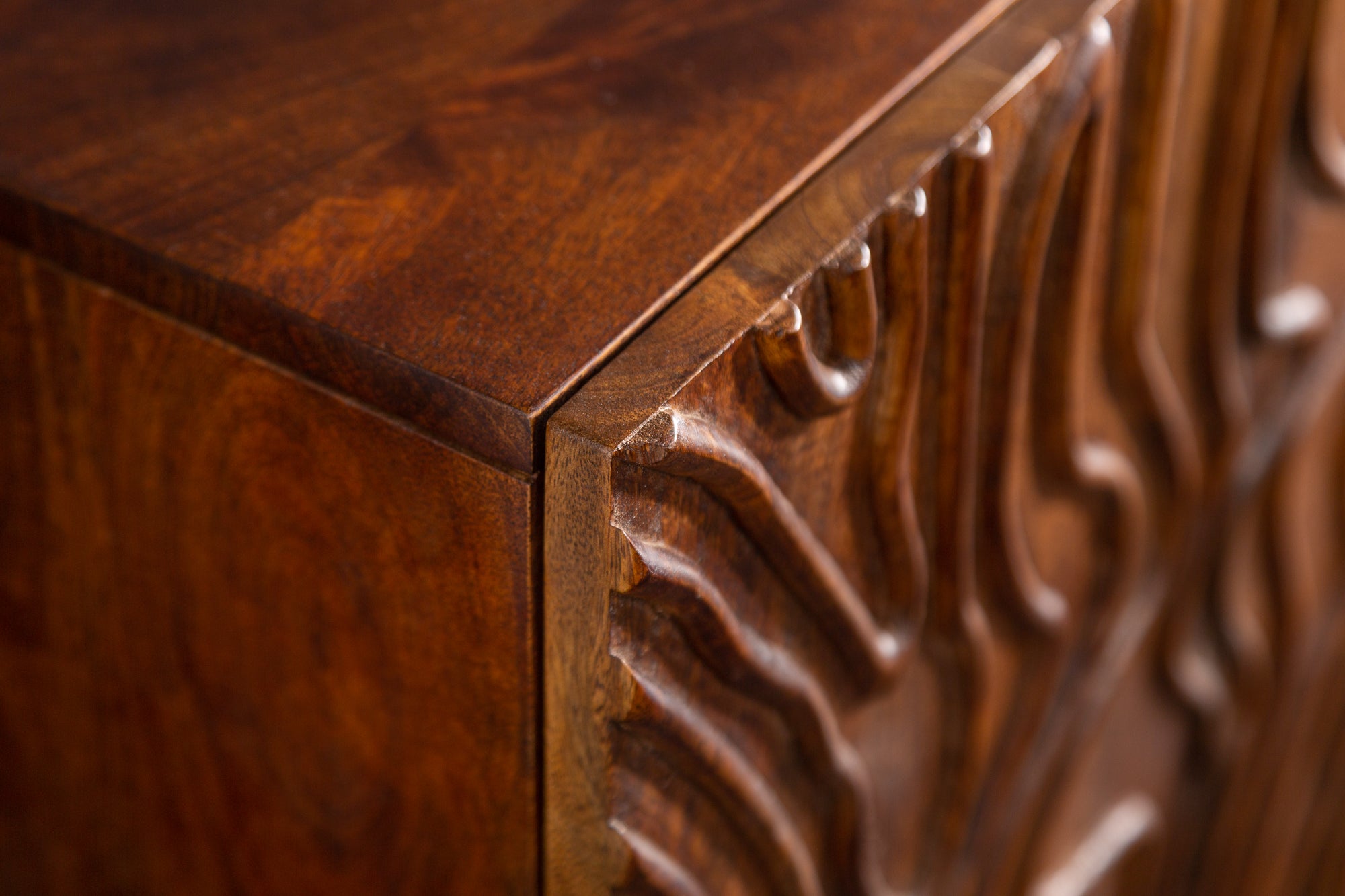 Fronty komody wyróżniają się trójwymiarowym, falującym wzorem inspirowanym naturalnymi formami. Dzięki temu powierzchnia mebla zmienia się w zależności od światła, tworząc ciekawy efekt wizualny. Każdy egzemplarz jest niepowtarzalny – drewno mango posiada naturalne różnice w strukturze i odcieniu.