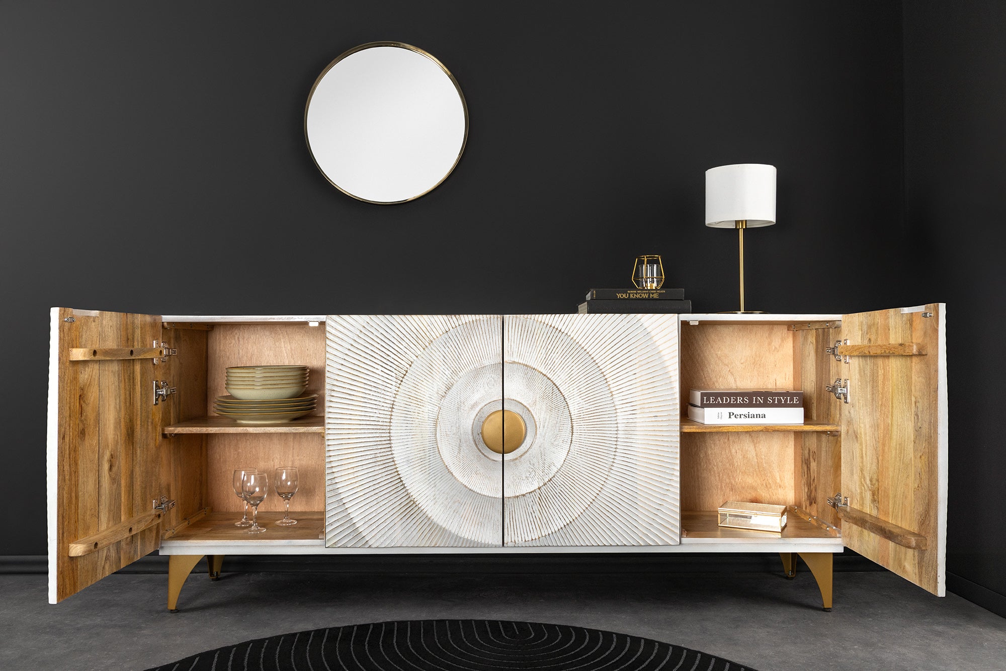 Najbardziej charakterystycznym elementem są fronty z ręcznie wykonanym ornamentem w kolorze złotym. Wzór tworzy efekt trójwymiarowości i nadaje meblowi ekskluzywny, dekoracyjny charakter. Złote uchwyty i podstawa spójnie uzupełniają całość.