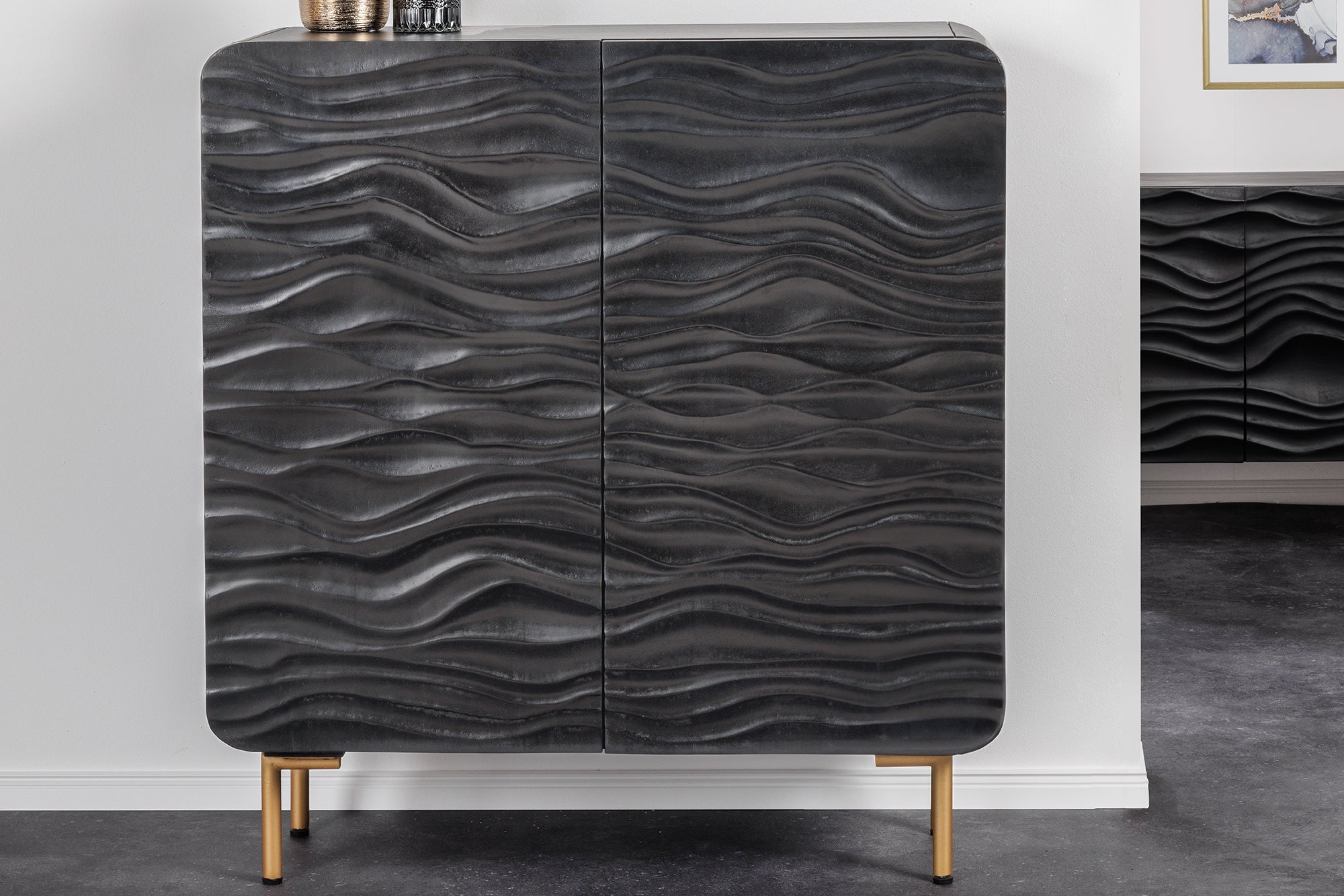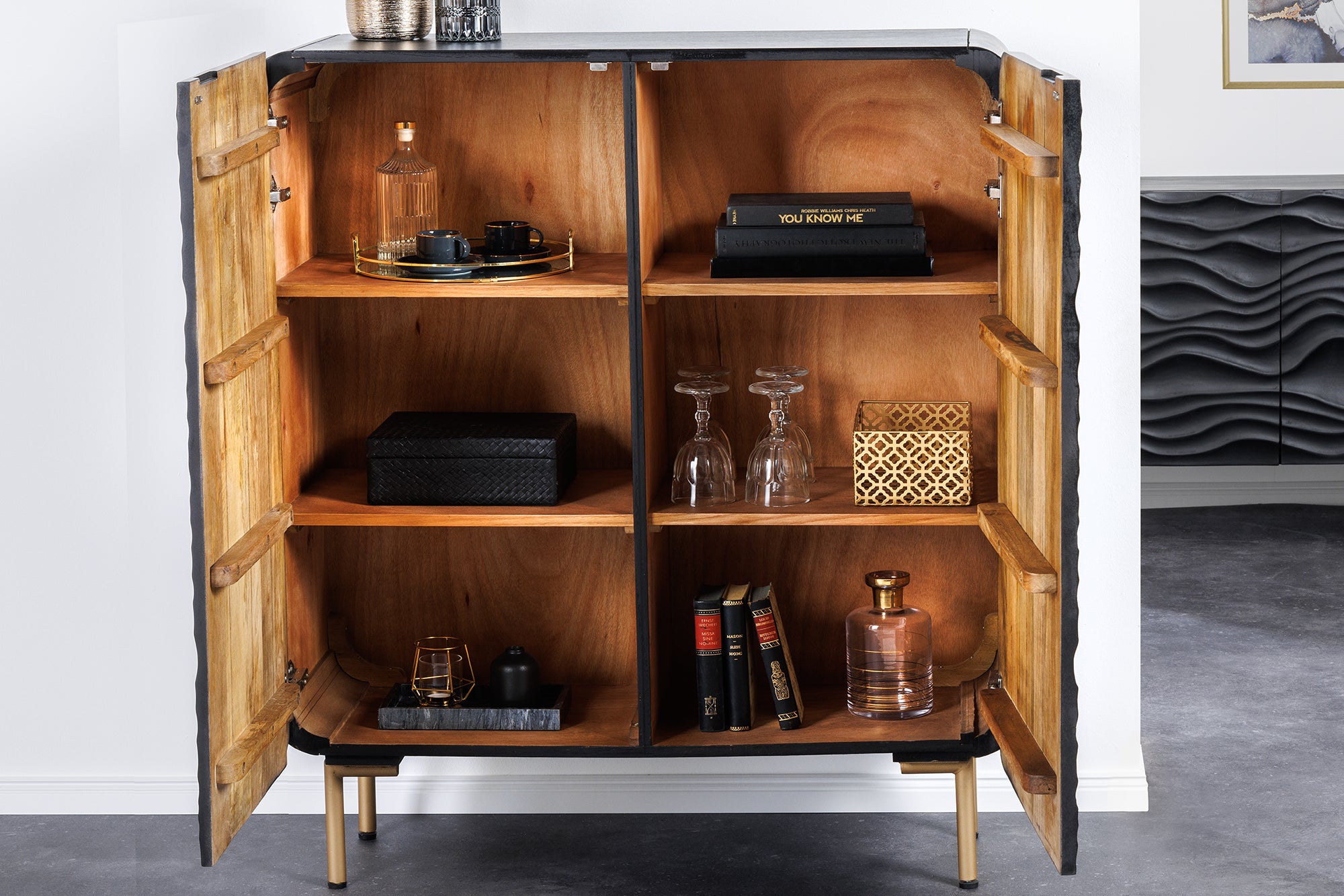 Nowoczesna komoda typu highboard o wyjątkowo eleganckim i dynamicznym designie, wykonana z litego drewna mango. Model LAGOON wyróżnia się frontami z efektem falującej struktury 3D, które tworzą bardzo charakterystyczny, designerski wygląd i przyciągają uwagę.