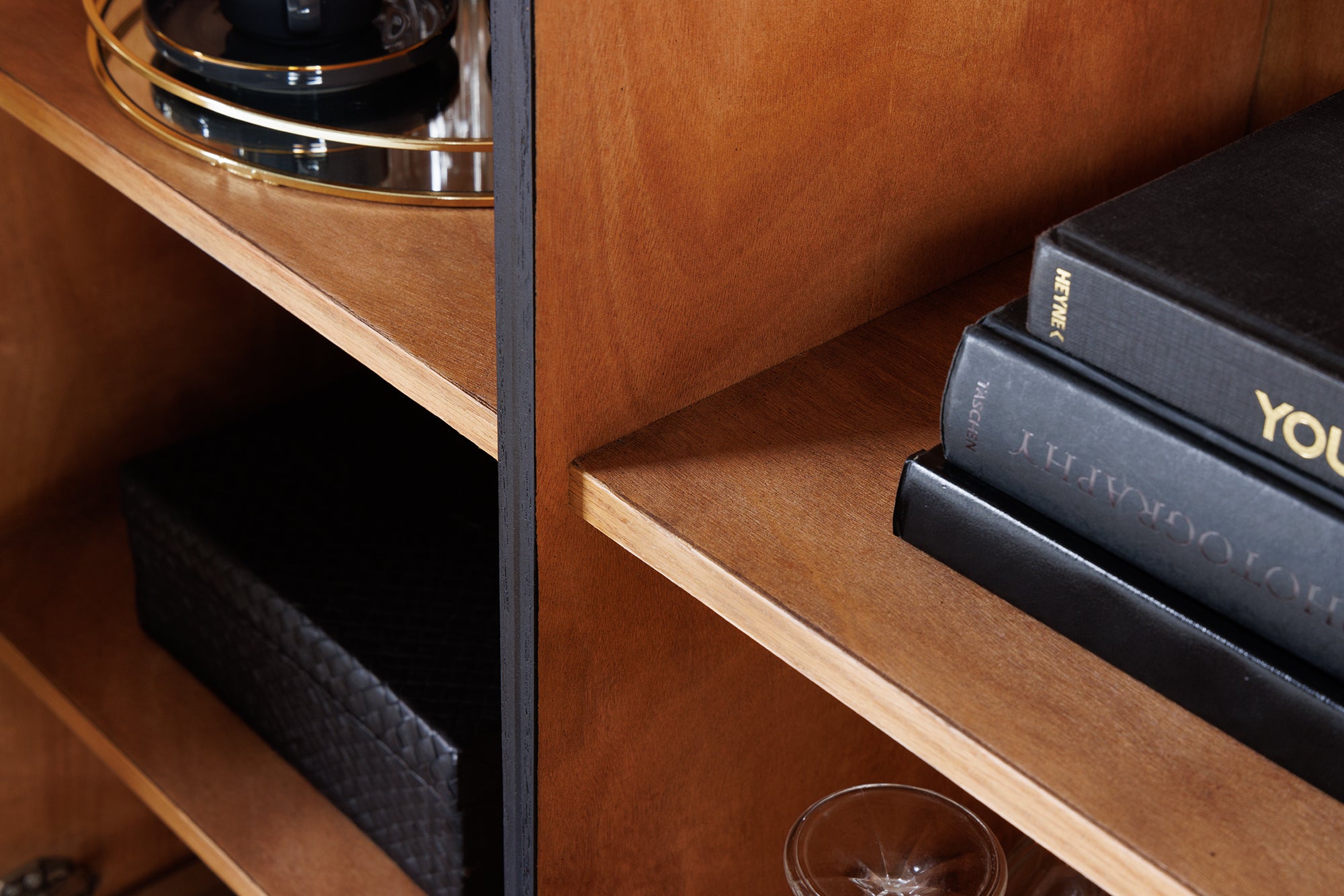 Czarna kolorystyka w połączeniu ze złotą, metalową podstawą nadaje meblowi luksusowego charakteru z nutą stylu retro i glamour. To mebel, który świetnie sprawdzi się jako centralny element salonu lub jadalni.