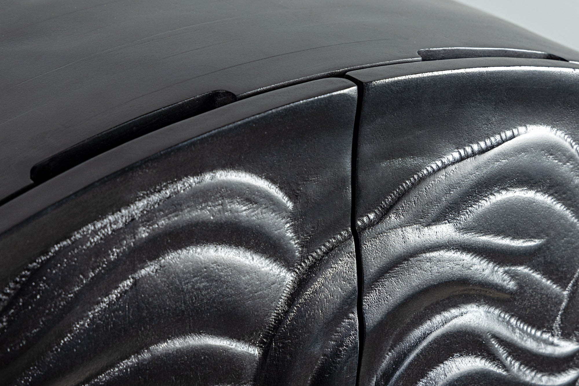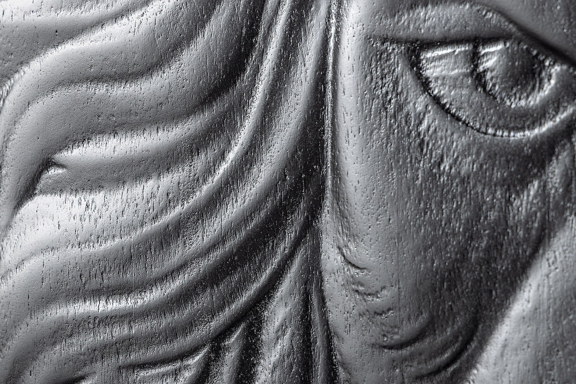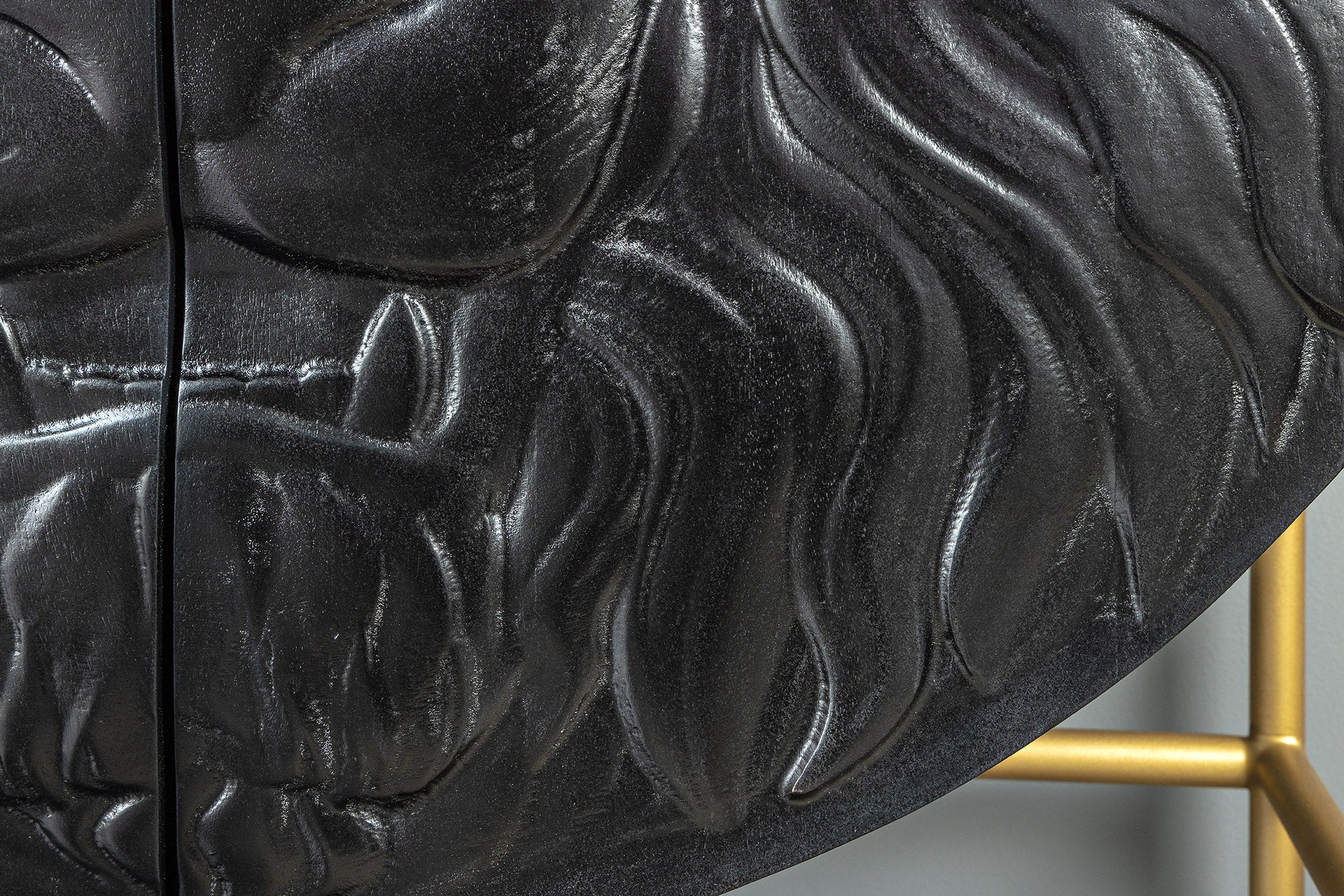 Nowoczesna komoda typu highboard o eleganckim, luksusowym charakterze, wykonana z litego drewna mango w głębokim czarnym kolorze. Model LION wyróżnia się efektownym frontem 3D, który tworzy przestrzenną, dekoracyjną strukturę i nadaje meblowi wyjątkowy wygląd.