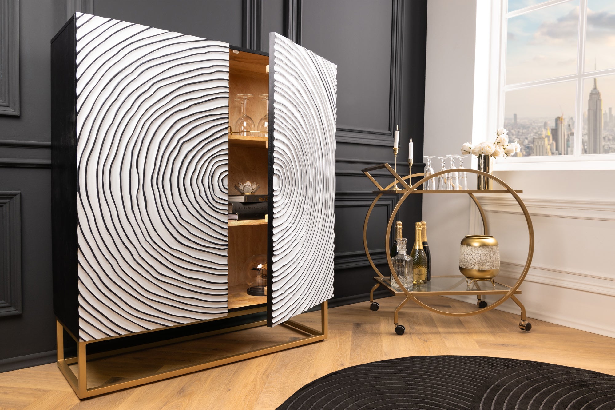 Kontrastowe połączenie czerni i bieli sprawia, że mebel jest bardzo wyrazisty, ale jednocześnie elegancki. Całość dopełnia metalowa podstawa w złotym kolorze, która nadaje lekkości i podkreśla styl glamour oraz nowoczesny.