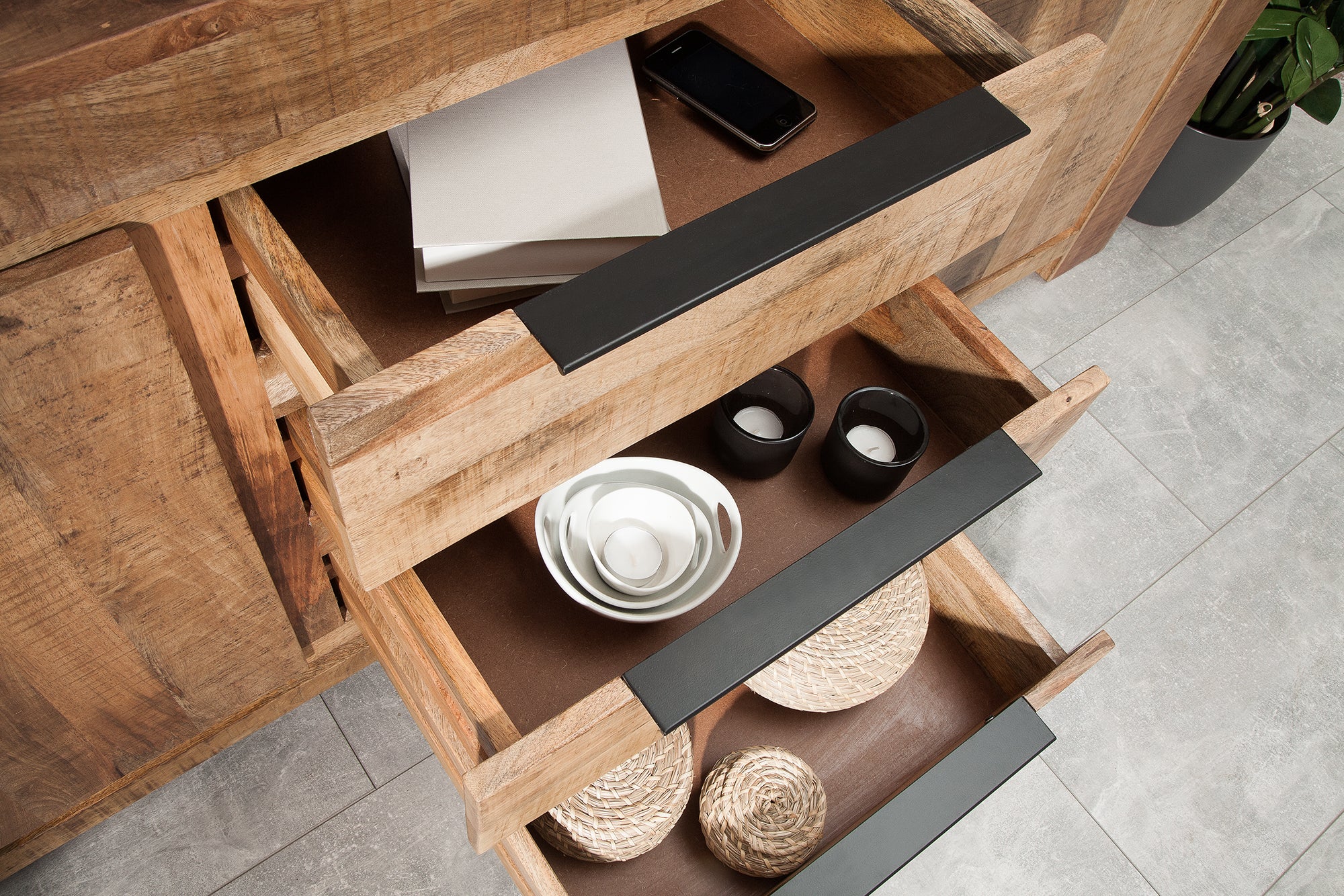 Wnętrze komody zostało zaprojektowane bardzo praktycznie. Znajdziesz tu trzy duże szuflady oraz cztery zamykane komory, co daje dużo miejsca do przechowywania i pozwala łatwo utrzymać porządek
