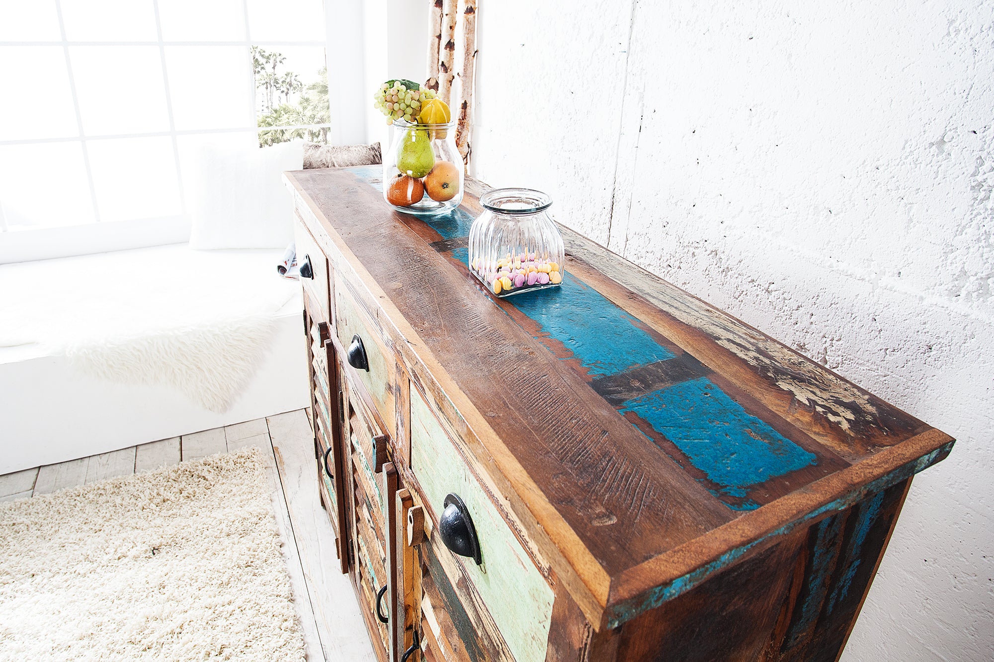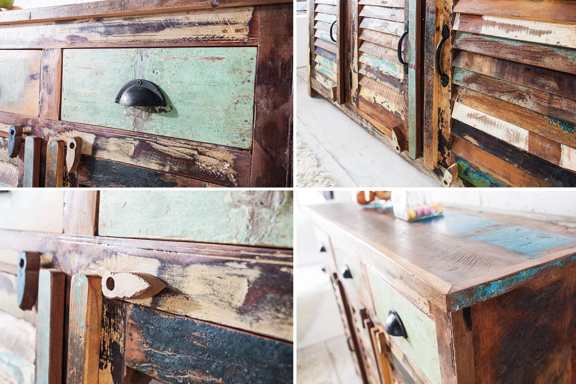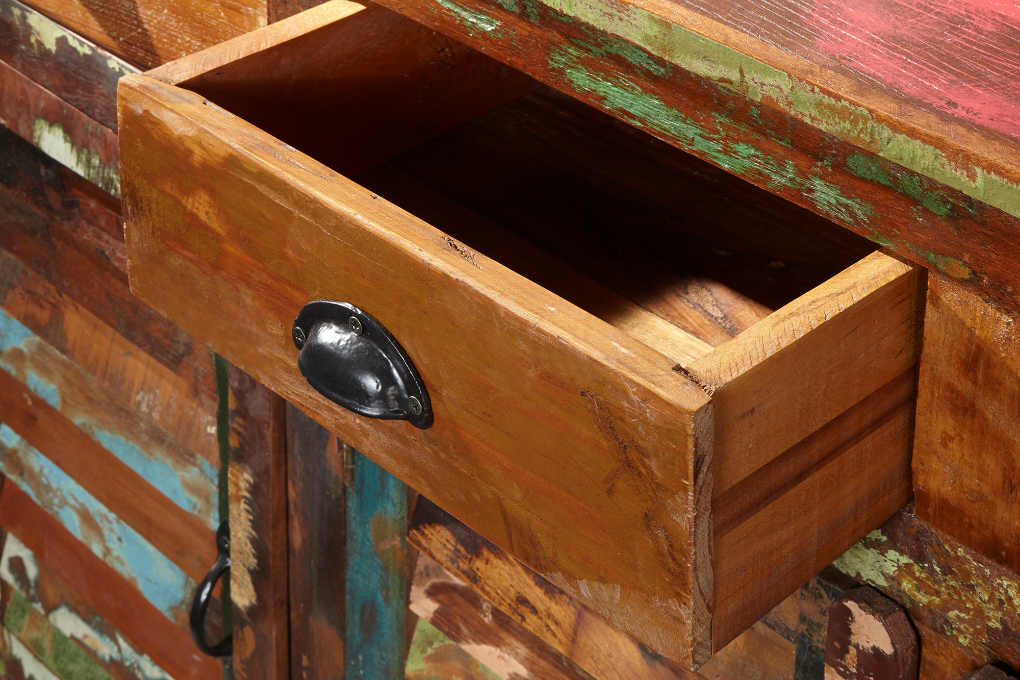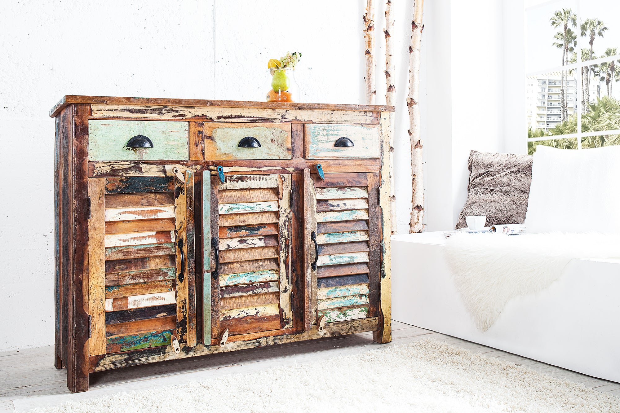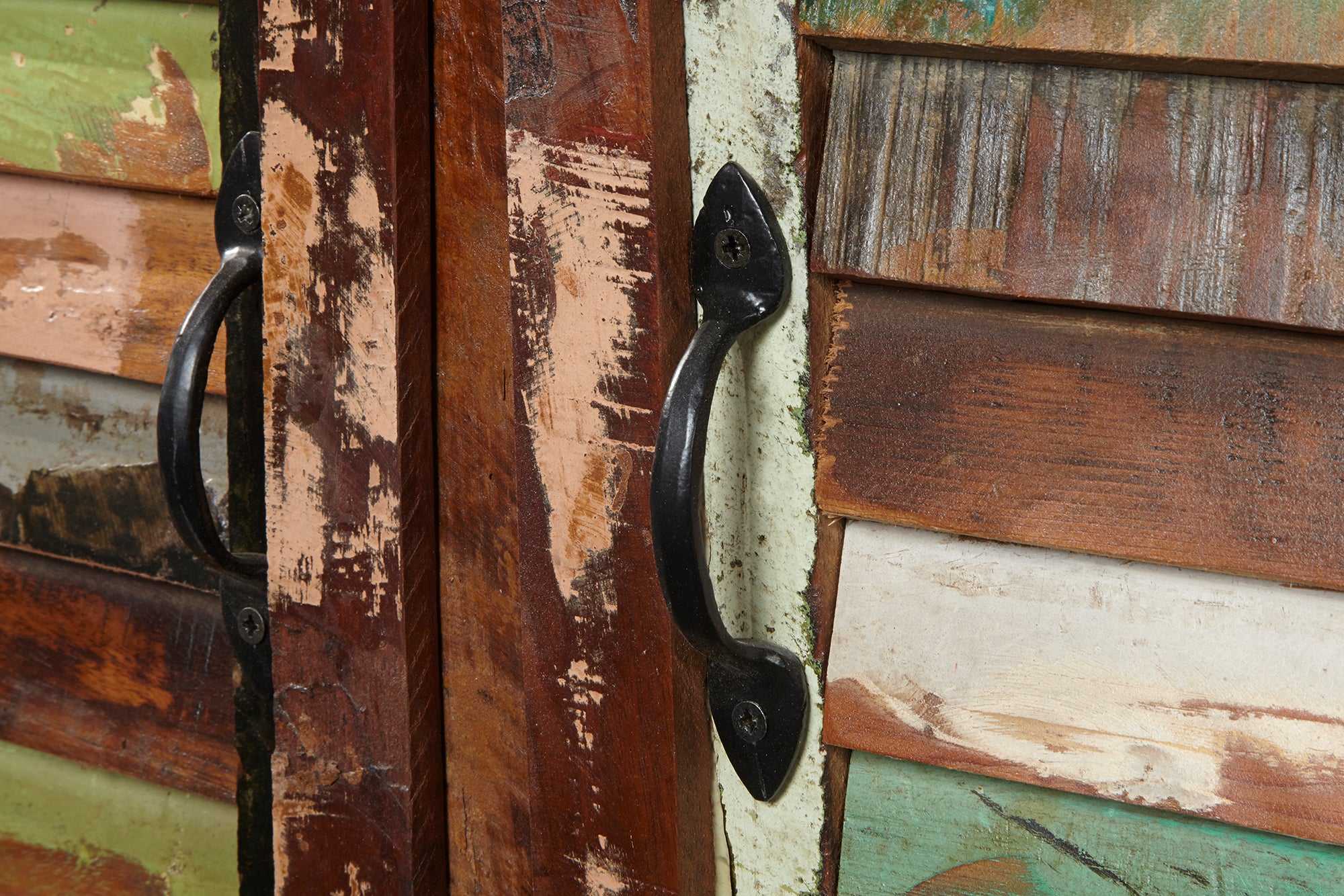 Komoda JAKARTA 125 cm to wyjątkowy mebel wykonany z litego drewna z recyklingu, który wyróżnia się niepowtarzalnym wyglądem i autentycznym charakterem. Drewno pochodzi m.in. ze starych łodzi rybackich, dzięki czemu każdy egzemplarz ma unikalną strukturę, kolor i historię.