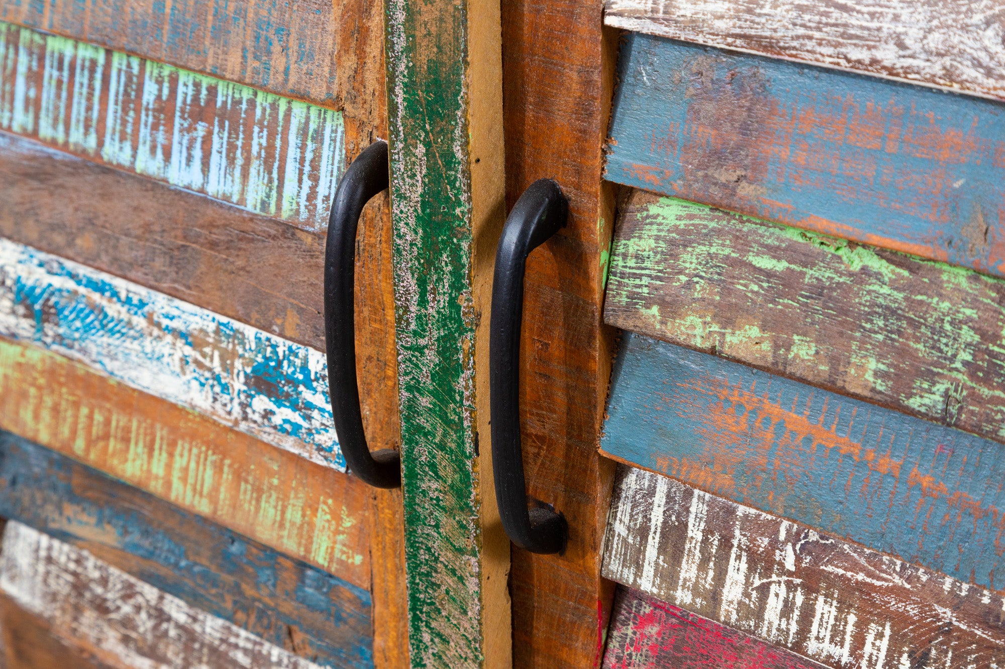 Wyjątkowa komoda o bardzo charakterystycznym, artystycznym wyglądzie, wykonana z litego drewna mango oraz drewna pochodzącego z recyklingu. Model JAKARTA wyróżnia się wielobarwnymi frontami, które powstały z odzyskanych desek – często pochodzących ze starych łodzi rybackich, co nadaje meblowi niepowtarzalny charakter.