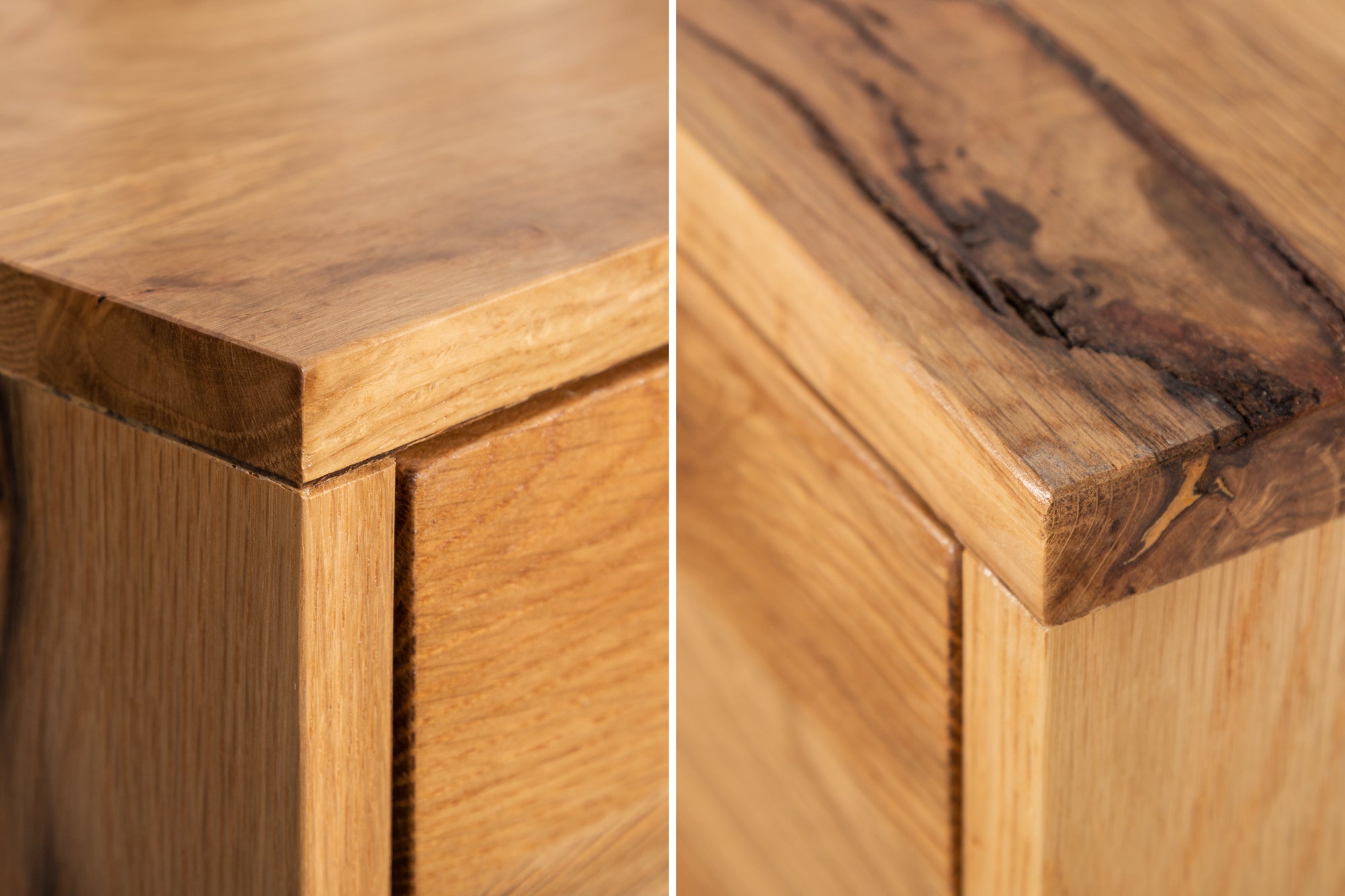 Największym atutem tego modelu jest efekt „live edge”, czyli zachowana naturalna linia drewna. Widoczne sęki, pęknięcia i nieregularności nie są wadą, tylko celowym elementem designu, który sprawia, że każdy egzemplarz wygląda inaczej i ma unikalny charakter.