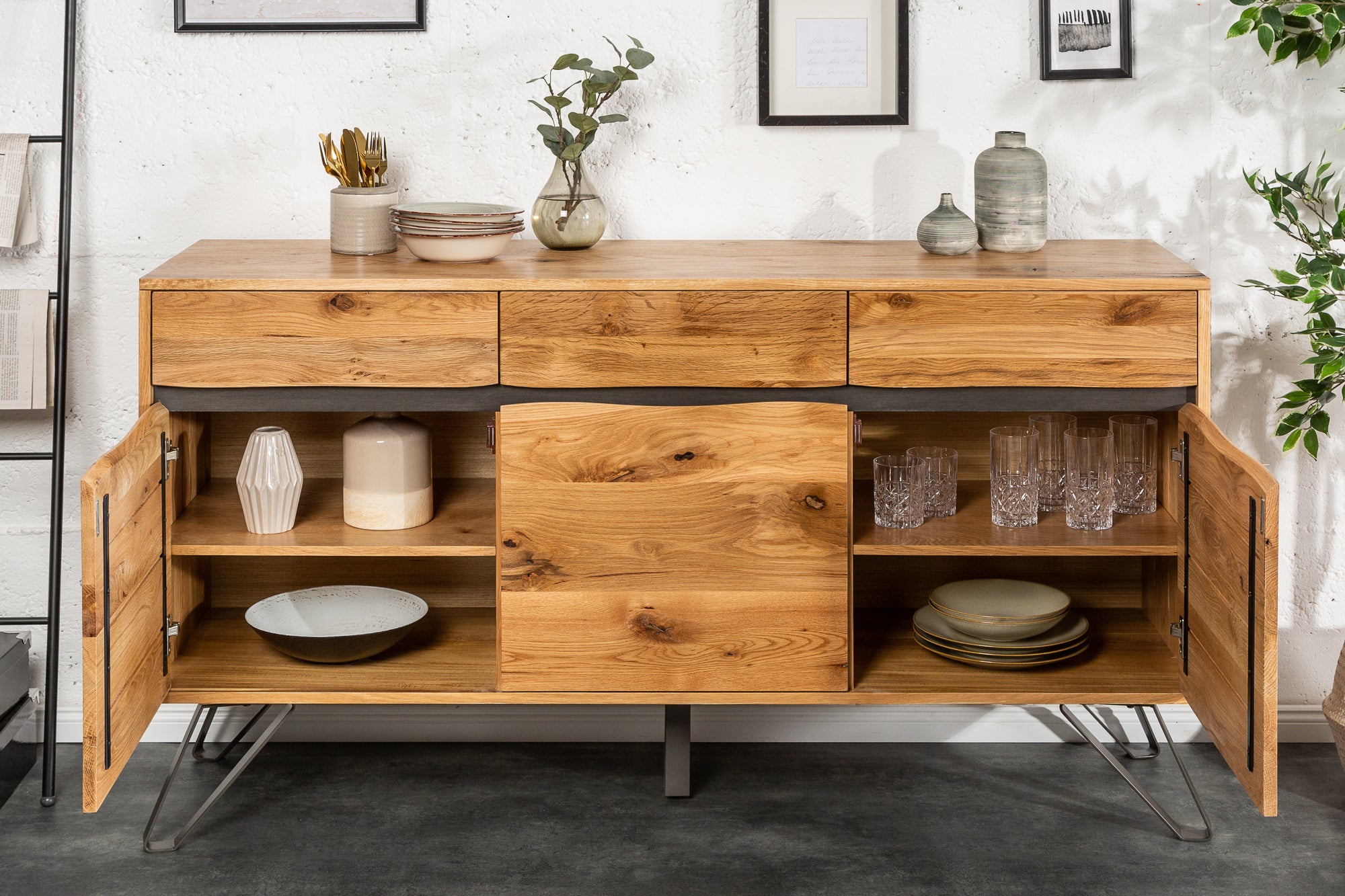 Wnętrze jest bardzo praktyczne i pojemne. Komoda oferuje trzy szuflady oraz sześć zamykanych przestrzeni, dzięki czemu bez problemu pomieści zastawę, dokumenty lub inne przedmioty codziennego użytku.