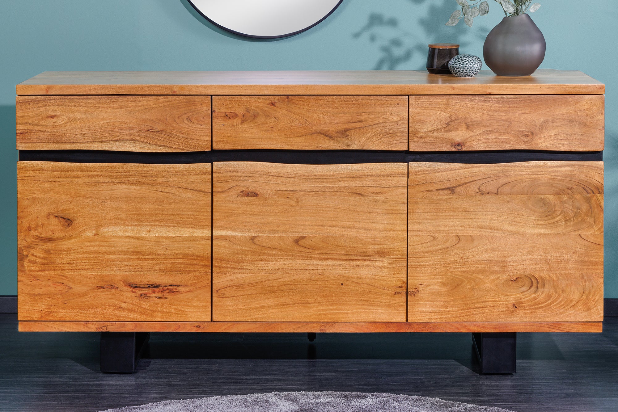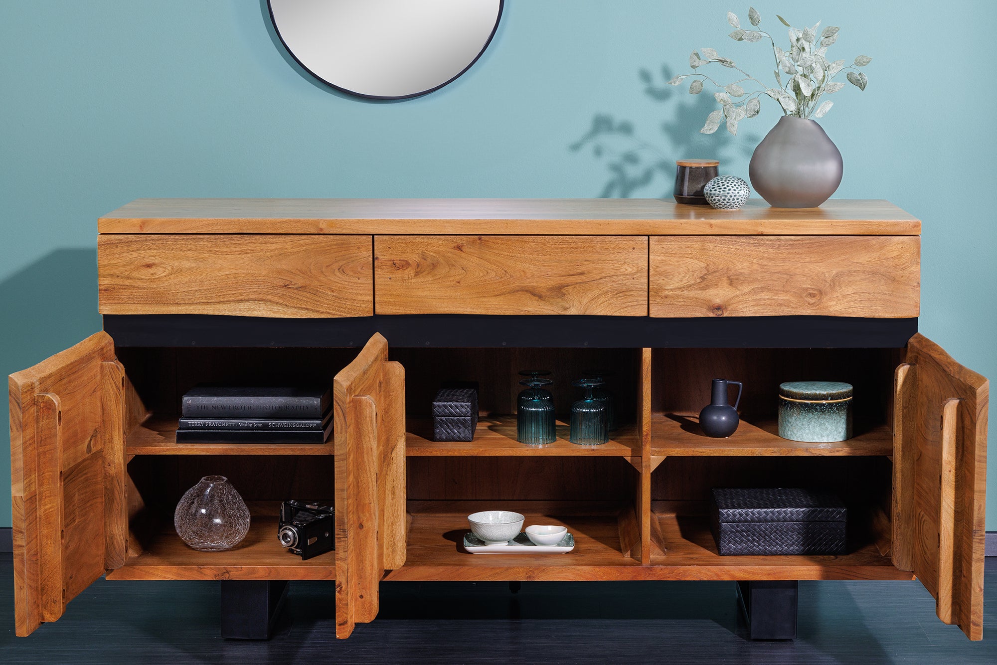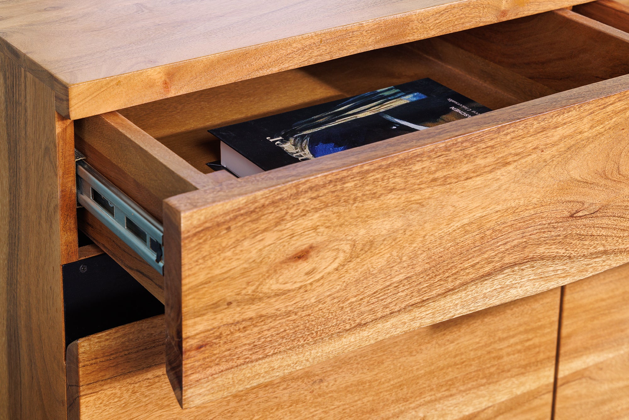 Komoda MAMMUT 160 cm to solidny, naturalny mebel, który wyróżnia się surowym wyglądem drewna i wyraźnym charakterem loftowym. Wykonana z litego drewna akacjowego w miodowym odcieniu, przyciąga uwagę głębokim usłojeniem oraz ciepłą kolorystyką.