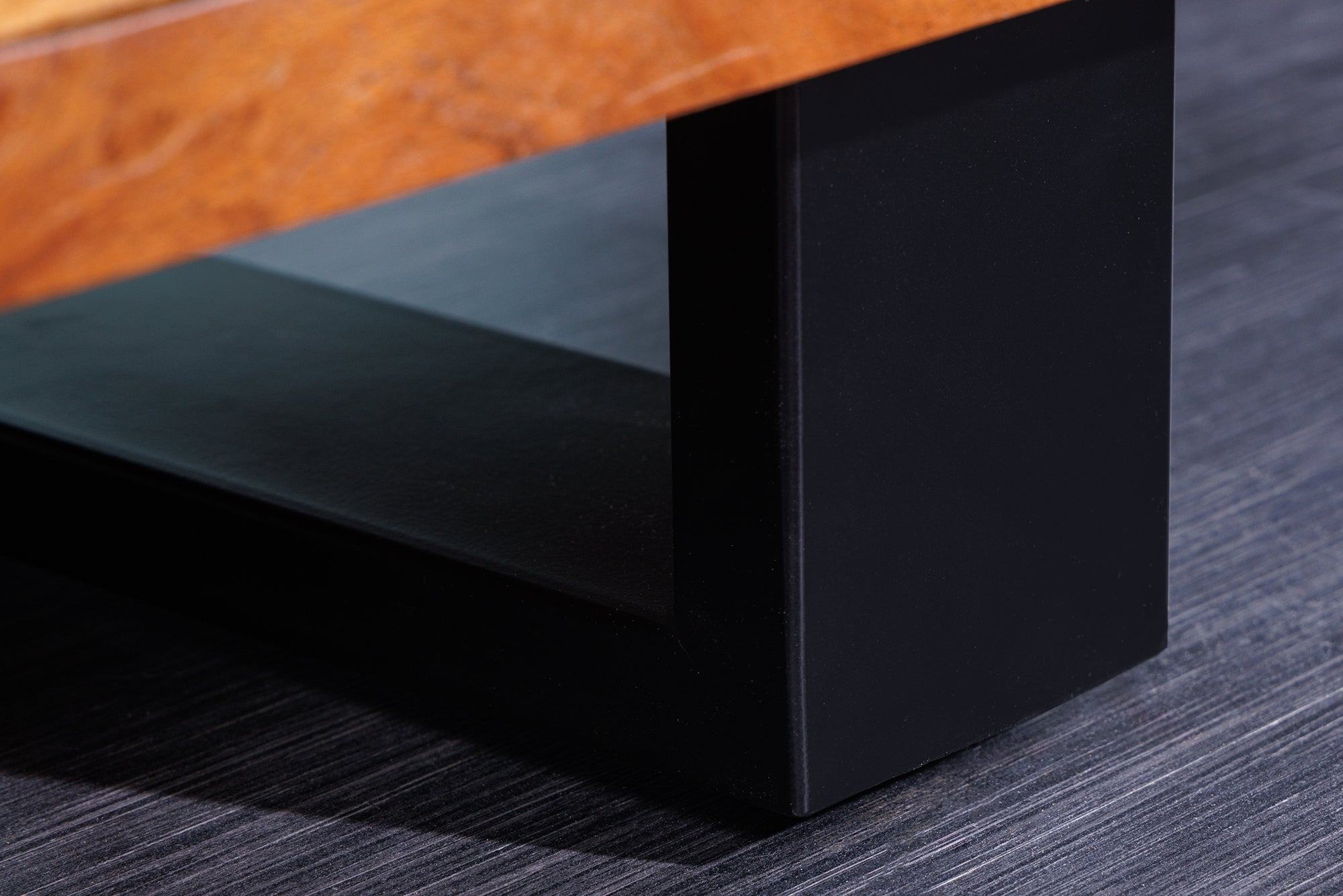 Całość osadzona jest na metalowych nogach, które nadają konstrukcji stabilność i industrialny styl. Połączenie naturalnego drewna i czarnego metalu sprawia, że mebel dobrze pasuje do nowoczesnych oraz loftowych wnętrz.