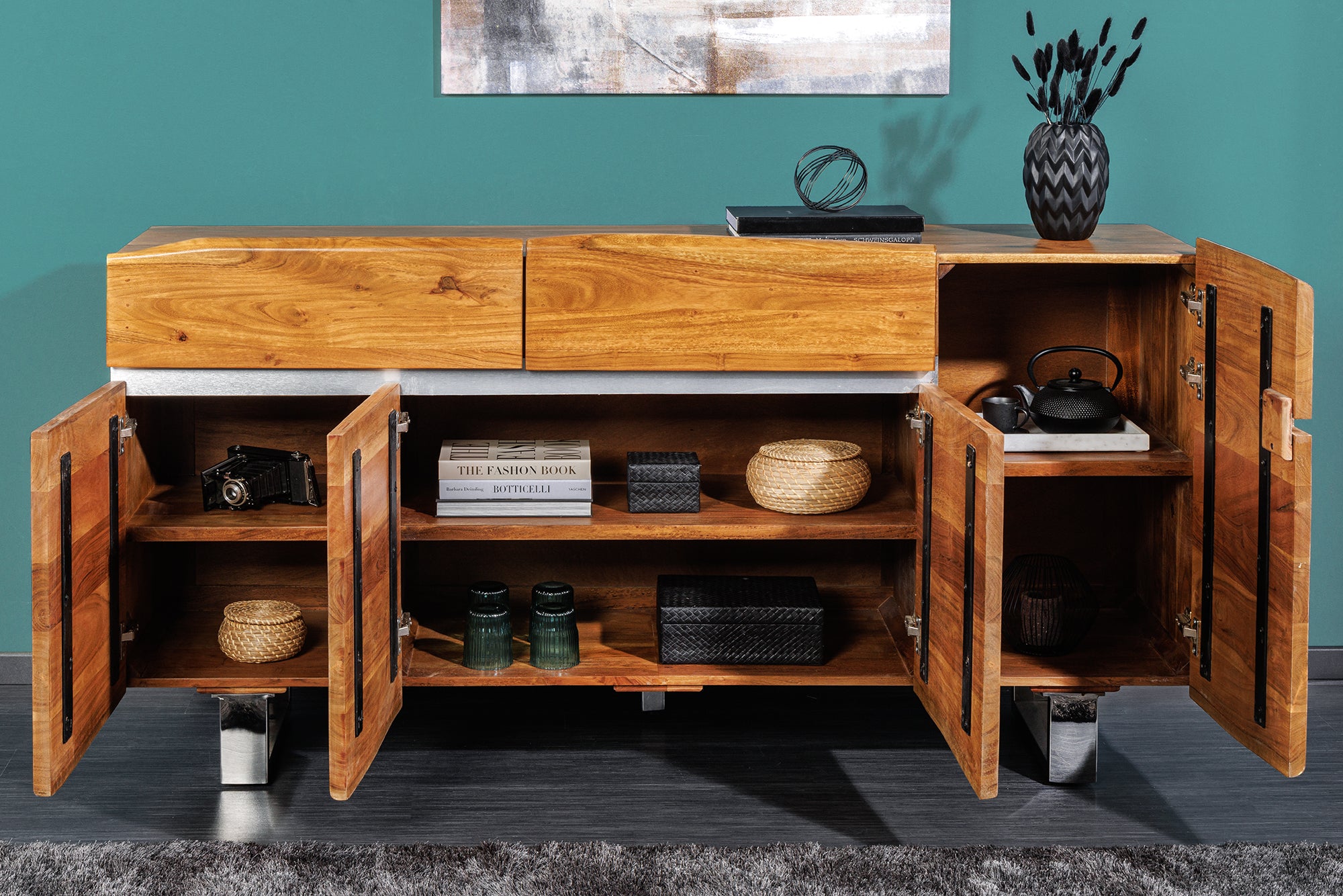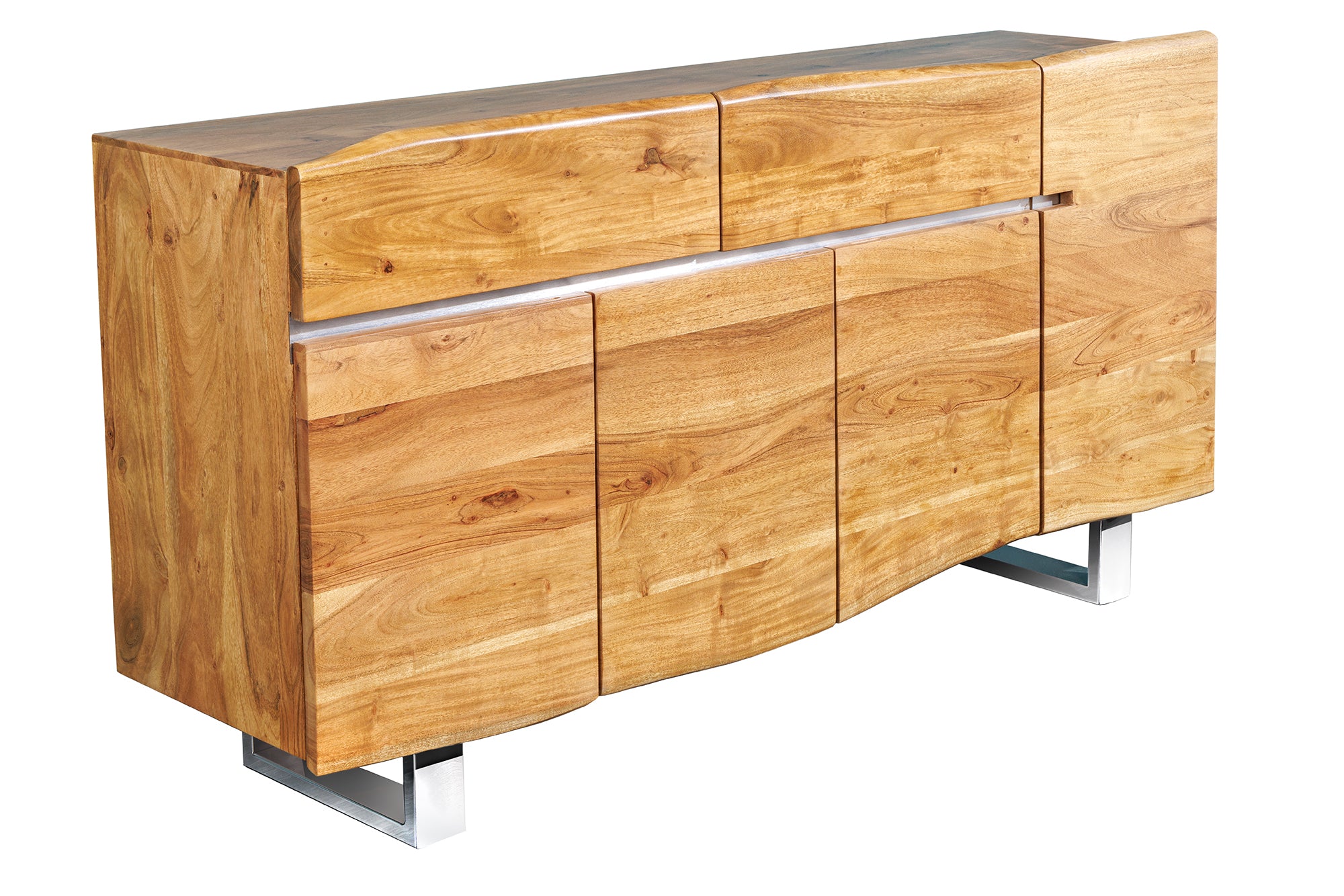 Komoda MAMMUT 170 cm to masywny, naturalny mebel wykonany z litego drewna akacjowego, który wyróżnia się charakterystycznym wykończeniem w kolorze miodowym. Powierzchnia drewna zachowuje naturalny przebieg krawędzi typu live edge, co nadaje całości autentyczny i surowy wygląd.