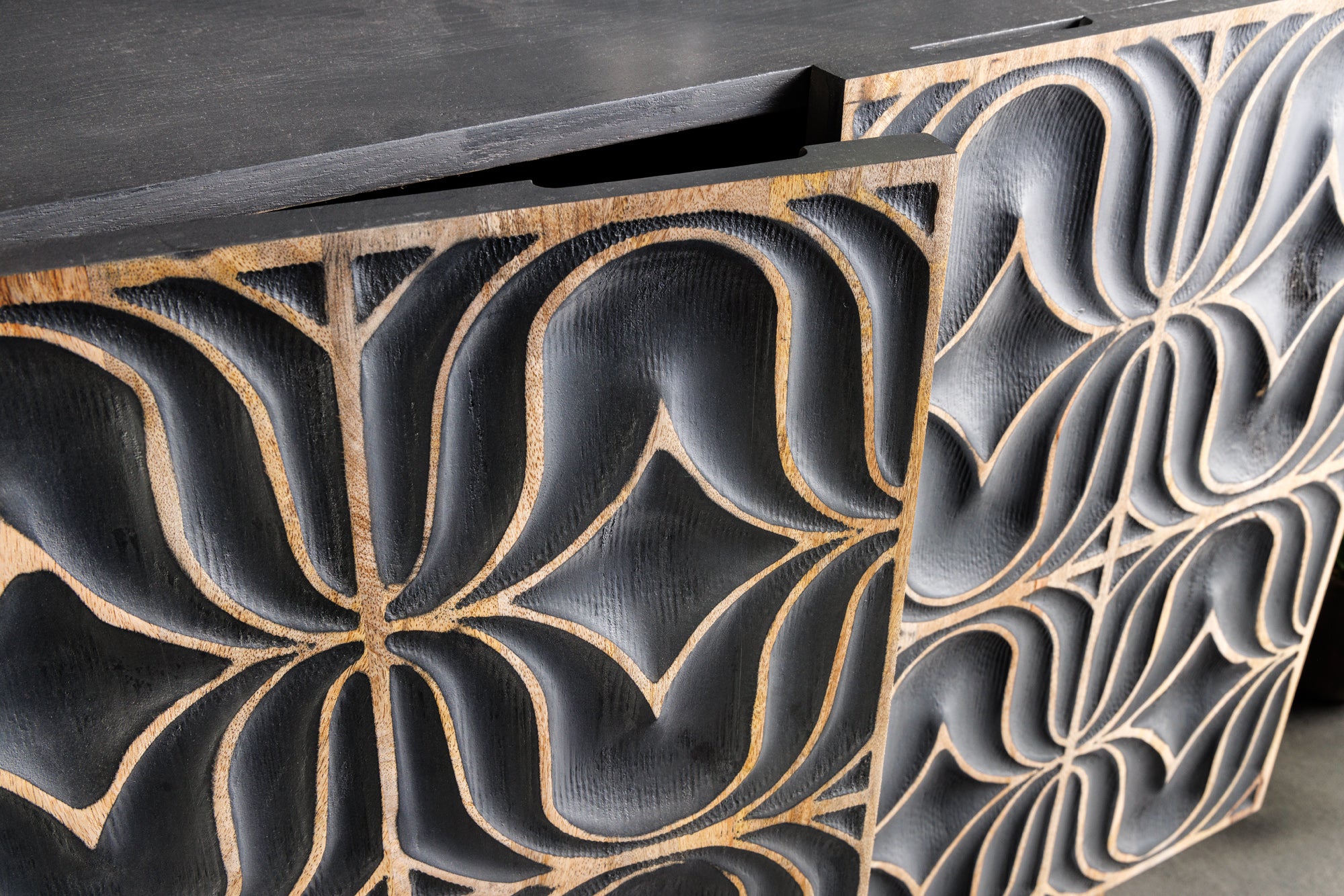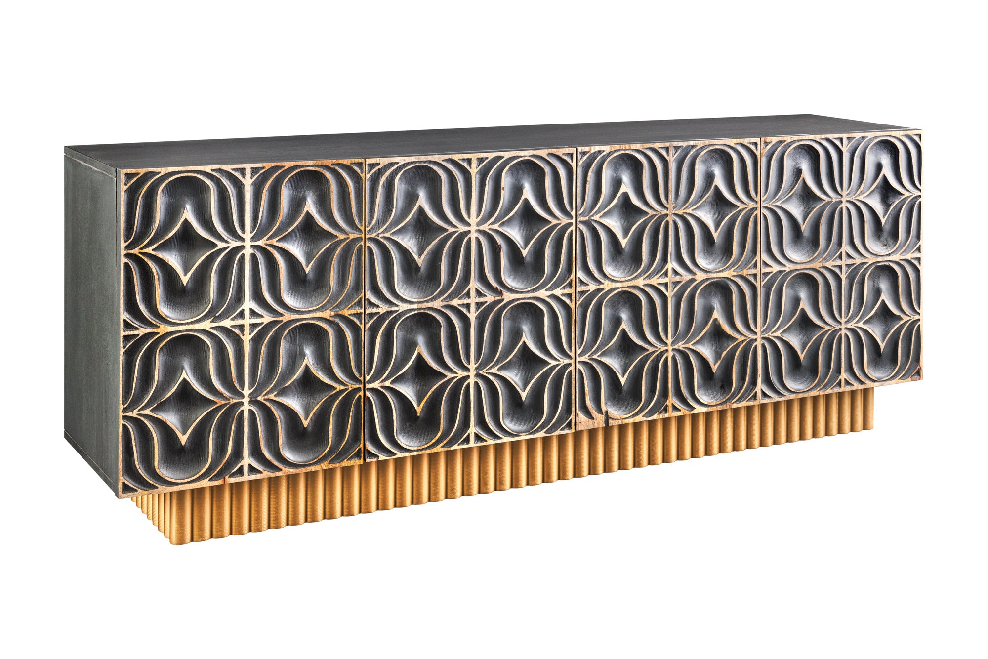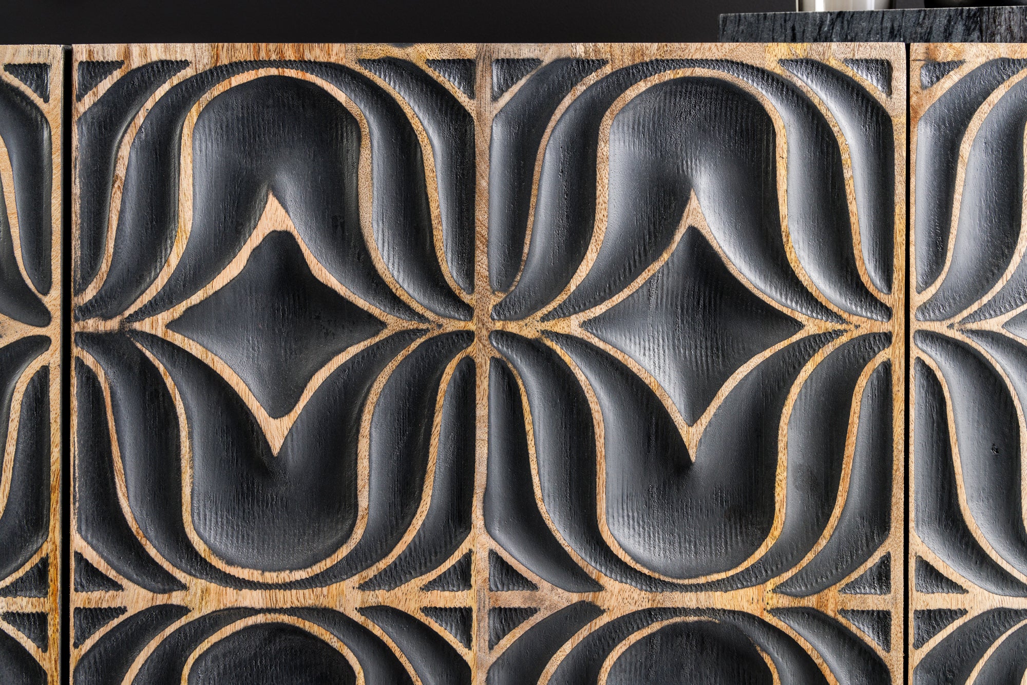 Nowoczesna, szeroka komoda o wyjątkowym, luksusowym charakterze, wykonana z litego drewna mango. Model PIAZZA SAN MARCO wyróżnia się ręcznie rzeźbionymi frontami 3D o geometrycznym wzorze, które tworzą efektowną, artystyczną kompozycję i przyciągają uwagę w każdym wnętrzu.