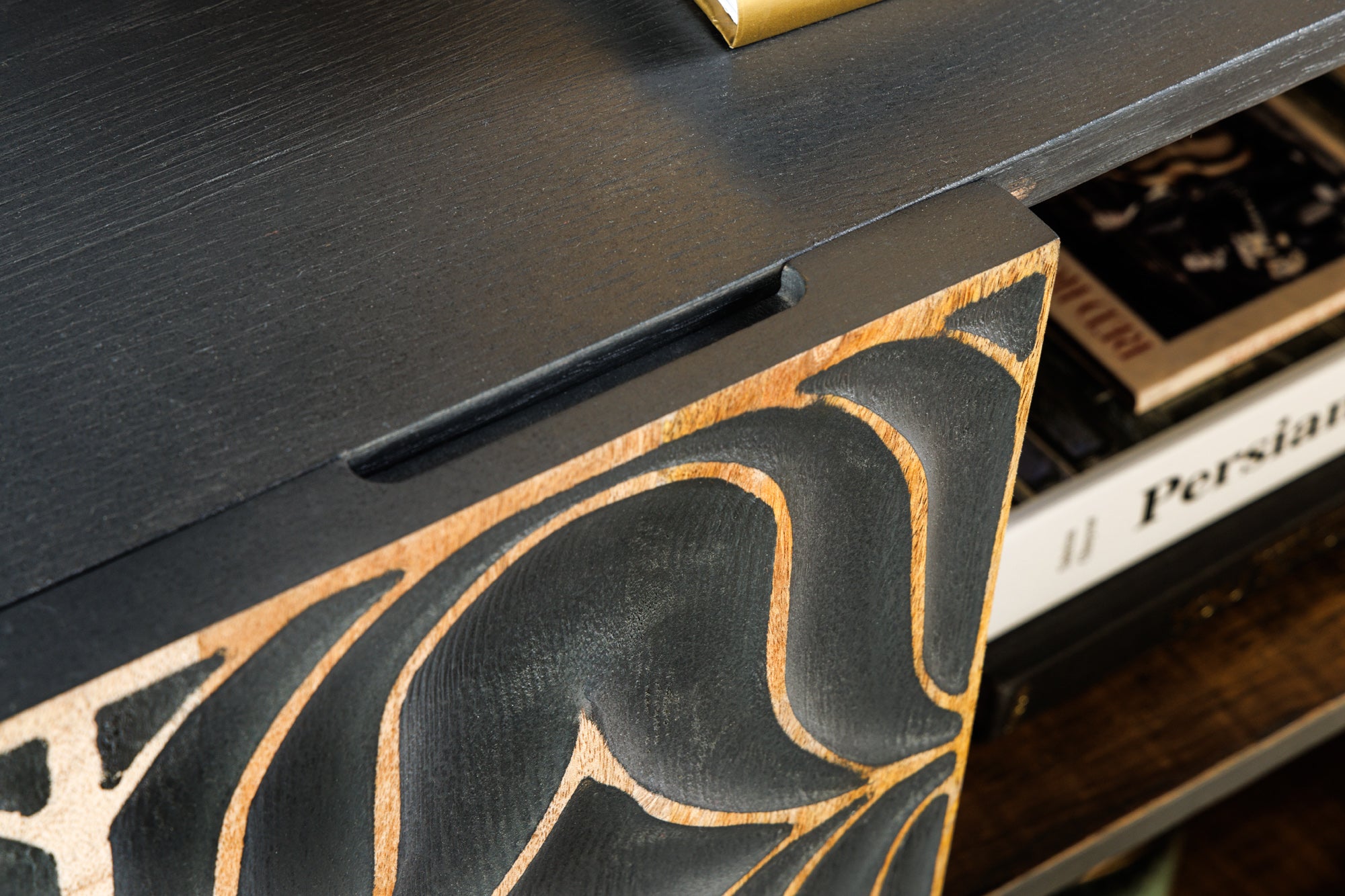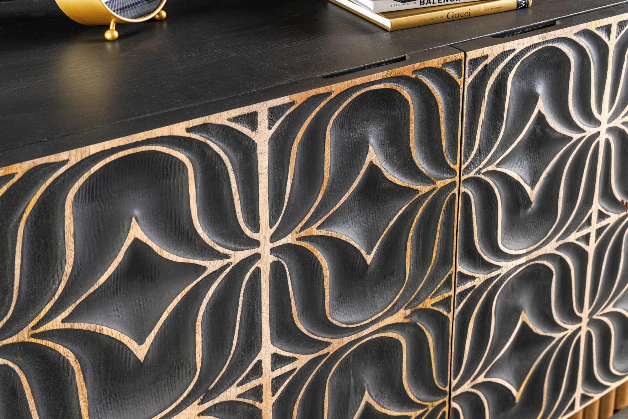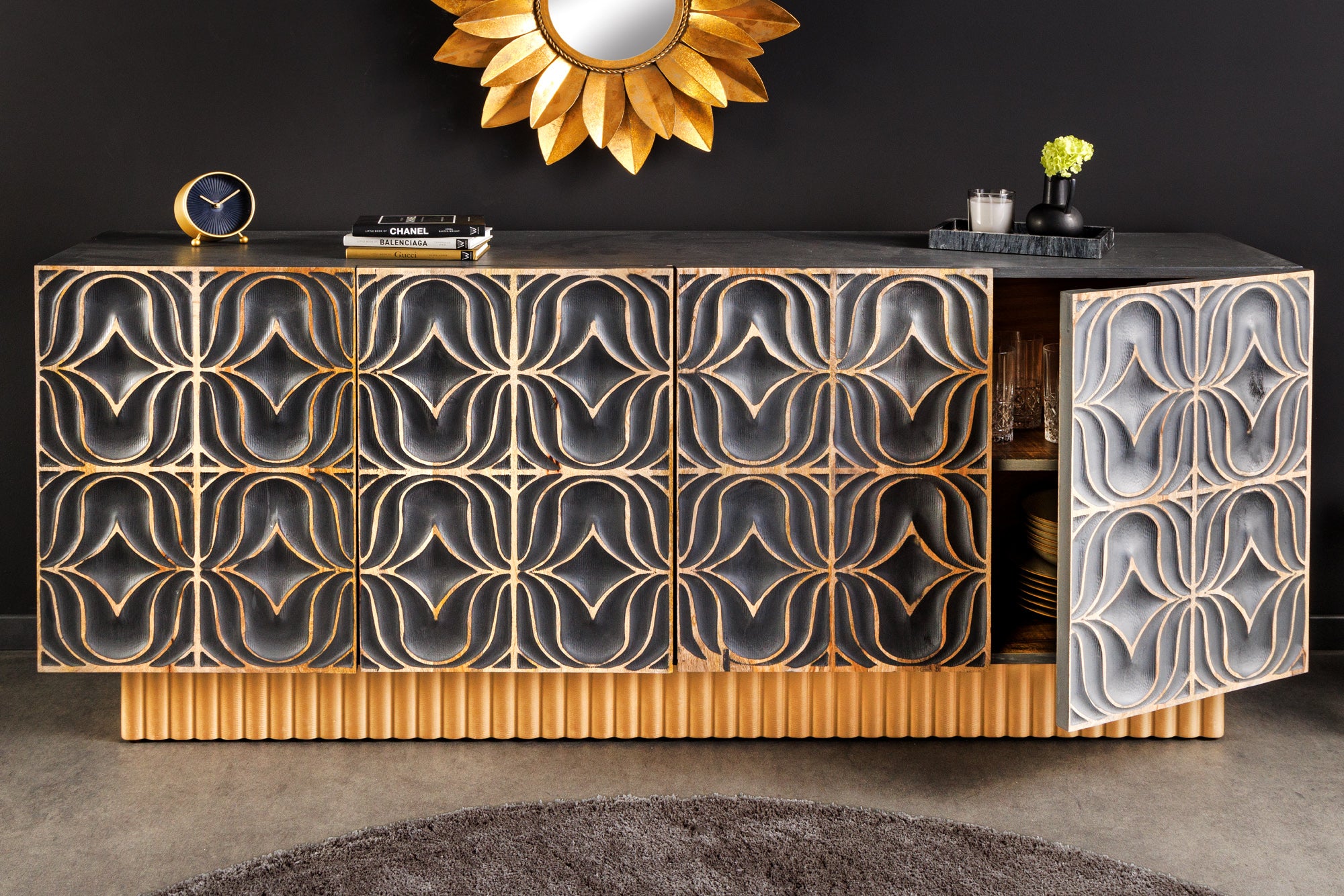 Nowoczesna, szeroka komoda o wyjątkowym, luksusowym charakterze, wykonana z litego drewna mango. Model PIAZZA SAN MARCO wyróżnia się ręcznie rzeźbionymi frontami 3D o geometrycznym wzorze, które tworzą efektowną, artystyczną kompozycję i przyciągają uwagę w każdym wnętrzu.
