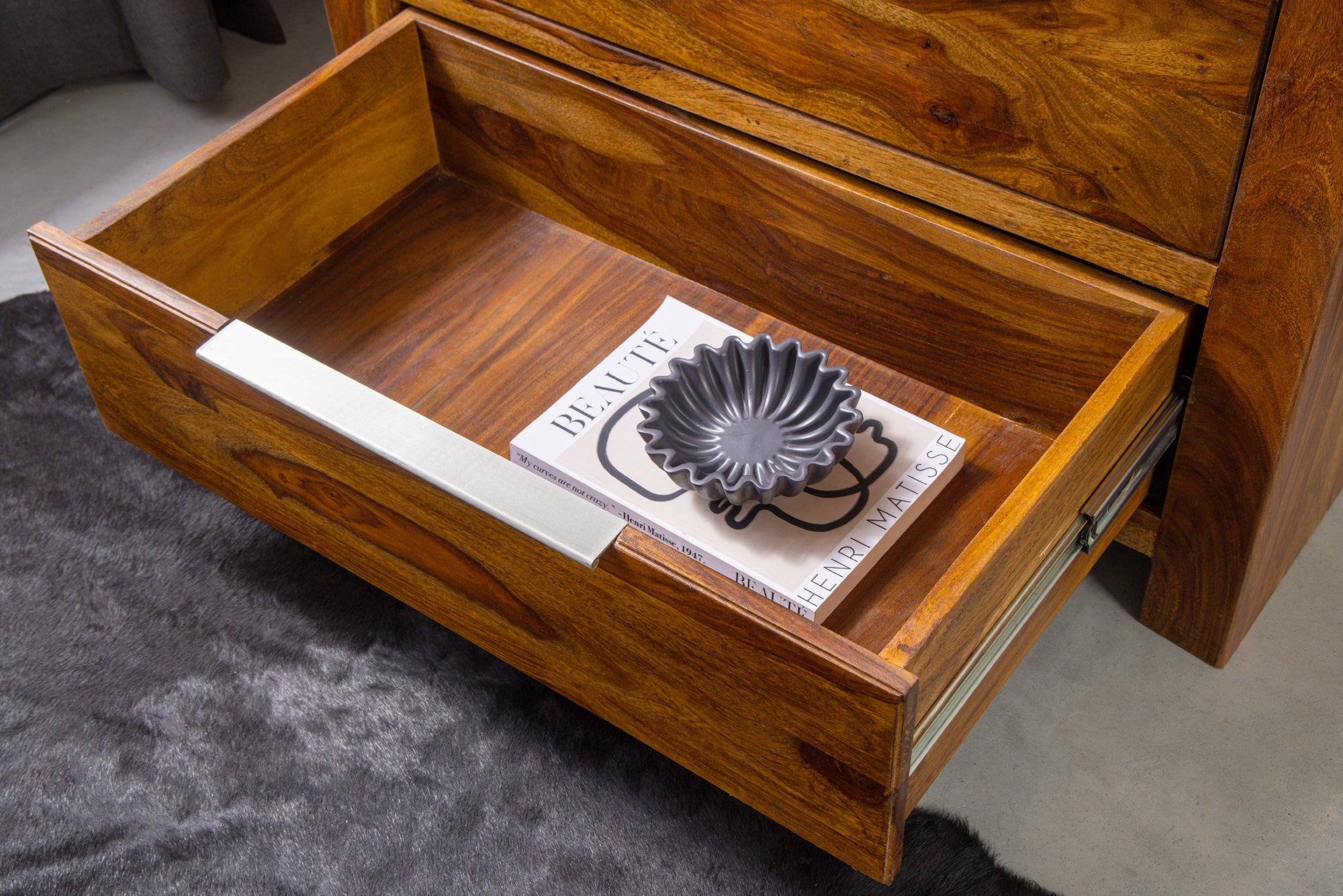 Elegancka komoda o minimalistycznym designie, wykonana z litego drewna sheesham (palisander indyjski). Naturalne usłojenie drewna w połączeniu z wykończeniem typu brown stone finish nadaje meblowi głęboki, szlachetny kolor i podkreśla jego unikalny charakter. Każdy egzemplarz różni się strukturą drewna, co czyni go niepowtarzalnym.