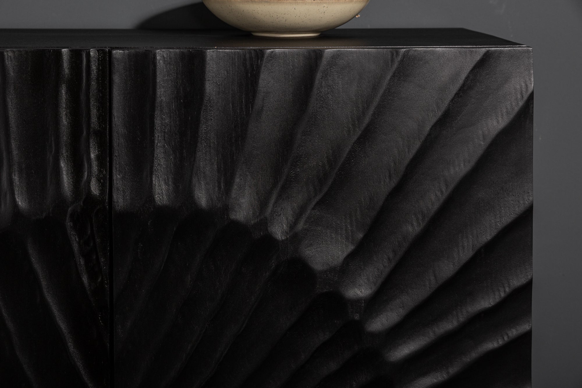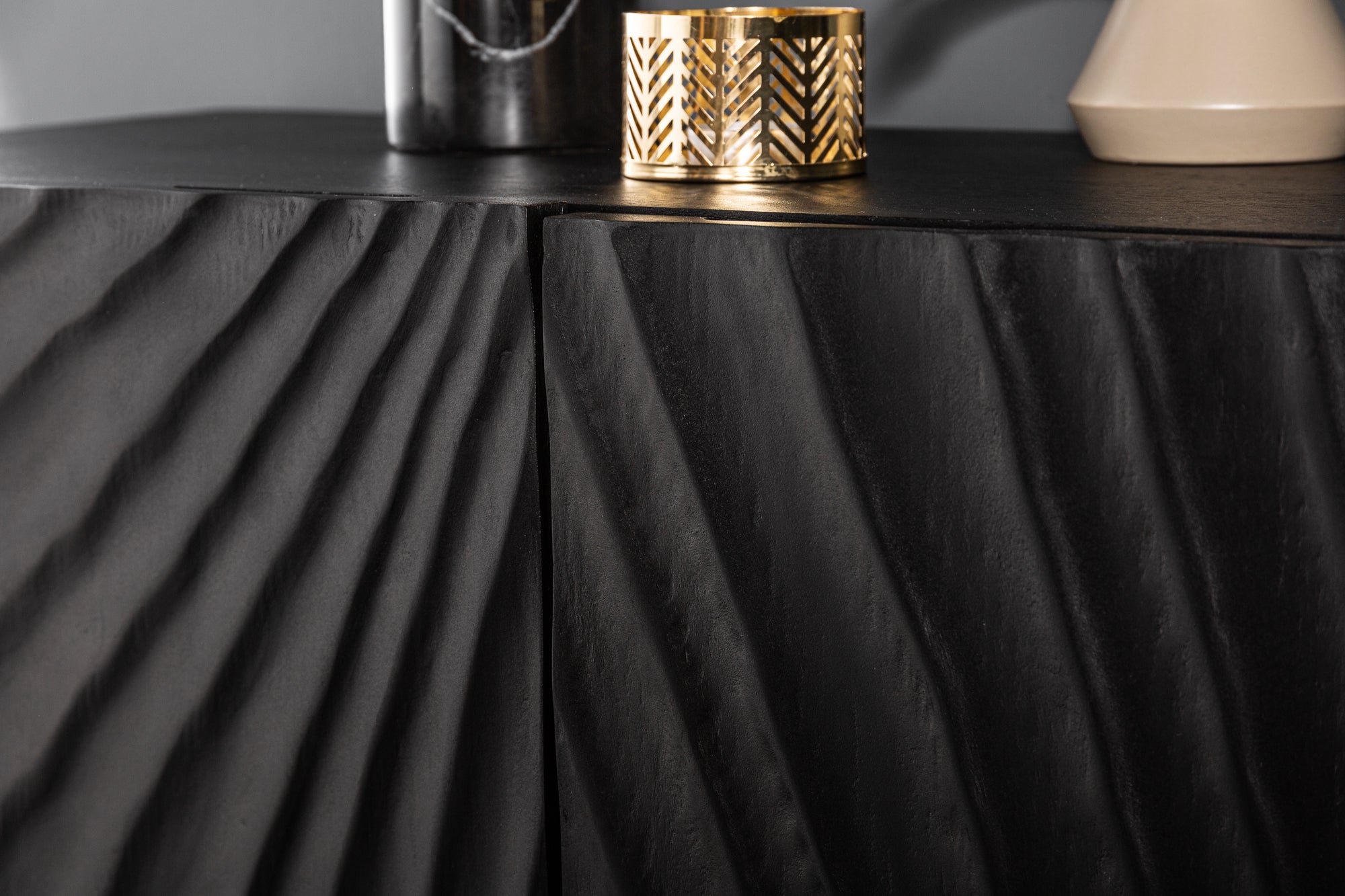 Nowoczesna komoda o wyrazistej, rzeźbiarskiej formie, która łączy naturalne drewno z eleganckim, industrialnym stylem. Korpus wykonany z litego drewna mango w głębokim, czarnym kolorze podkreśla strukturę materiału i nadaje wnętrzu nowoczesny, ekskluzywny charakter.