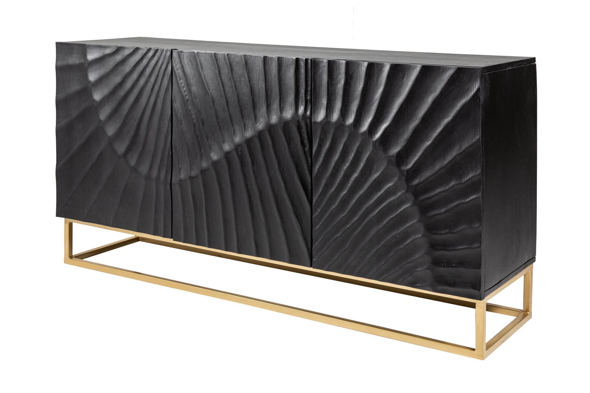 Najbardziej charakterystycznym elementem mebla są fronty z ręcznie wykonanym wzorem 3D, tworzącym efekt dynamicznej gry światła i cienia. Organiczne linie sprawiają wrażenie płynącej powierzchni i przyciągają uwagę, dzięki czemu komoda staje się centralnym punktem aranżacji. Całość osadzona jest na metalowej podstawie w złotym kolorze, co dodaje lekkości i podkreśla styl loftowy oraz glamour.