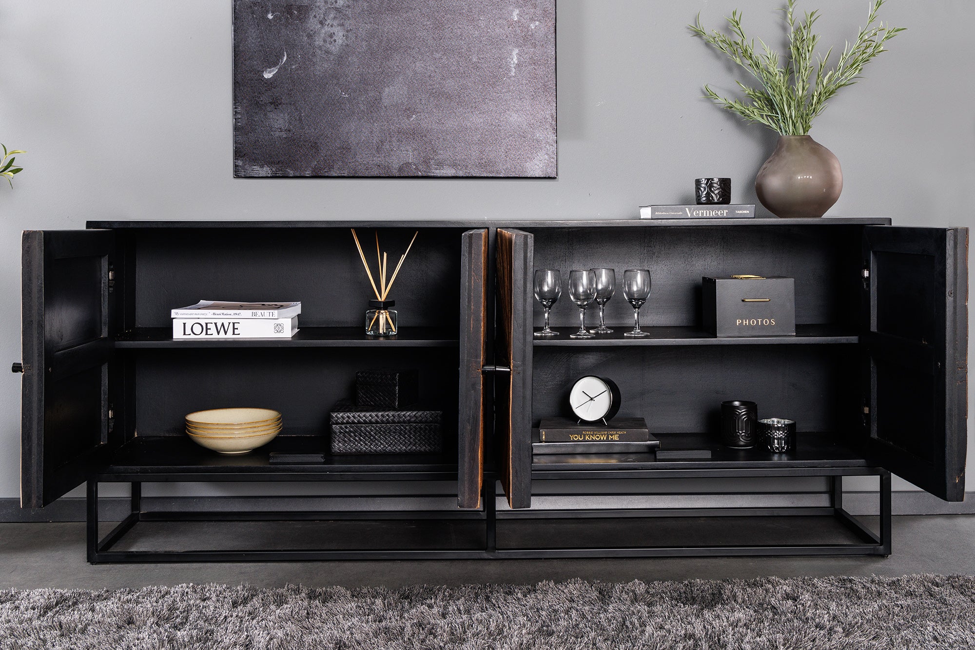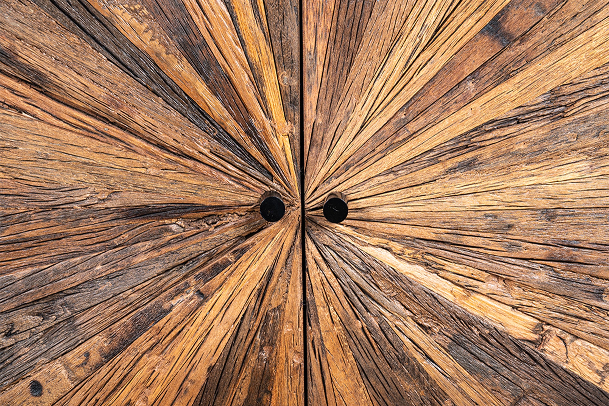 Fronty wykonane z drewna teakowego wyróżniają się nieregularnym układem i naturalną strukturą, co nadaje komodzie lekko „rękodzielniczy” charakter. To mebel, który idealnie wpisuje się w styl loftowy, industrialny oraz boho.
