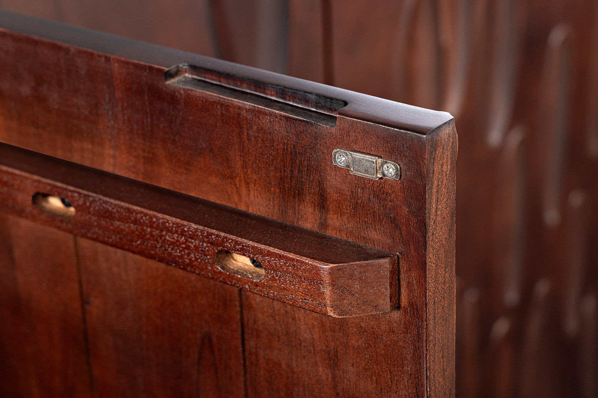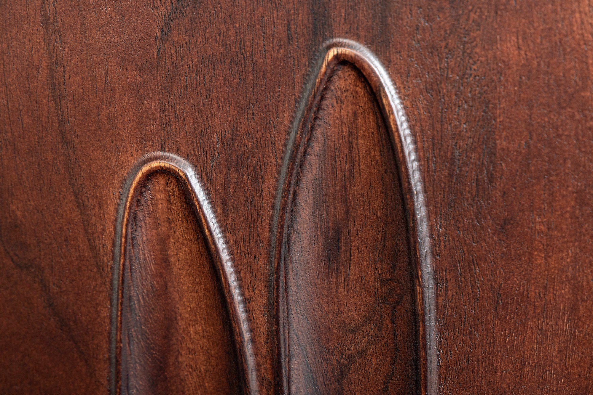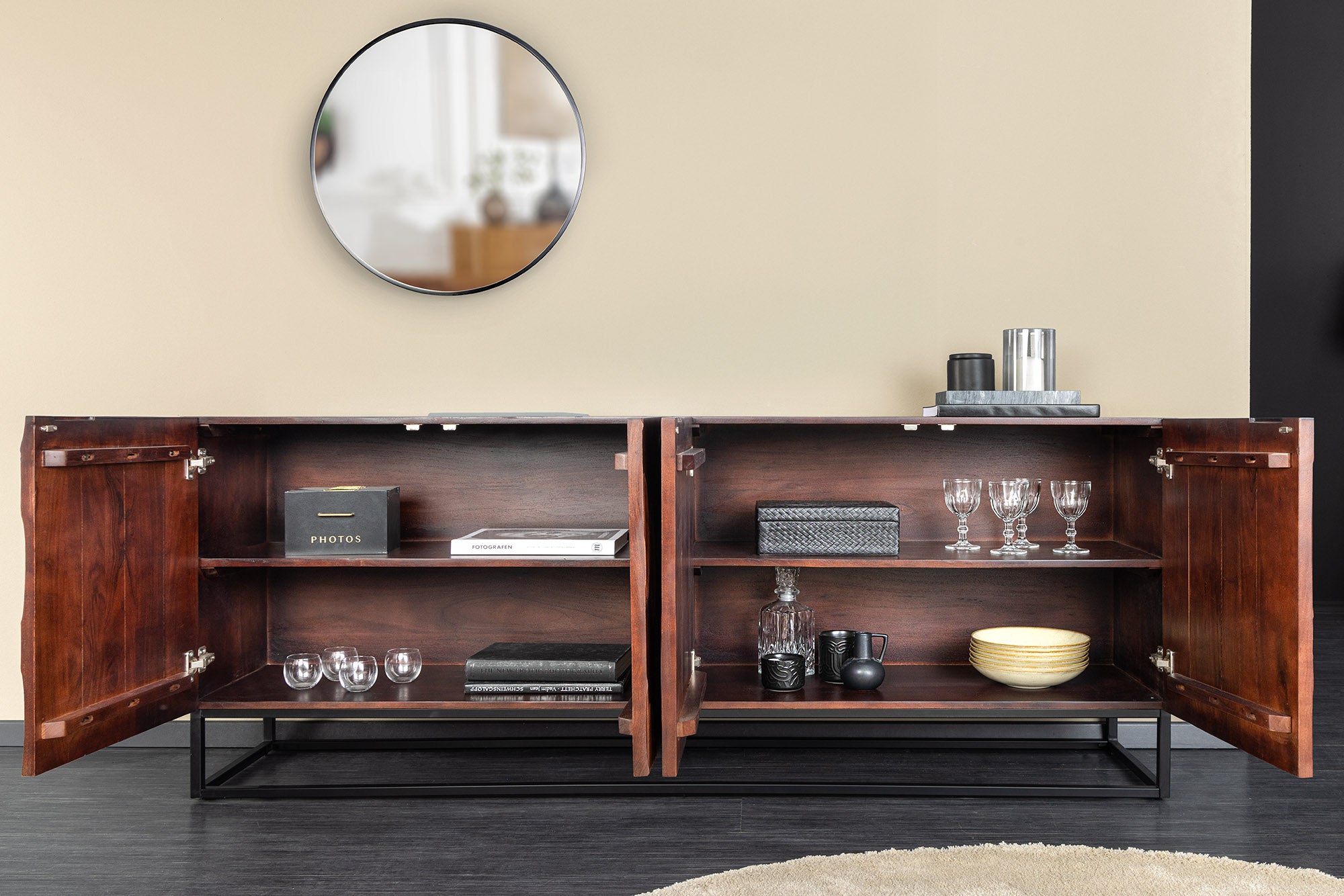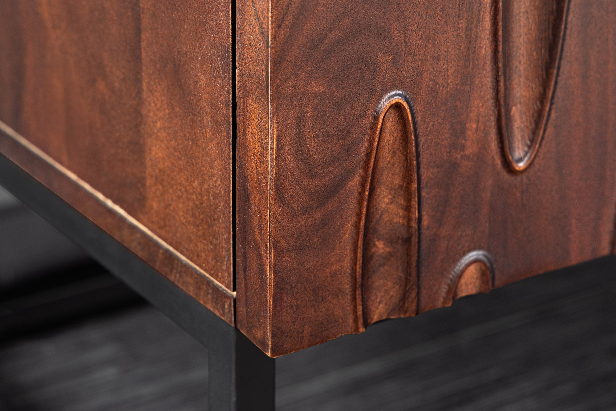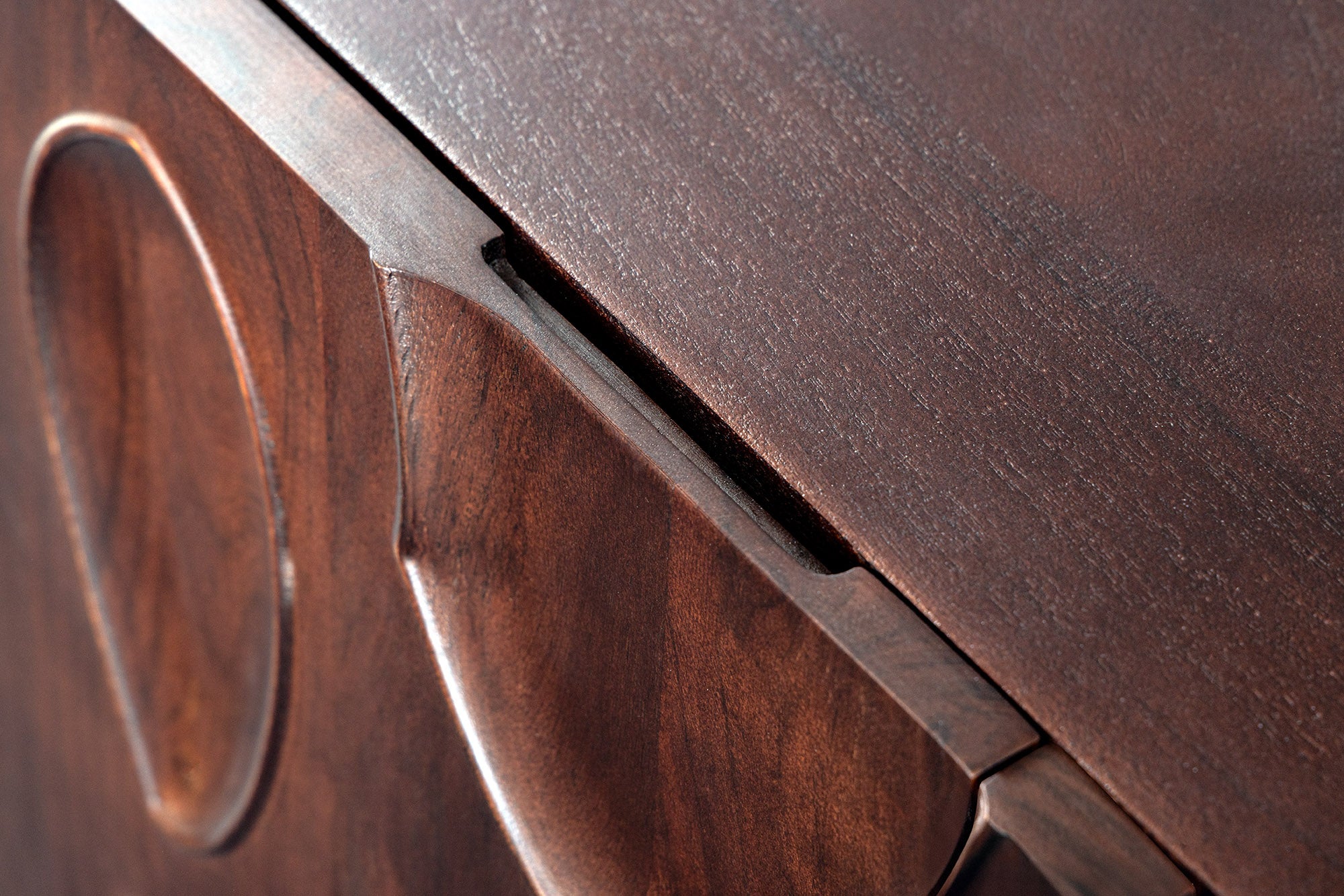 Nowoczesna komoda o bardzo charakterystycznym, designerskim wyglądzie, wykonana z litego drewna akacjowego w eleganckim odcieniu dark walnut brown. Ciemne wybarwienie podkreśla naturalne usłojenie i nadaje meblowi głębi oraz ekskluzywnego charakteru.