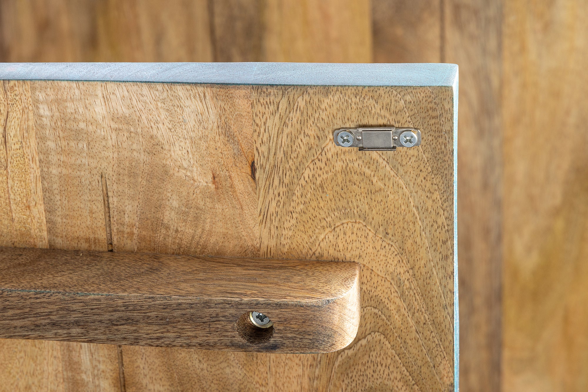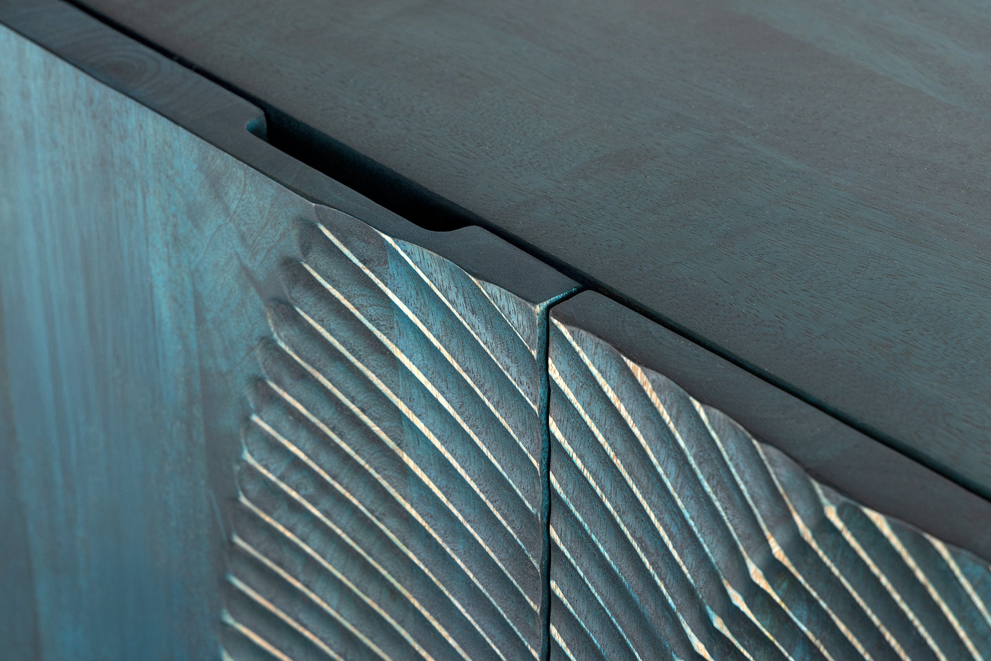 Wyjątkowa komoda o bardzo wyrazistym, dekoracyjnym charakterze, wykonana z litego drewna mango i wykończona w intensywnym kolorze turkusowym. To model, który od razu przyciąga uwagę i stanowi centralny punkt aranżacji wnętrza.