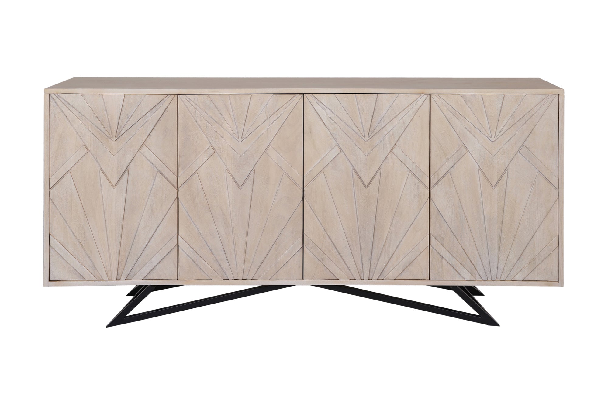 Nowoczesna komoda o lekkim, eleganckim charakterze, wykonana z drewna mango w jasnym wykończeniu typu white wash. Delikatnie bielona powierzchnia podkreśla naturalne usłojenie drewna, nadając meblowi świeży i subtelny wygląd, który dobrze rozjaśnia wnętrze.