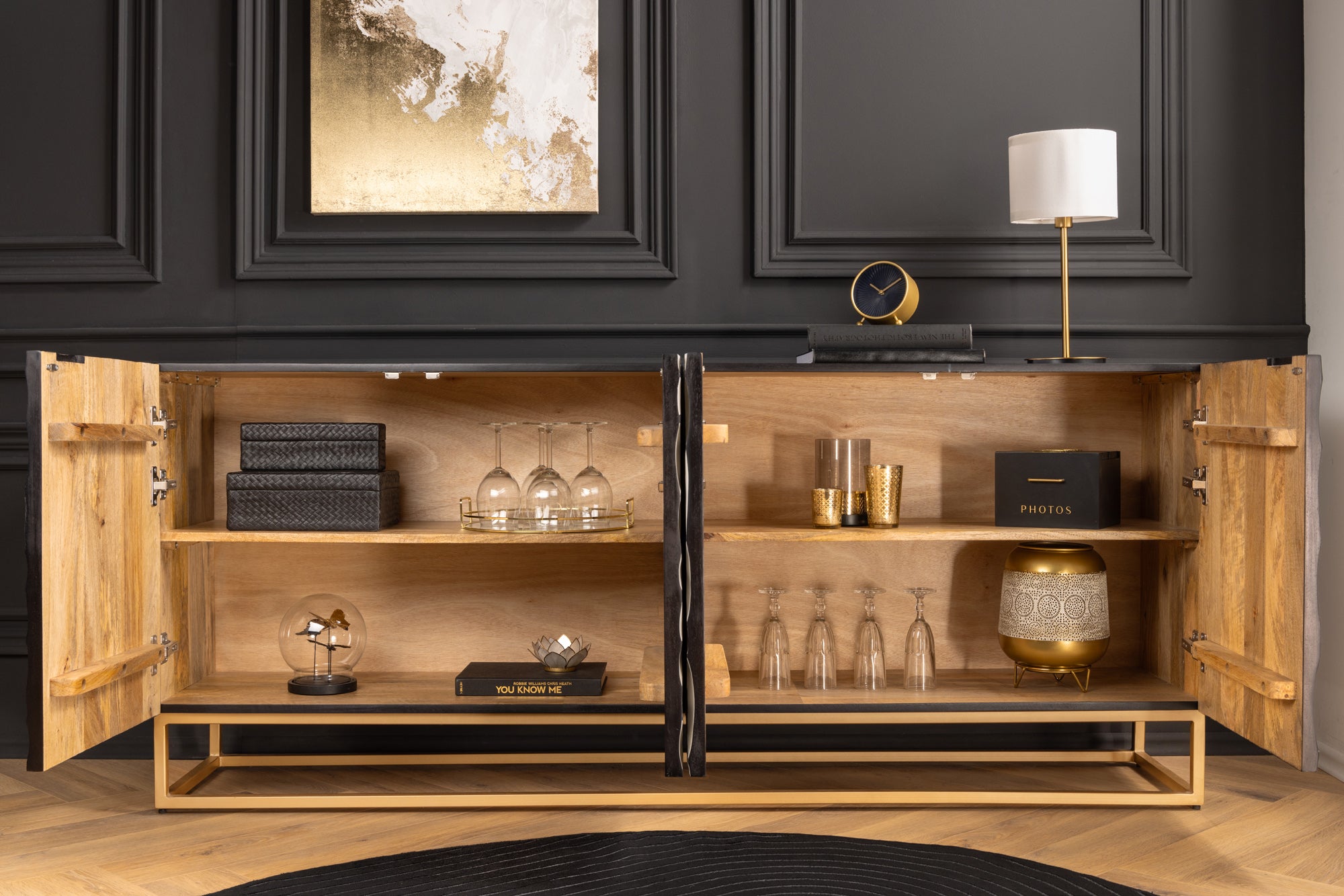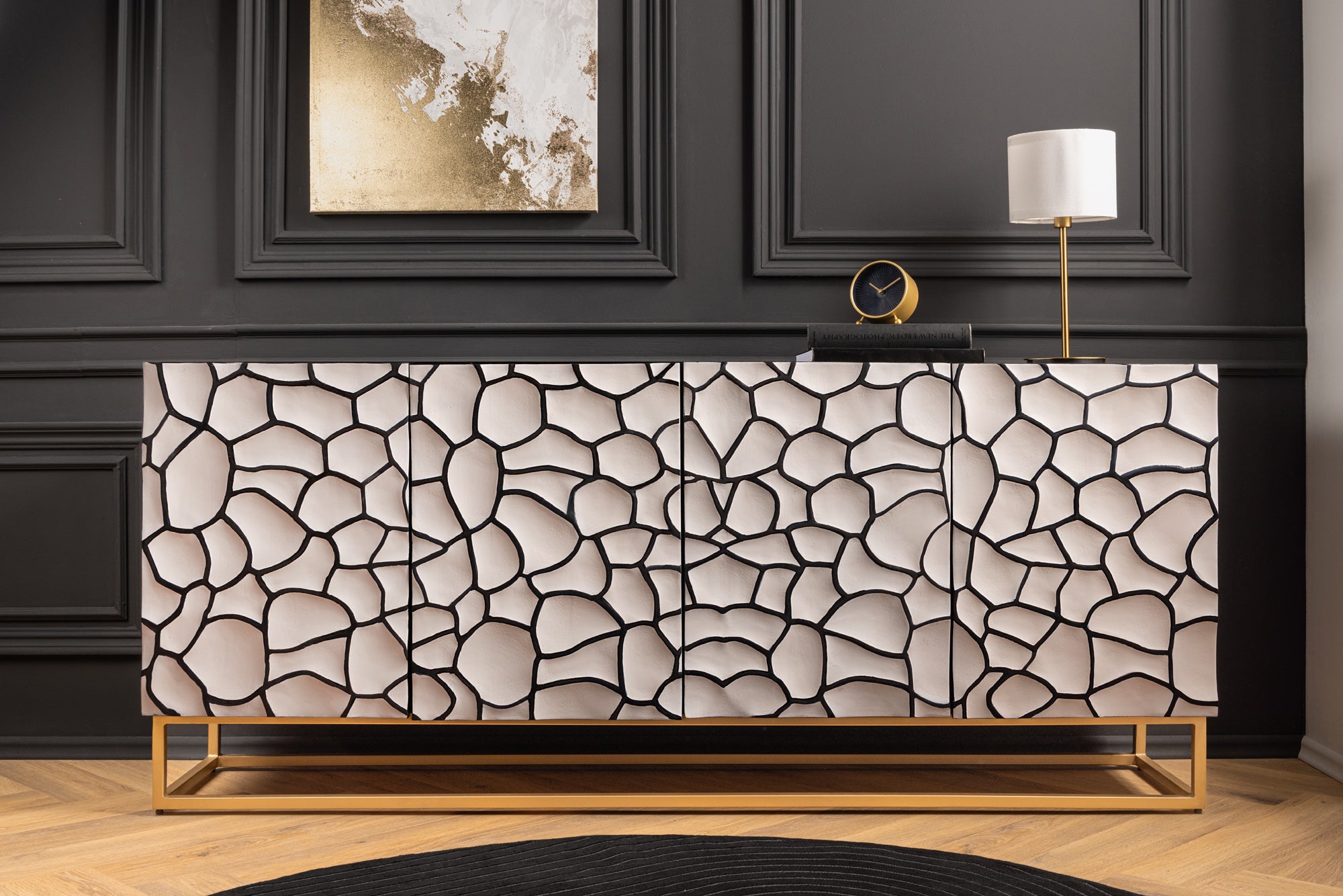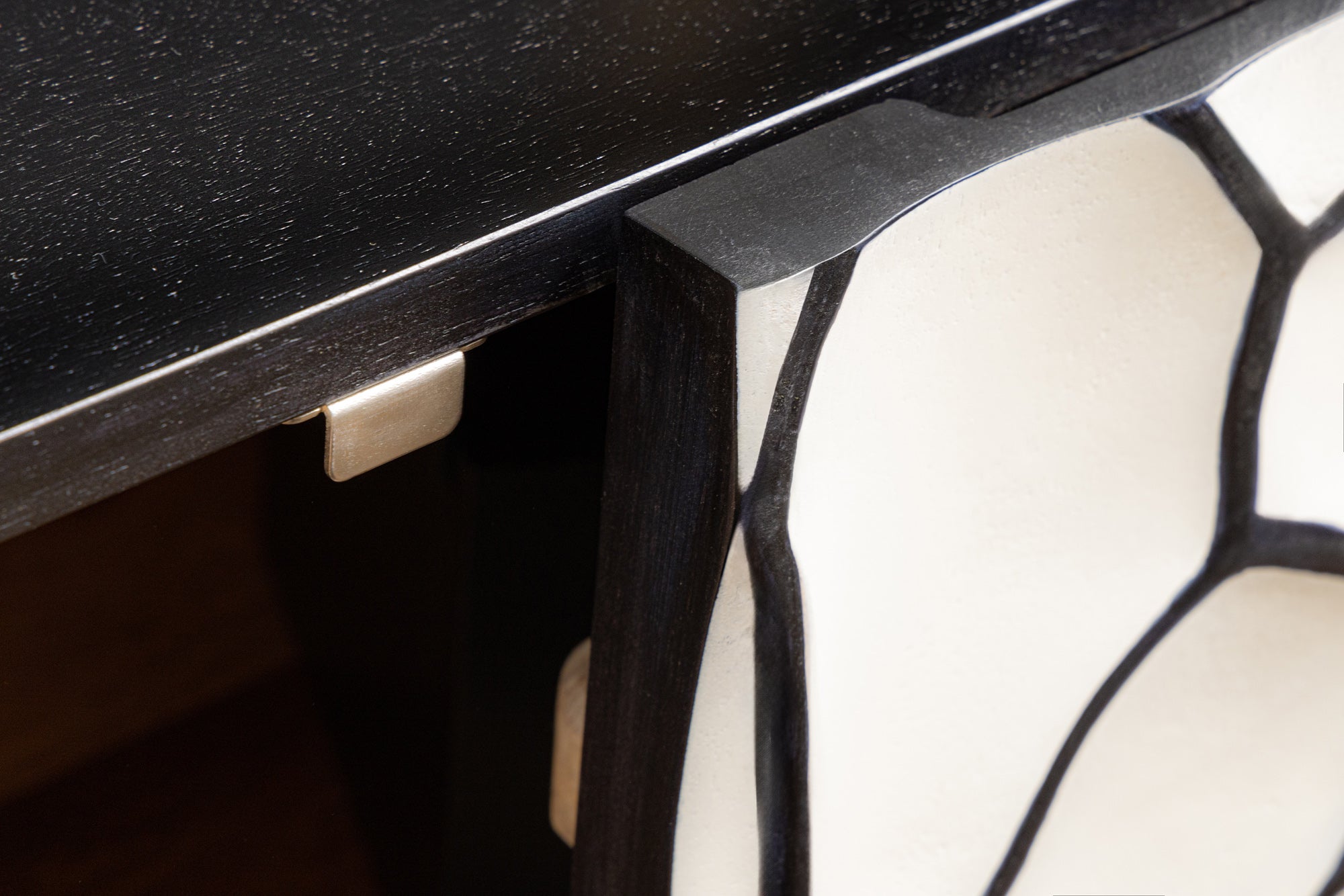 Nowoczesna komoda o bardzo wyrazistym, kontrastowym designie, wykonana z litego drewna mango. Model VULCANO wyróżnia się frontami w stylu czarno-białej mozaiki 3D, które tworzą dynamiczną, geometryczną strukturę i nadają meblowi rzeźbiarski charakter.