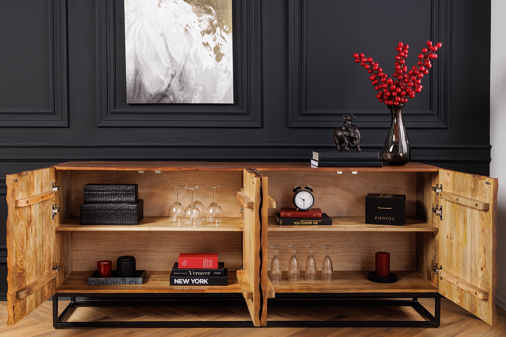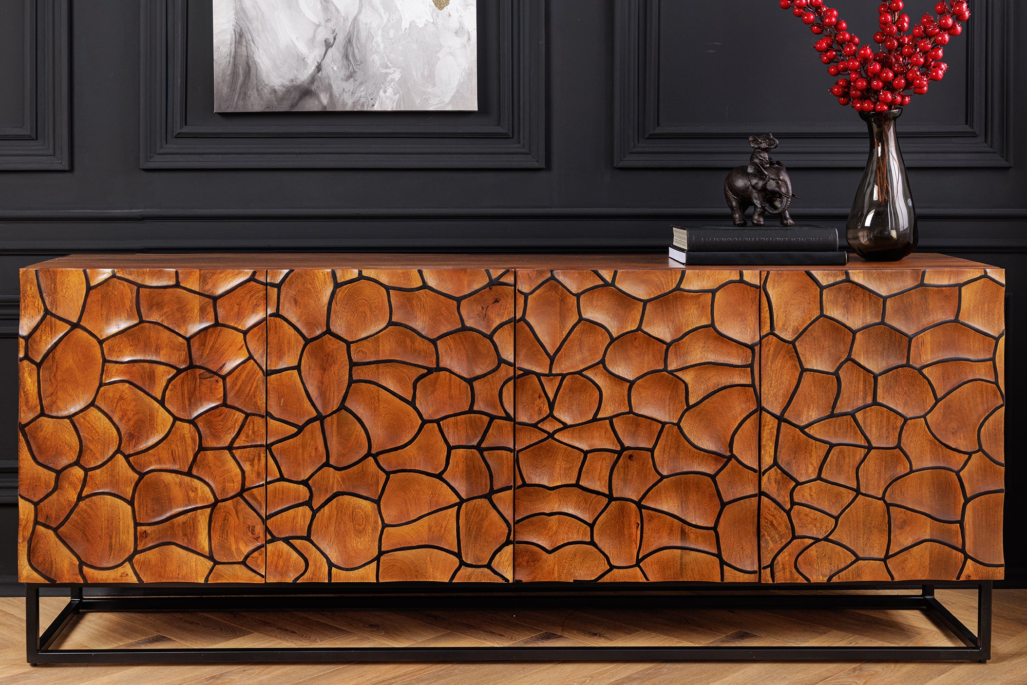 Wyrazista komoda o bardzo charakterystycznym, designerskim wyglądzie, wykonana z litego drewna mango. Model VULCANO wyróżnia się frontami z efektem mozaiki 3D, które tworzą dynamiczną, geometryczną strukturę i nadają meblowi rzeźbiarski charakter.