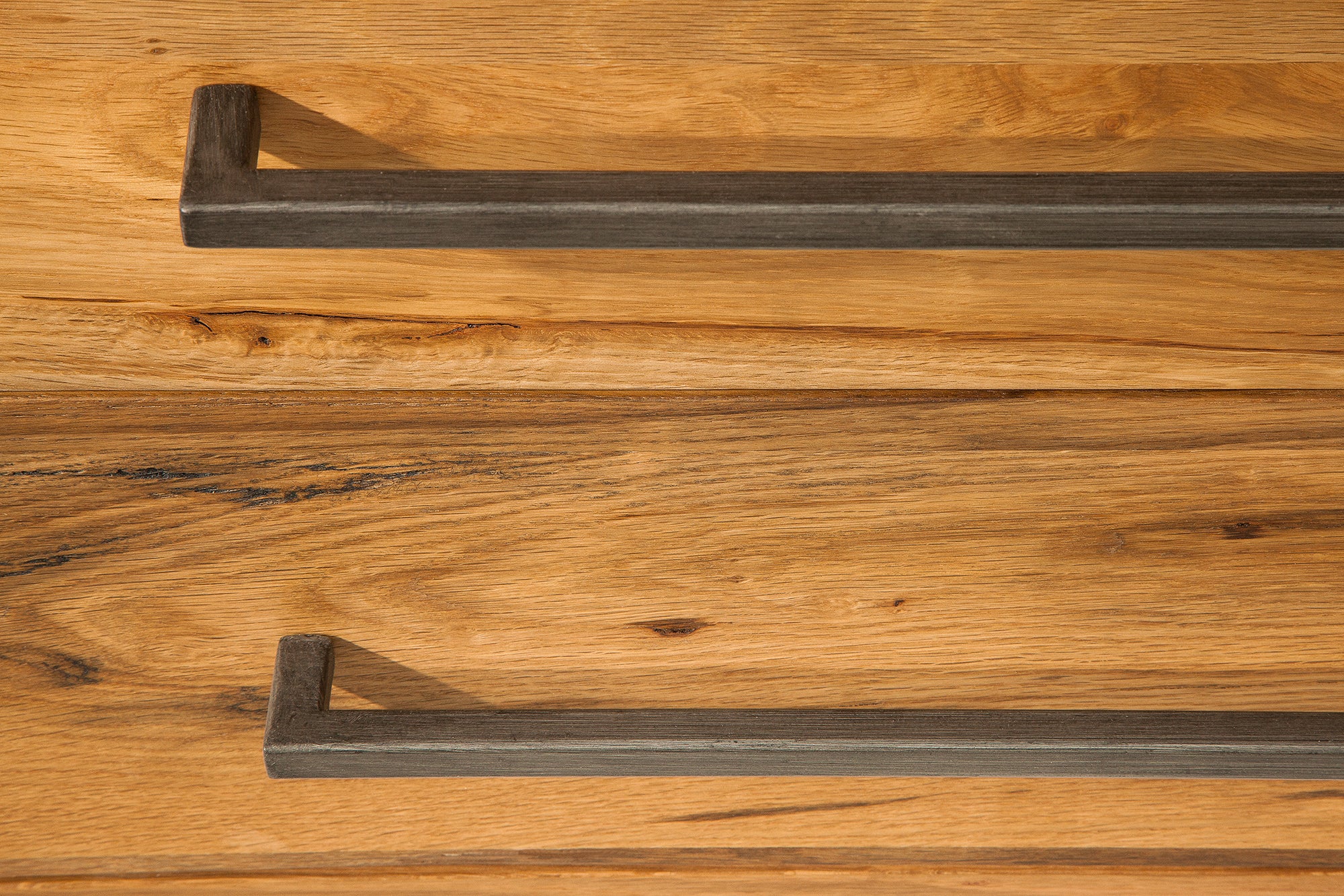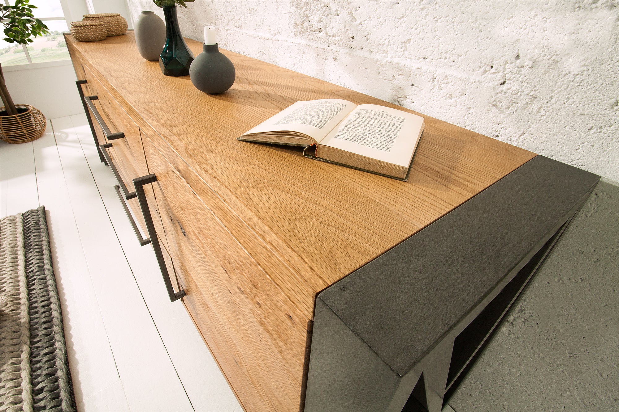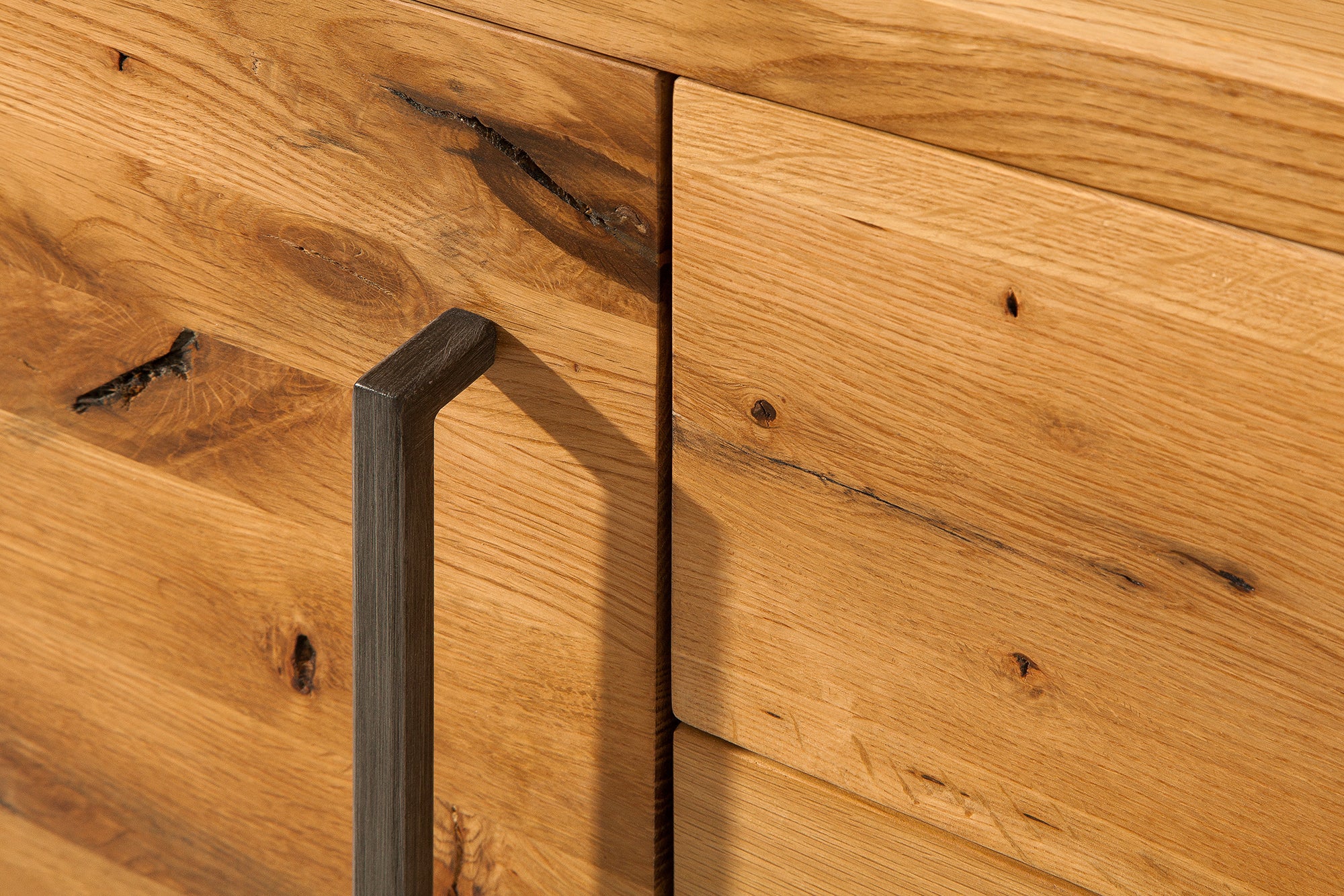 Komoda THOR 200 cm to masywny, industrialny mebel, który łączy naturalne drewno z surową, loftową formą. Front wykonany jest z litego dębu dzikiego, co nadaje całości autentyczny wygląd i wyraźny charakter. Naturalne usłojenie oraz olejowane wykończenie podkreślają strukturę drewna i sprawiają, że każdy egzemplarz jest inny.