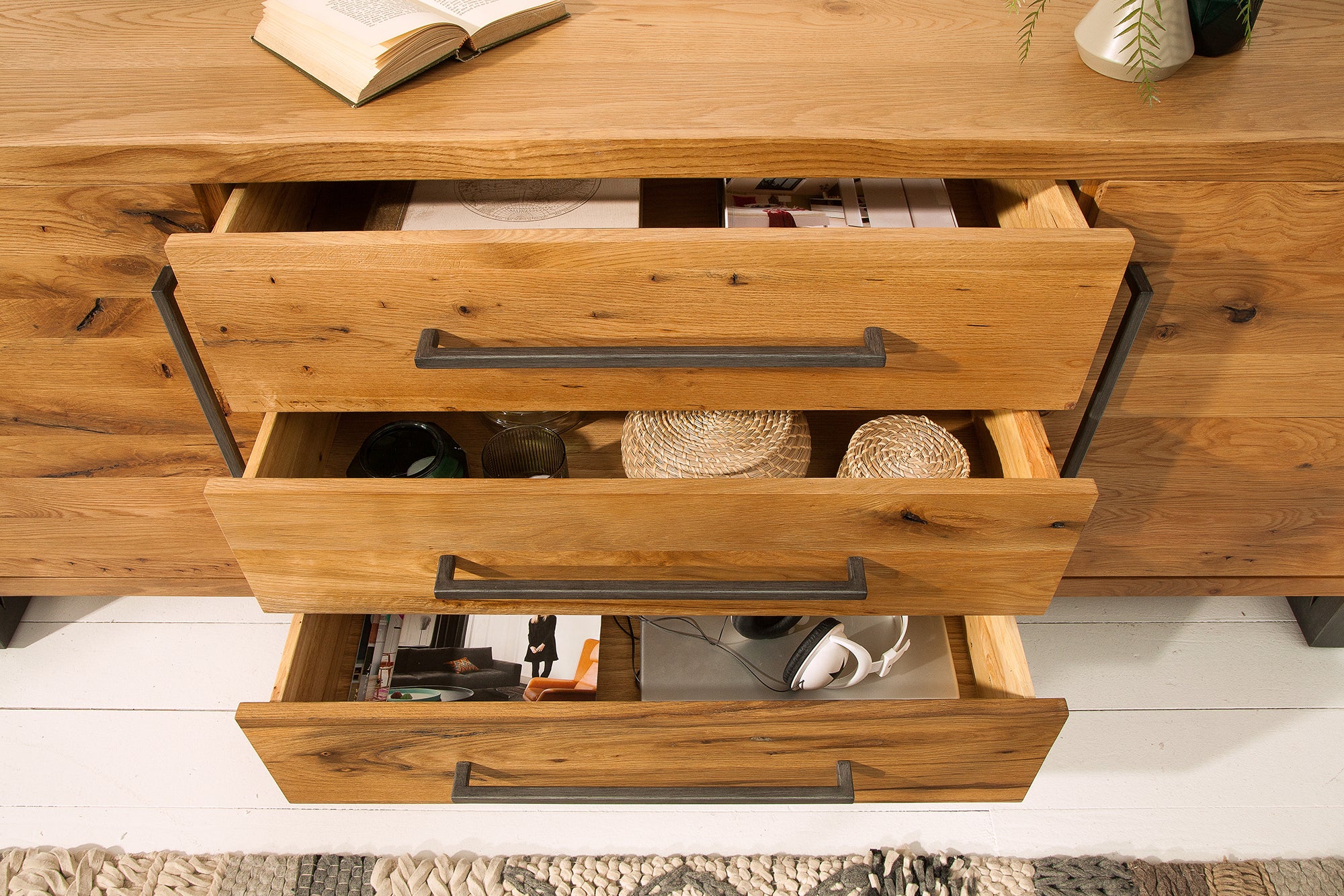 Wnętrze zostało zaprojektowane bardzo funkcjonalnie. Komoda posiada trzy szerokie szuflady oraz cztery zamykane komory, co daje dużo miejsca do przechowywania i pozwala wygodnie uporządkować różne rzeczy.