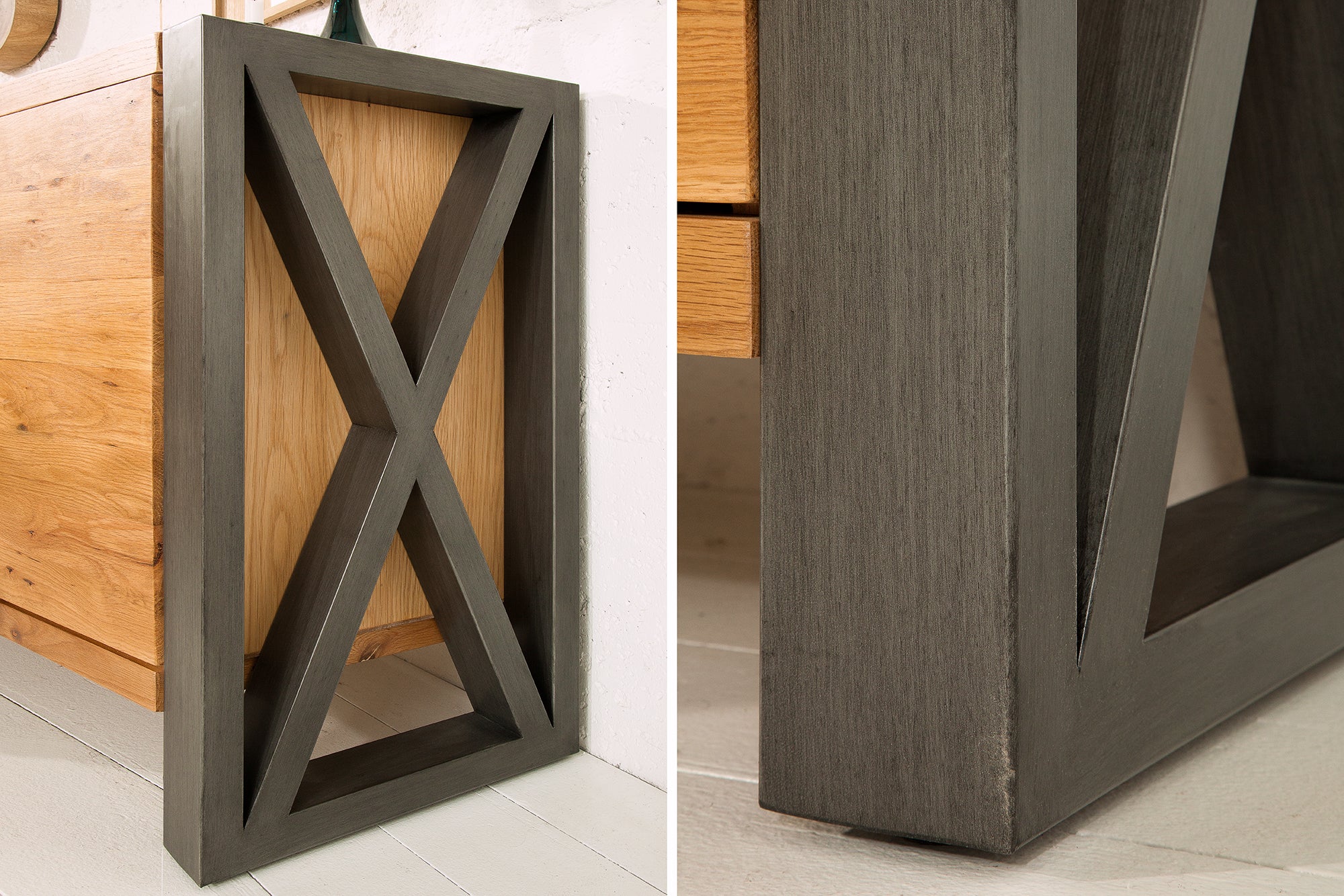 Korpus wykonano z płyty MDF pokrytej fornirem dębowym, co zapewnia stabilność konstrukcji i spójny wygląd. Całość opiera się na metalowej ramie, która nadaje meblowi industrialnego stylu i jednocześnie gwarantuje solidność.