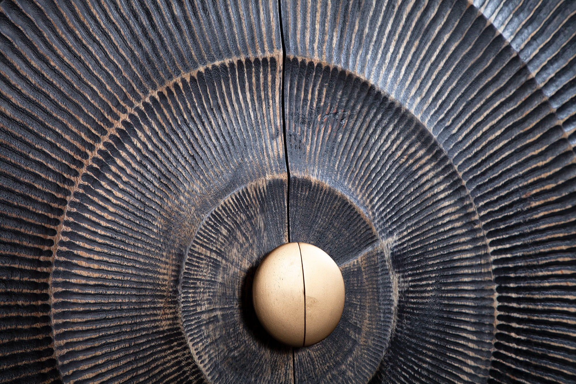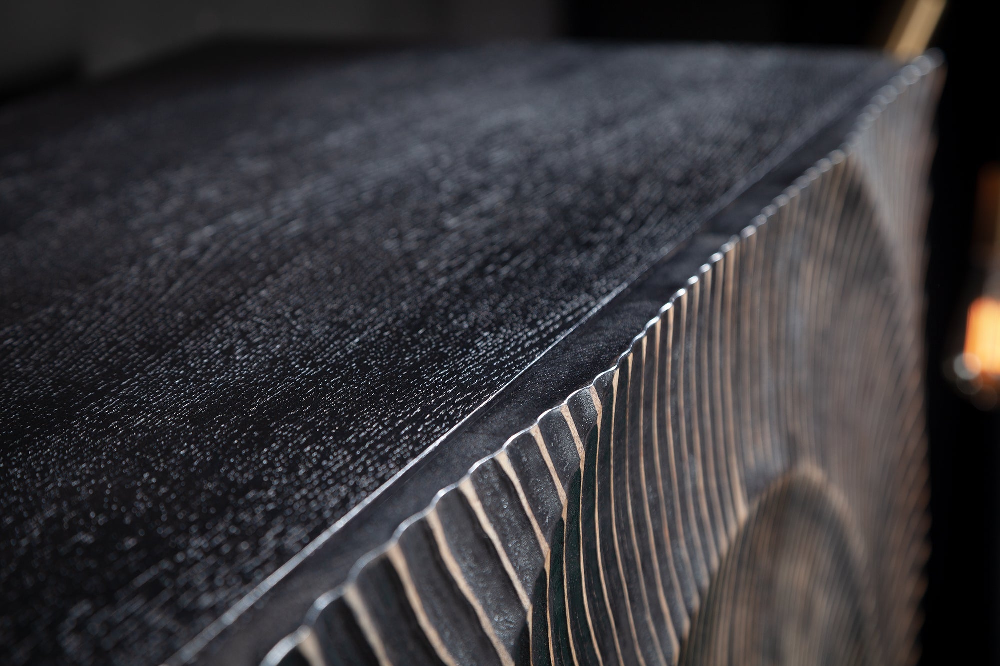 Najbardziej charakterystycznym elementem mebla są fronty zdobione efektownym, złotym ornamentem o trójwymiarowej strukturze. Ręczne wykonanie tworzy wyjątkową grę światła i cienia, dzięki czemu każdy egzemplarz jest niepowtarzalny. Połączenie czerni i złota nadaje całości styl glamour z nutą loftowej surowości, czyniąc mebel centralnym punktem aranżacji