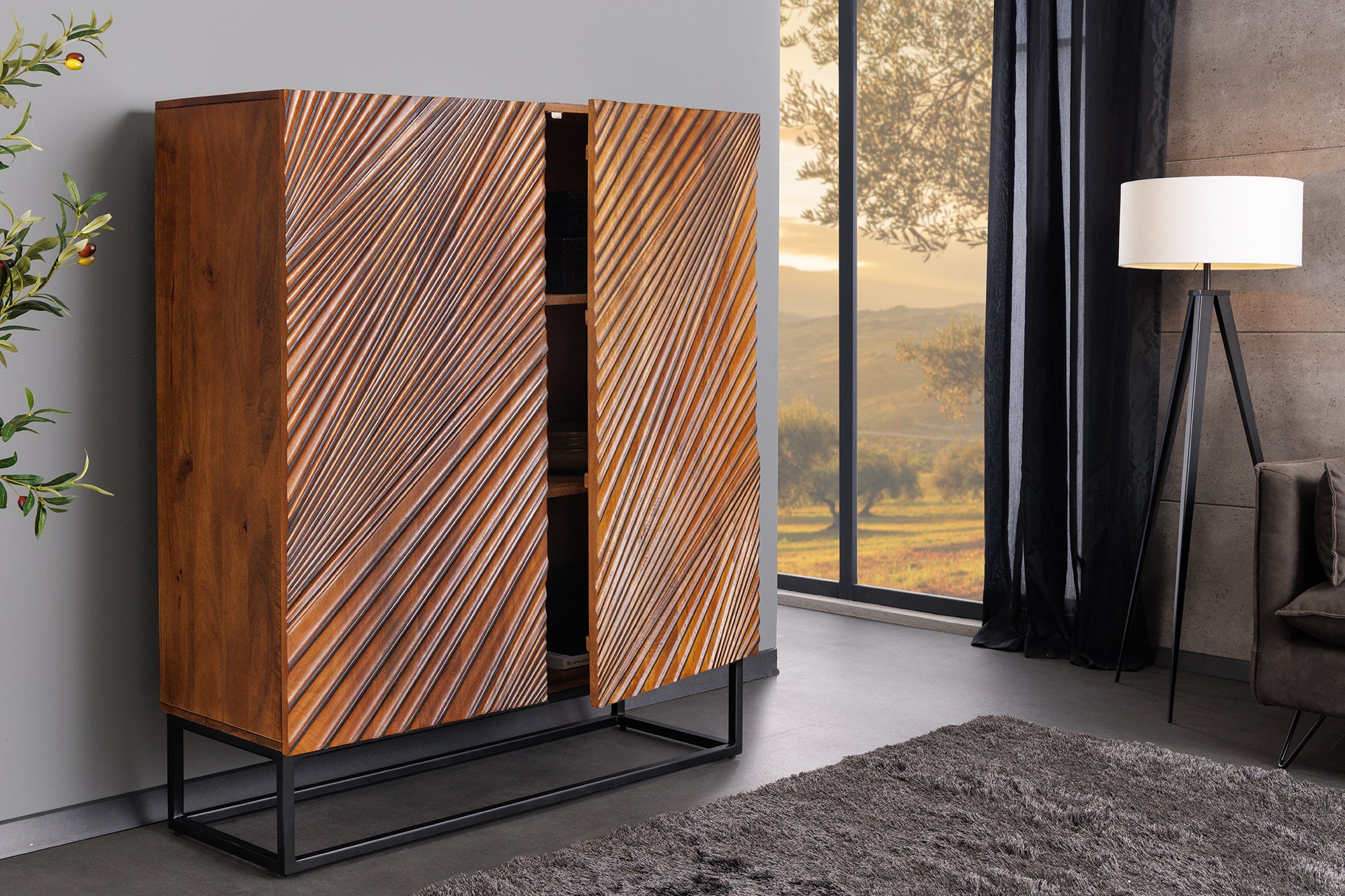 Komoda wysoka LINE ART 120 cm to nowoczesny, designerski mebel, który łączy naturalne drewno z geometrycznym wzornictwem. Wykonana z litego drewna mango, wyróżnia się ciepłym kolorem i wyraźnym usłojeniem, które nadają wnętrzu naturalny charakter.