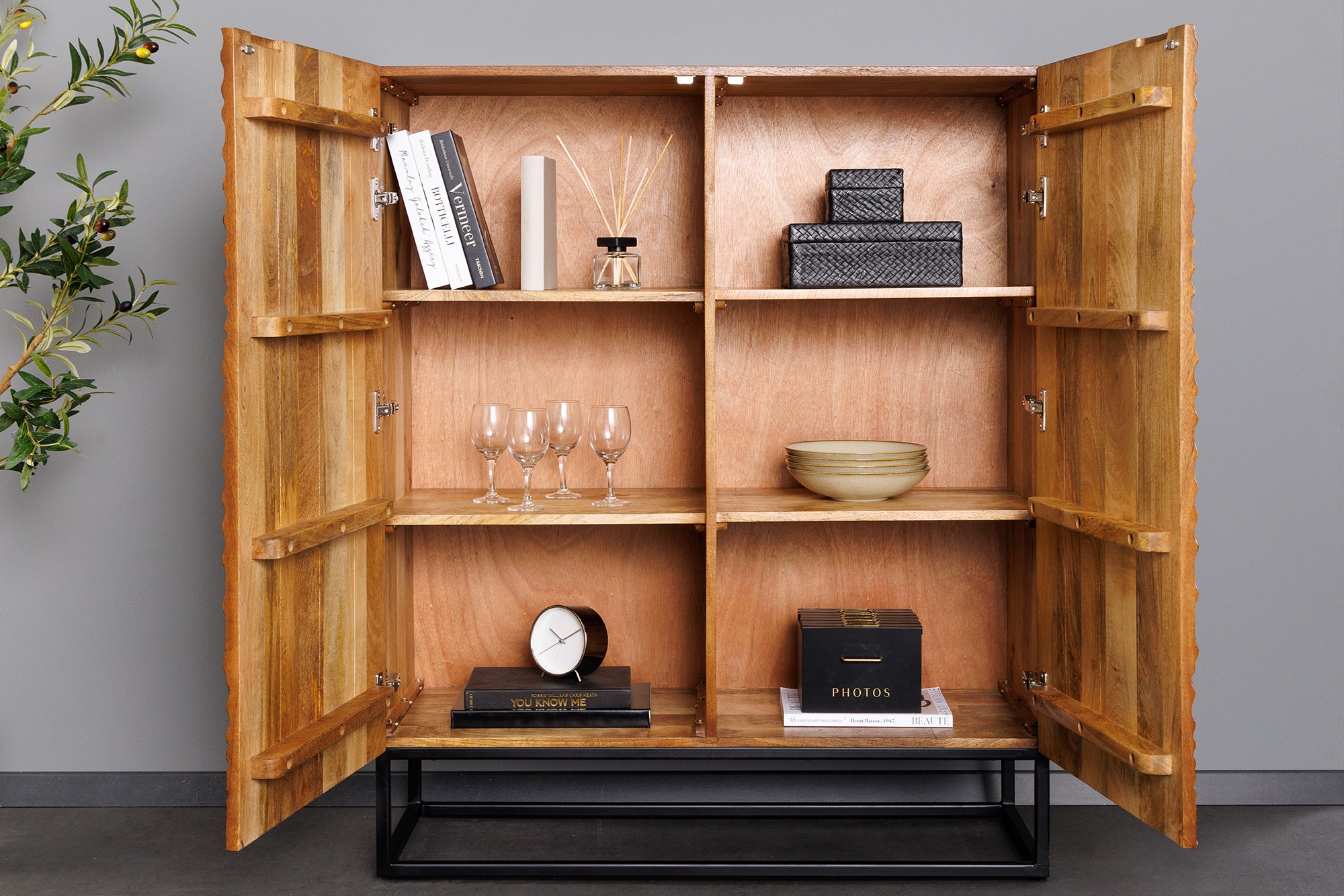 Wnętrze zostało zaprojektowane funkcjonalnie. Za drzwiami znajdują się pojemne przestrzenie z półkami, które umożliwiają wygodne przechowywanie różnych przedmiotów.