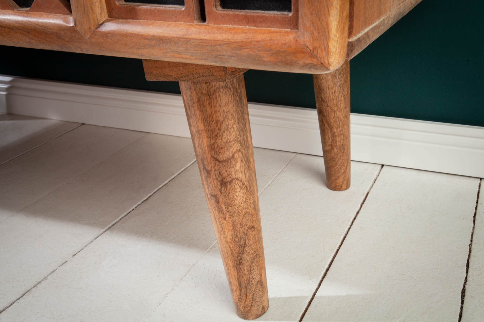Najbardziej charakterystycznym elementem mebla są fronty zdobione ręcznie wykonanym wzorem inspirowanym ornamentyką Orientu. Jasne rzeźbienia na ciemnym tle tworzą efekt głębi i przyciągają uwagę, dzięki czemu komoda staje się centralnym punktem aranżacji. Całość uzupełniają dekoracyjne, drewniane uchwyty, które podkreślają rzemieślniczy charakter mebla.