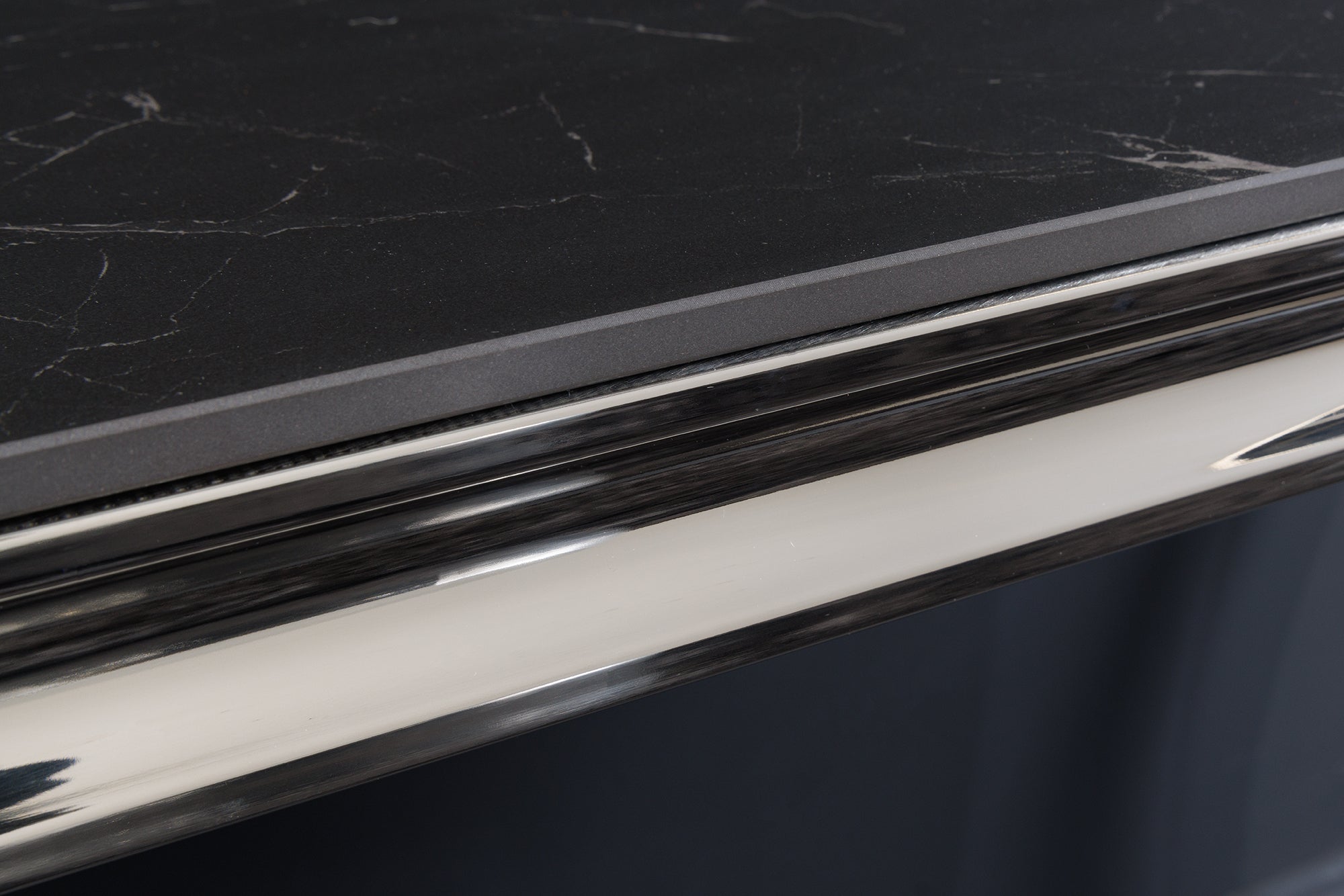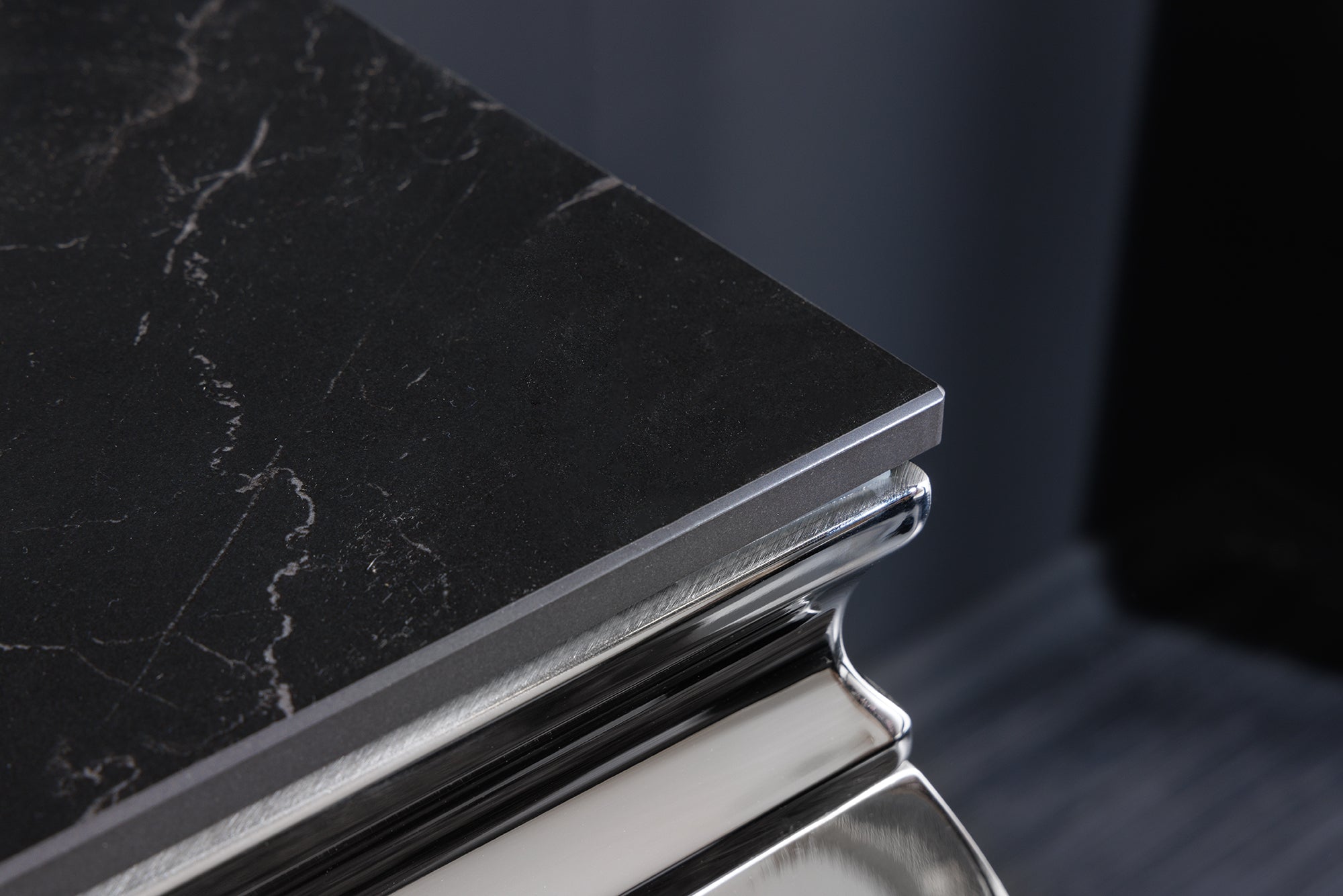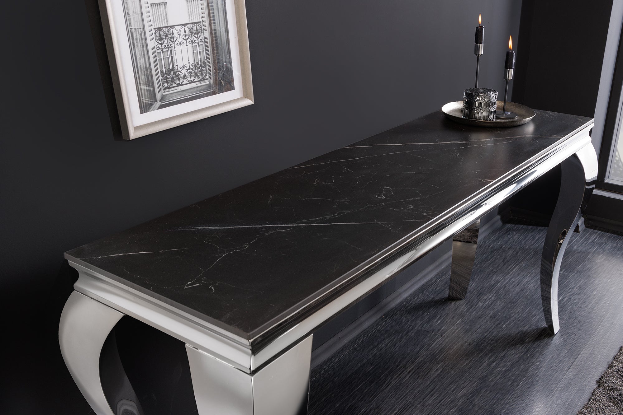 Podstawa została wykonana z polerowanej stali nierdzewnej w chromowanym wykończeniu. Charakterystyczne, lekko wygięte nogi nadają meblowi luksusowy wygląd i sprawiają, że konsola staje się efektownym elementem dekoracyjnym wnętrza. Połączenie kamiennego blatu z błyszczącą metalową konstrukcją idealnie pasuje do aranżacji glamour, nowoczesnych oraz art déco.