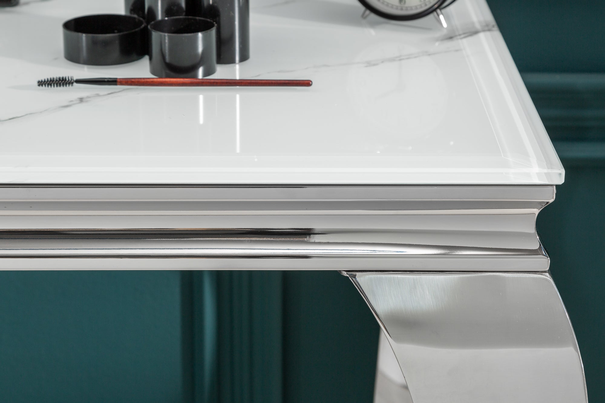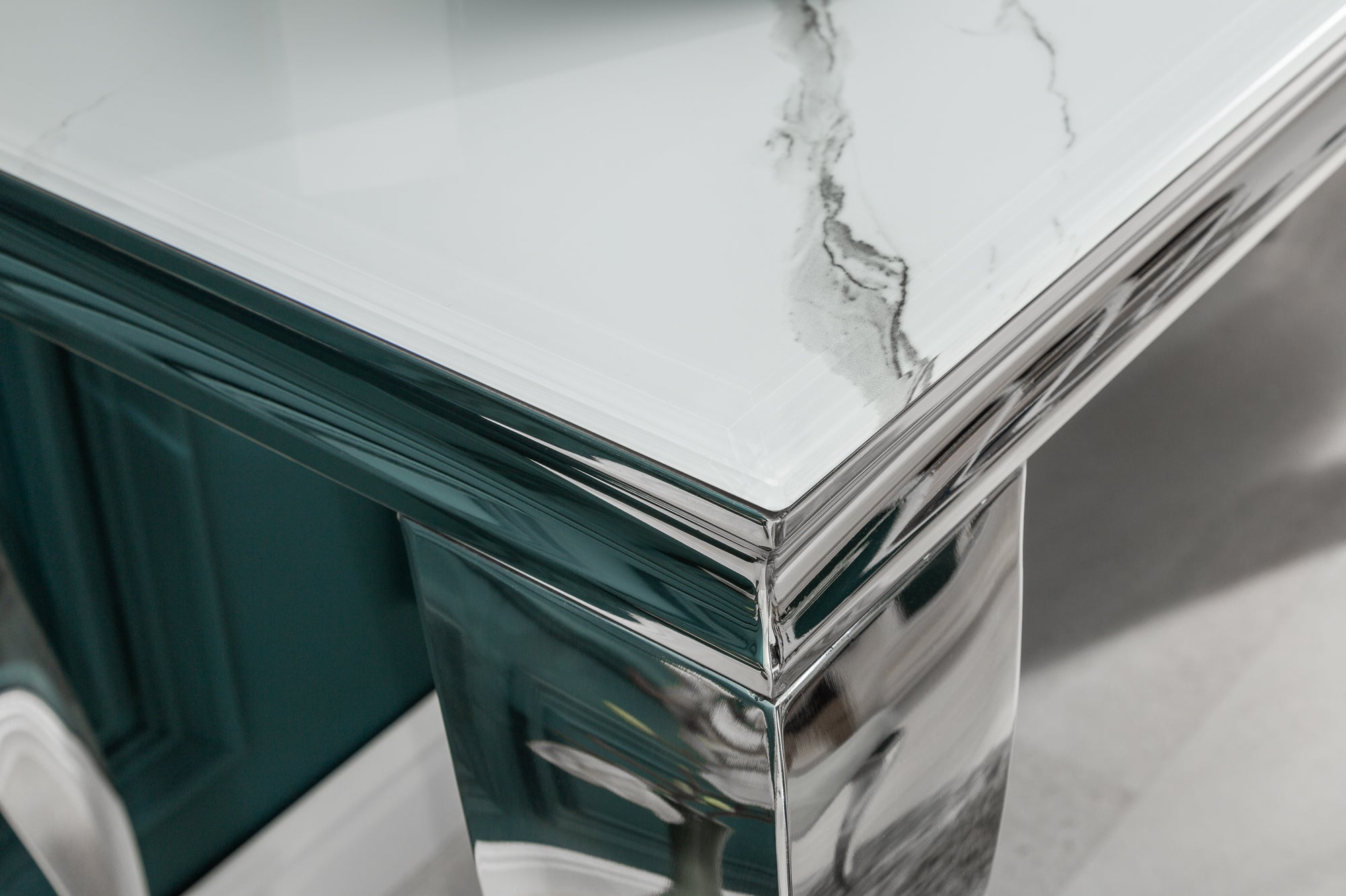Elegancka konsola o nowoczesnym, dekoracyjnym charakterze. Blat wykonany z hartowanego szkła z wykończeniem imitującym marmur nadaje meblowi luksusowy wygląd, a jednocześnie zapewnia trwałość i odporność na codzienne użytkowanie. Konstrukcja oparta na metalowej ramie o połyskującym wykończeniu podkreśla styl glamour i nadaje całości lekkości.