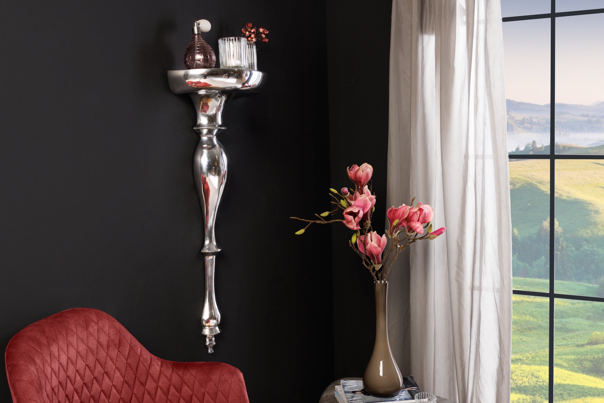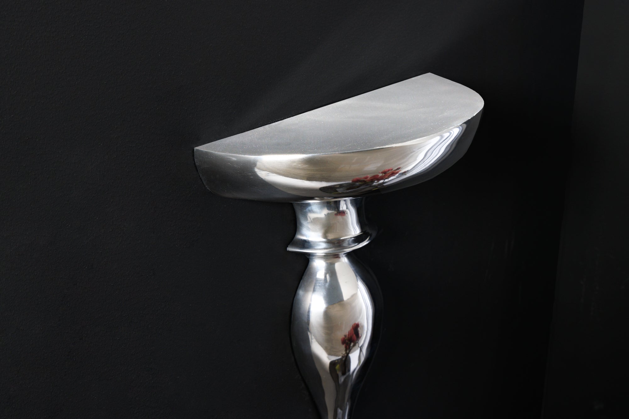 Konsola ścienna BAROCK SCALA 80 cm to efektowny element dekoracyjny inspirowany klasycznym stylem barokowym. Wykonana z polerowanego aluminium, wyróżnia się eleganckim, srebrnym wykończeniem oraz bogato zdobioną, rzeźbioną formą.