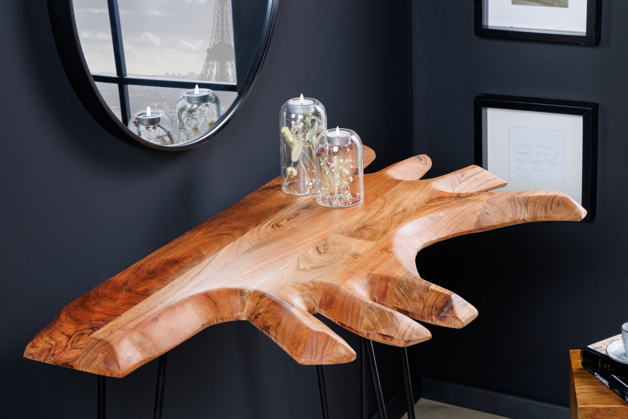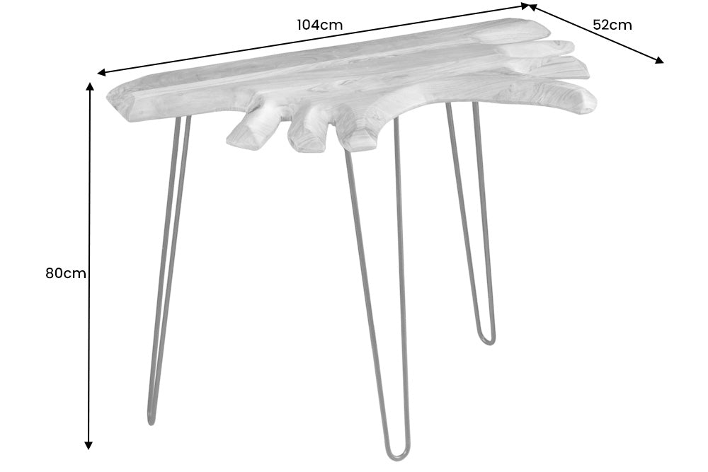 Konsola marki Invicta Interior wykonana z litego drewna akacjowego o naturalnym usłojeniu i zróżnicowanej kolorystyce. Masywny blat o grubości 38 mm podkreśla solidny charakter mebla, a każdy egzemplarz posiada indywidualny wygląd wynikający z właściwości drewna.