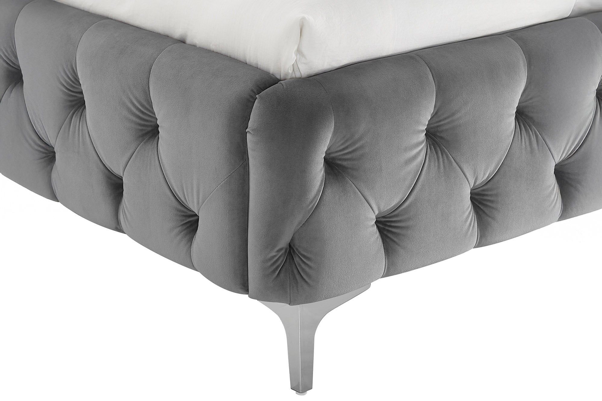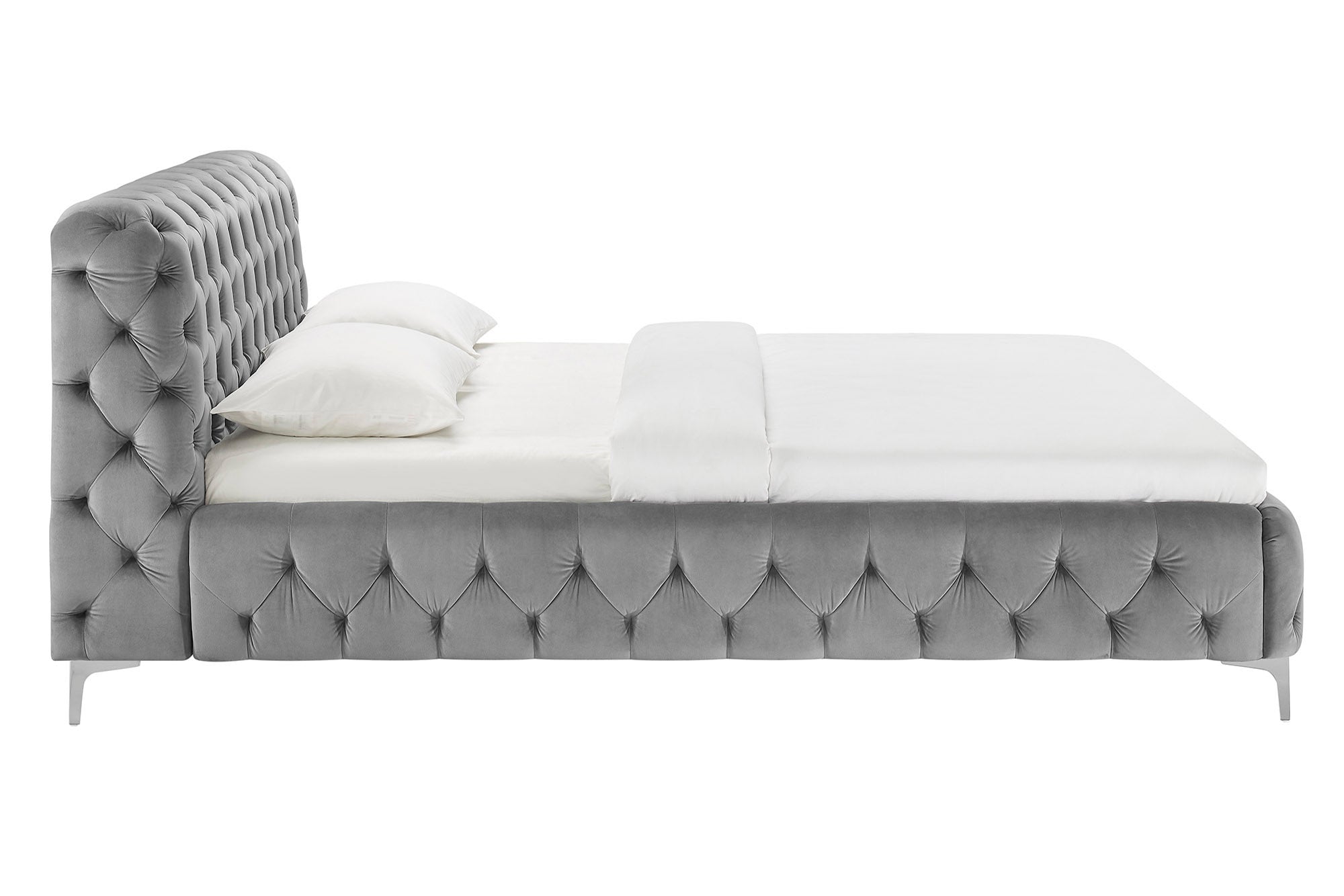 Łóżko MODERN BAROCK to efektowny model tapicerowany, który łączy elegancję stylu Chesterfield z dekoracyjnym charakterem inspirowanym stylem barokowym. Szara, welurowa tapicerka nadaje mu luksusowy wygląd, a srebrne metalowe nogi podkreślają elegancki styl glamour.