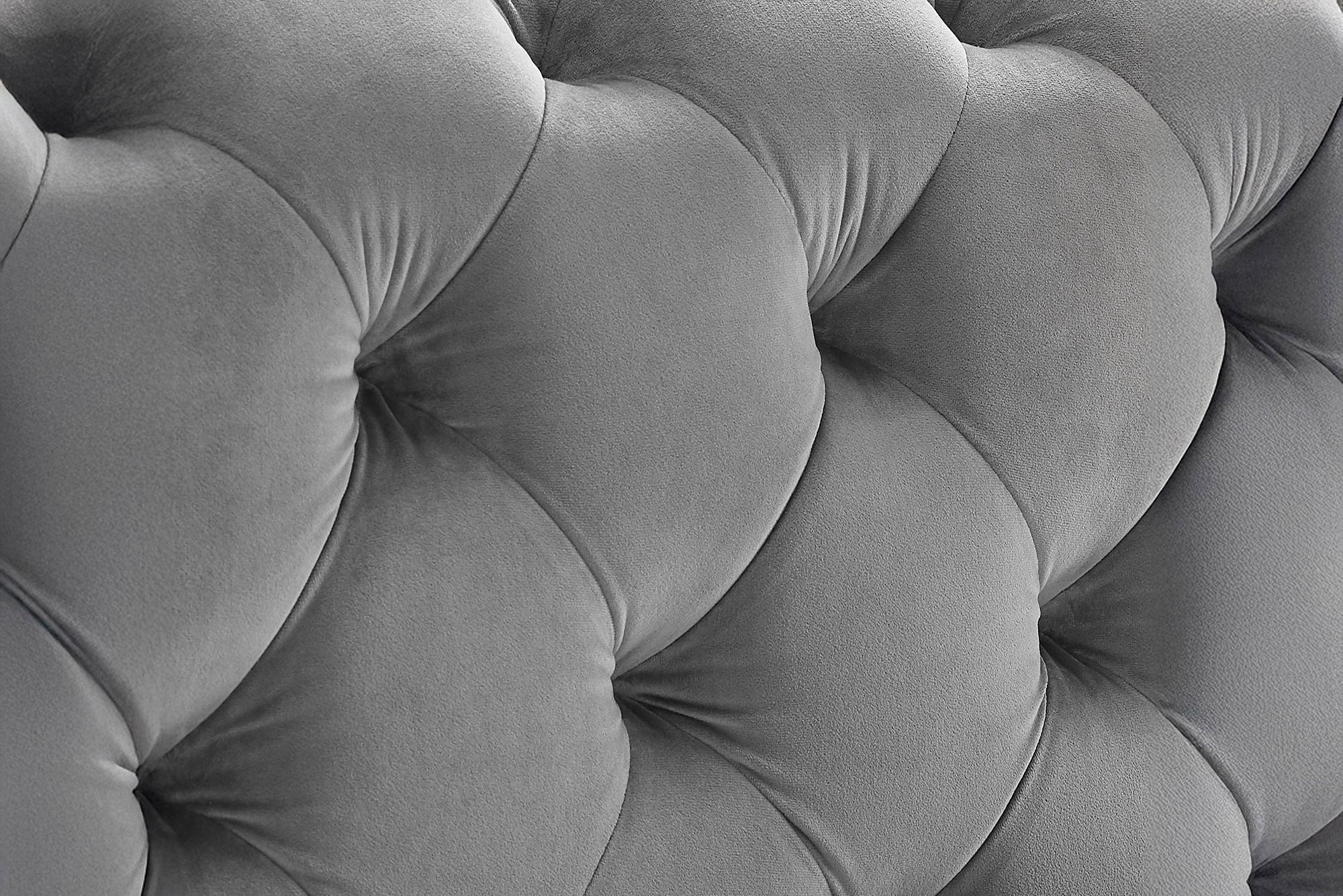 Łóżko MODERN BAROCK 180 × 200 cm to propozycja dla osób, które szukają wyrazistego i eleganckiego mebla do sypialni. Połączenie szarego weluru, pikowania Chesterfield, srebrnych nóg i dekoracyjnej formy sprawia, że model może stać się centralnym punktem aranżacji wnętrza.