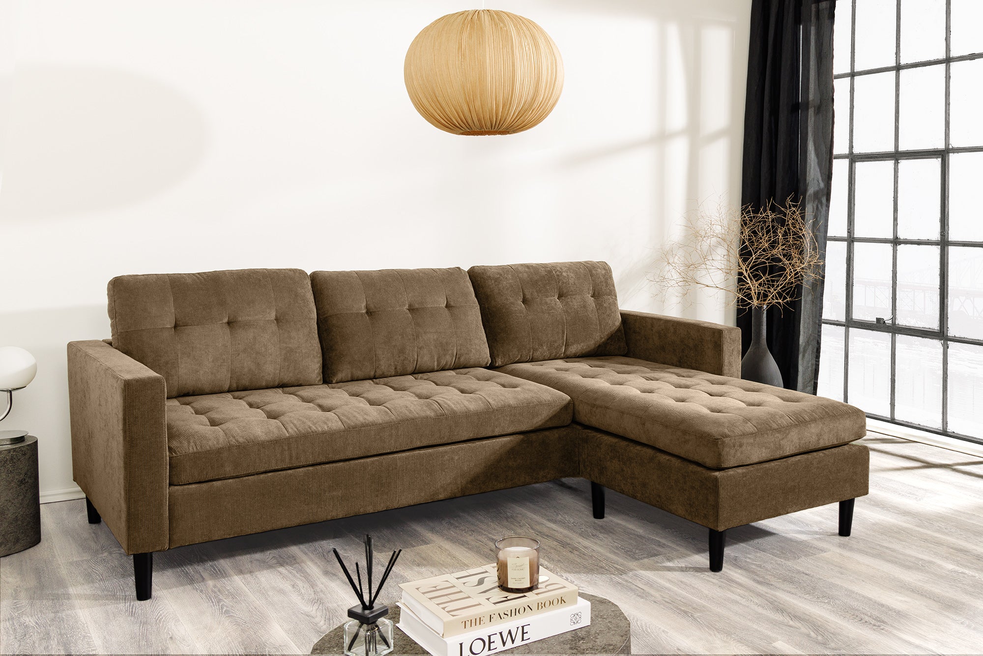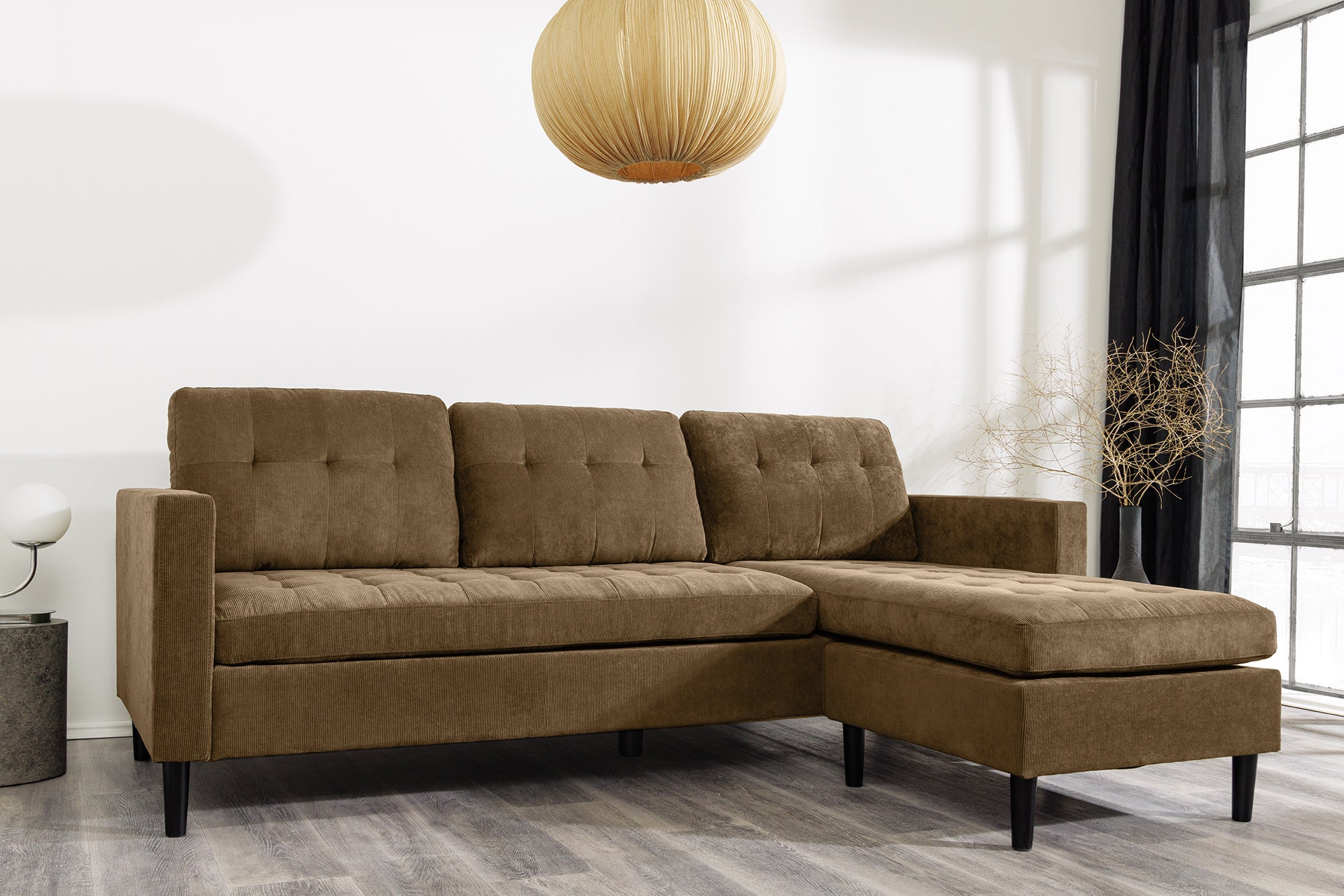 Narożnik STOCKHOLM to wygodny, 3-osobowy model wypoczynkowy o nowoczesnej i przytulnej formie. Tapicerka typu cord / sztruks w kolorze jasnobrązowym nadaje mu ciepły, naturalny charakter, dzięki czemu dobrze pasuje do salonów urządzonych w stylu nowoczesnym, skandynawskim, japandi, loftowym lub przytulnym.